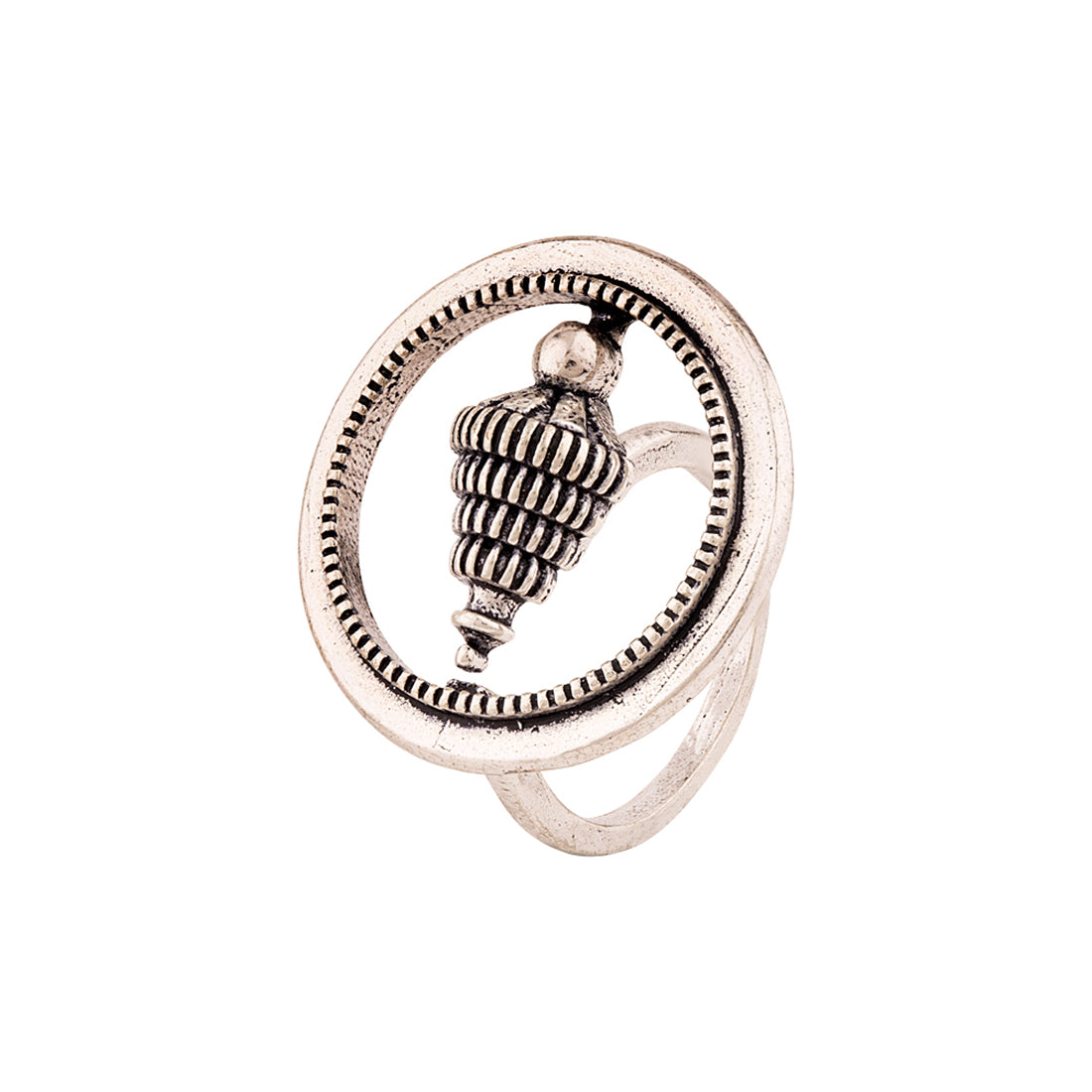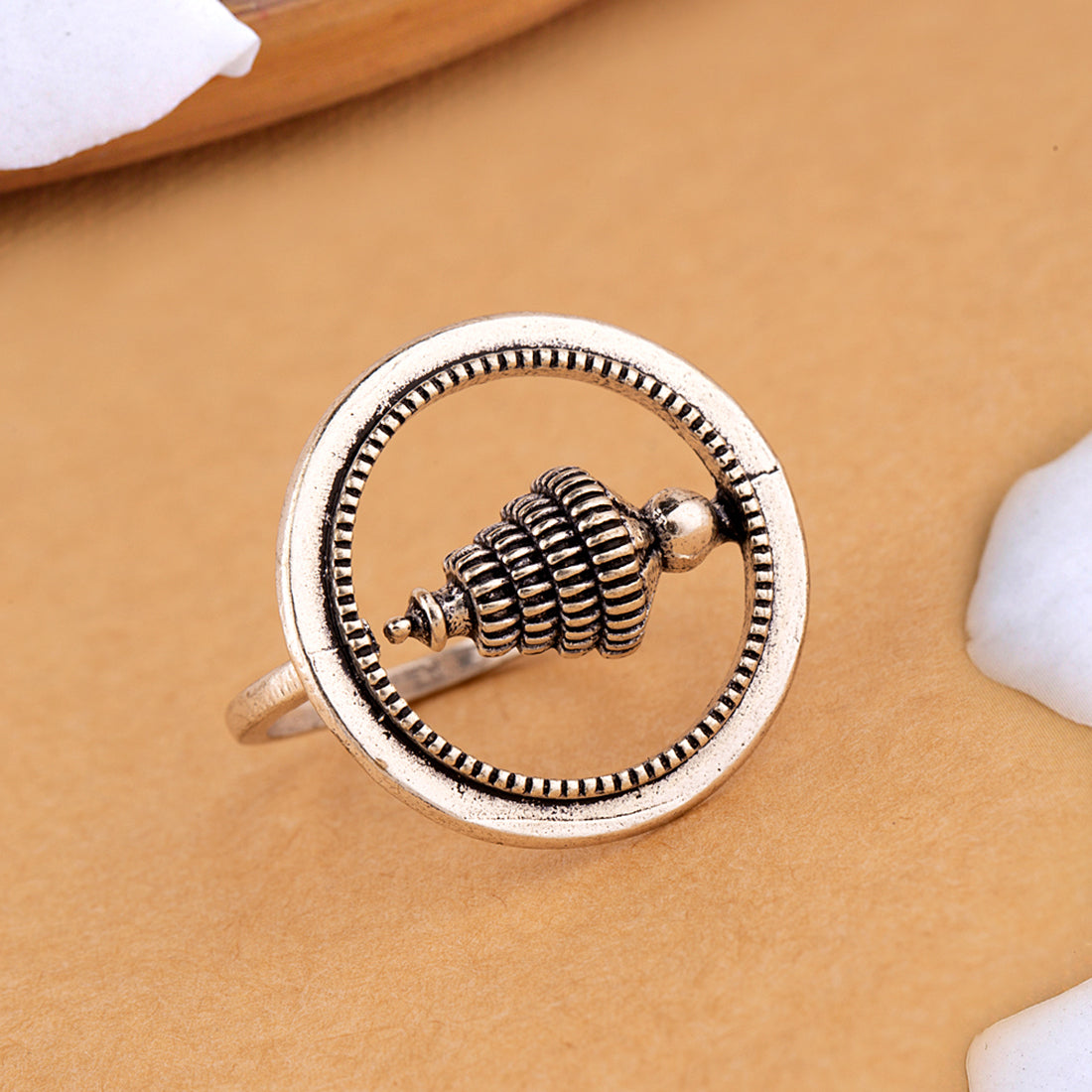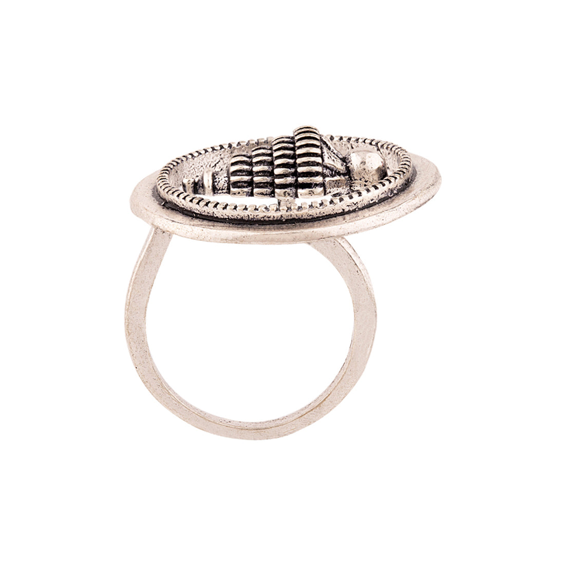Brass Aztec inspired statement ring with oxidised silver plating. Pair with Indo-Western attire. This piece of jewelry comes with the Voylla assurance of quality and durability.