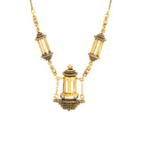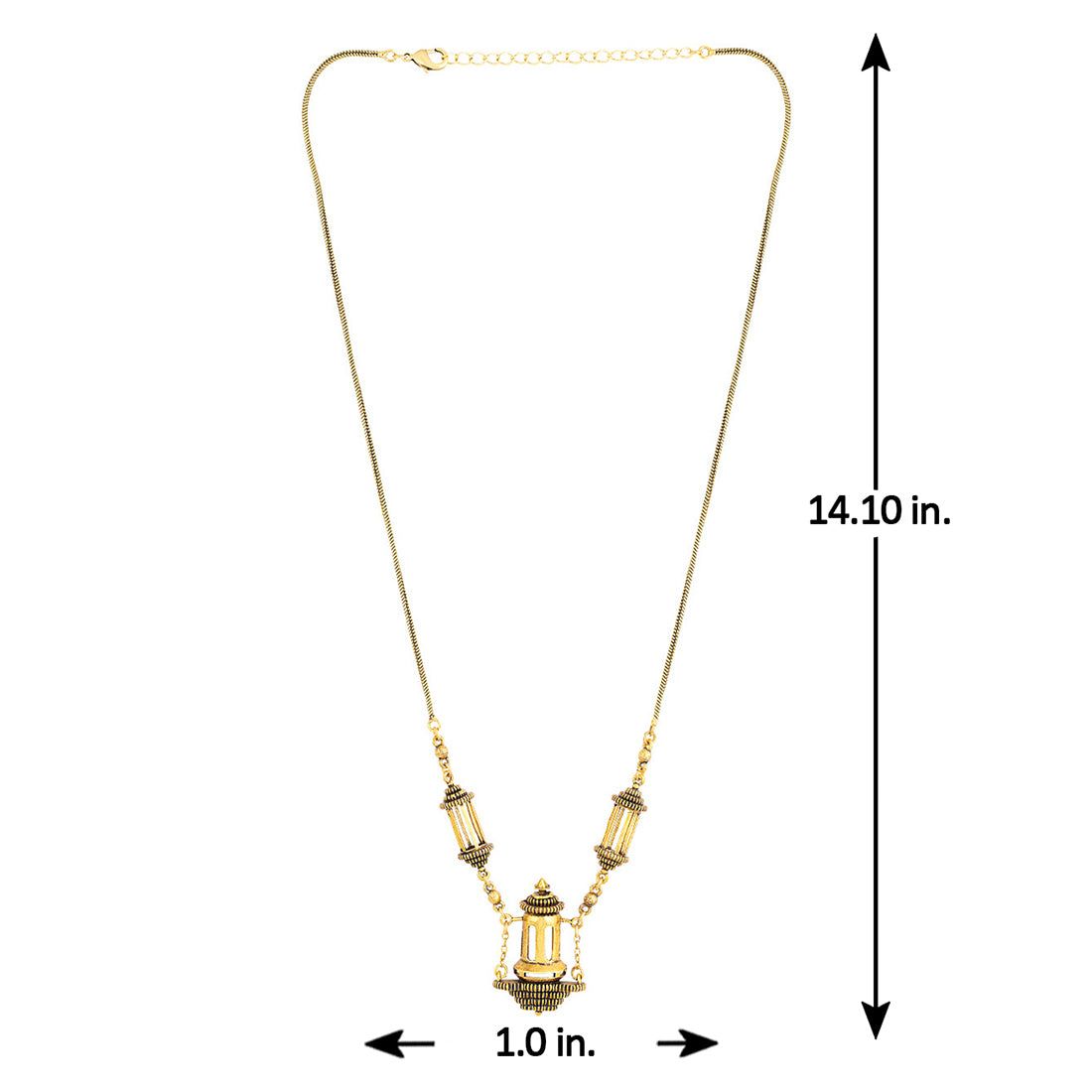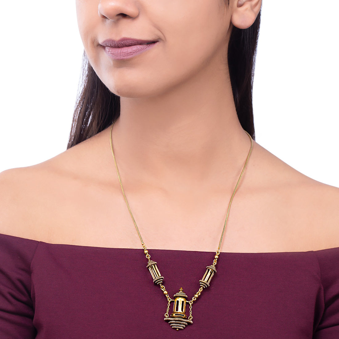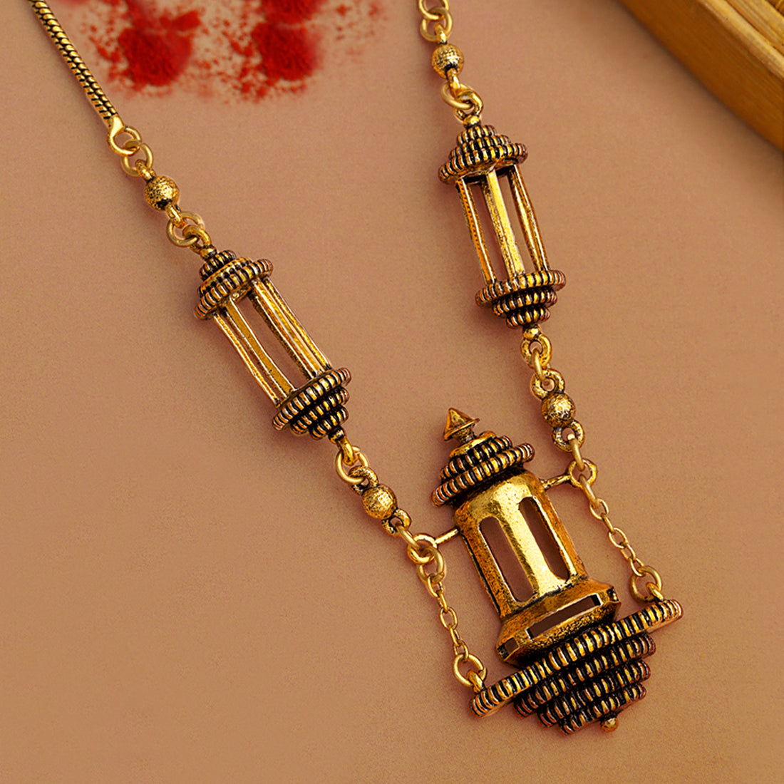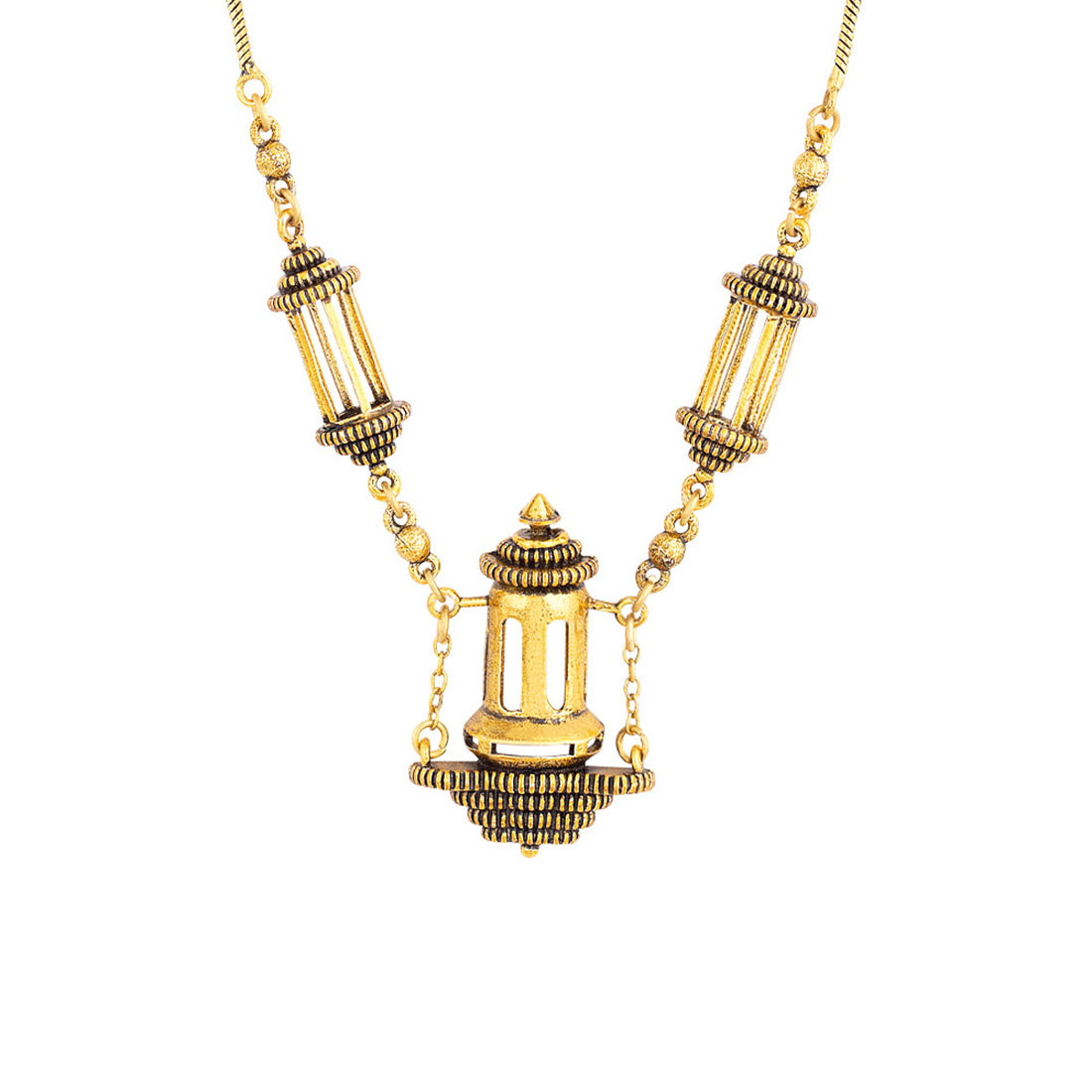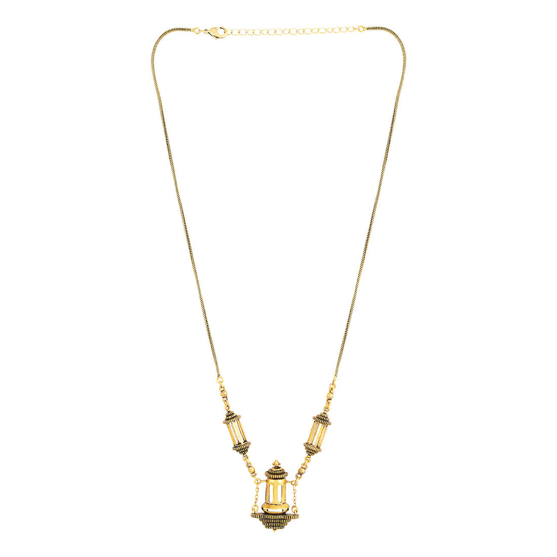 Oxidised yellow gold plated necklace fashioned out of brass. Featuring lamp motifs and good for everyday and party wear.