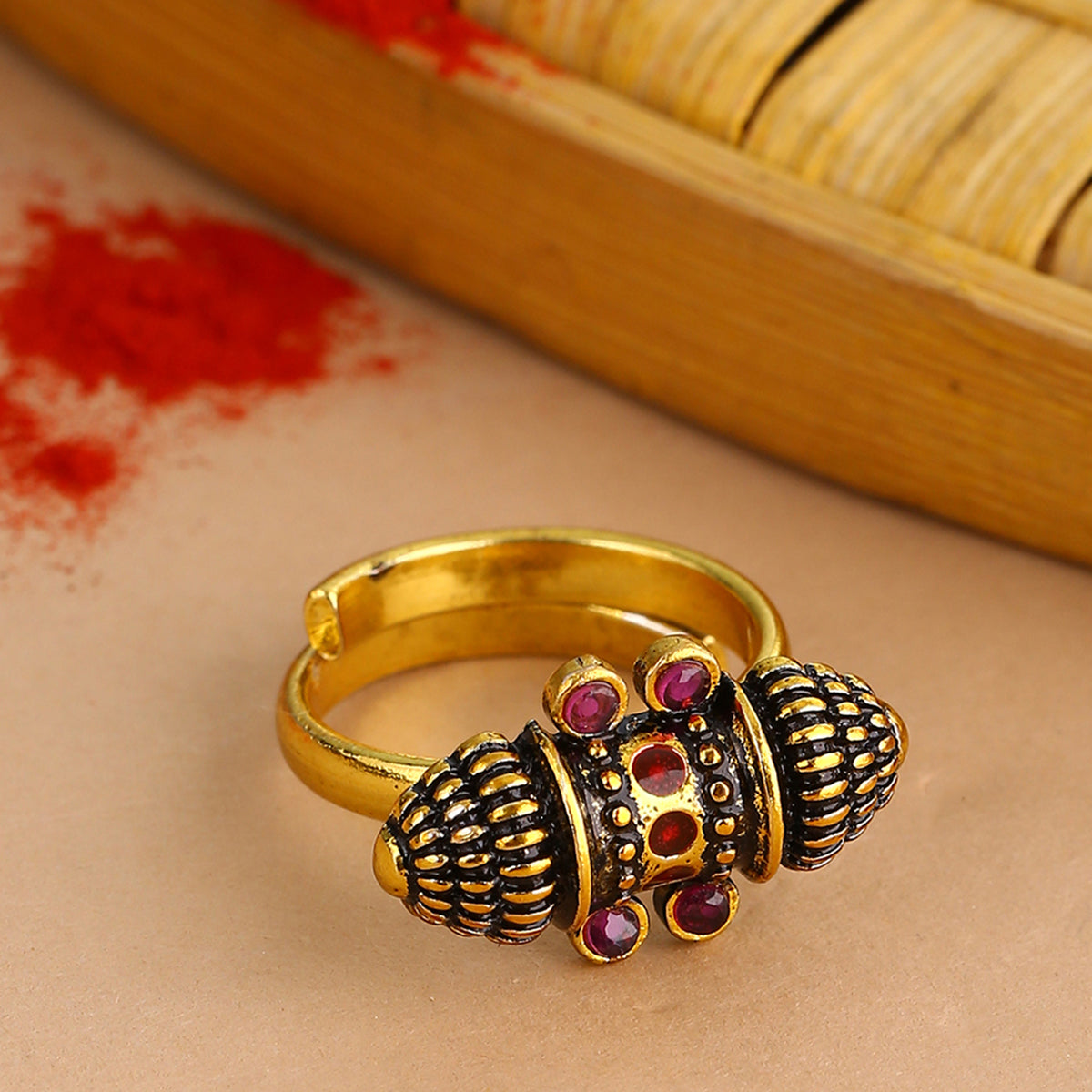 Lightly embellished brass statement ring with antique gold plating. Adjustable and versatile.