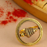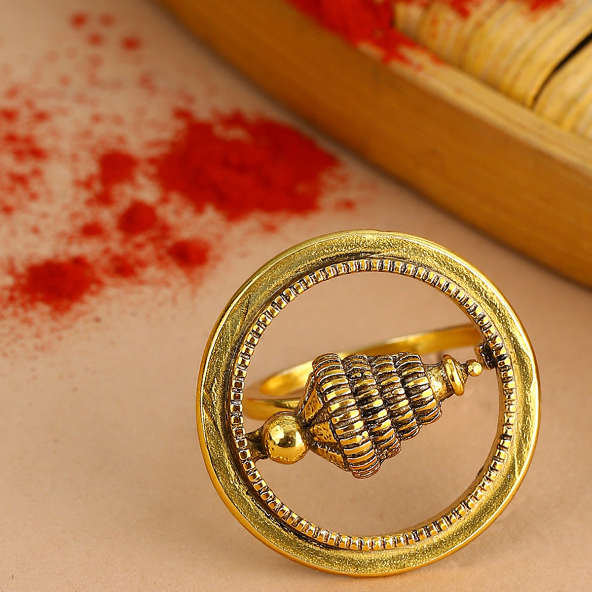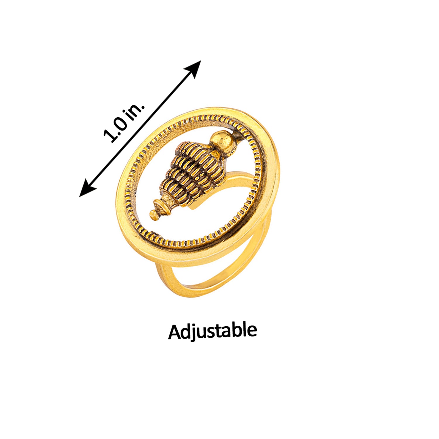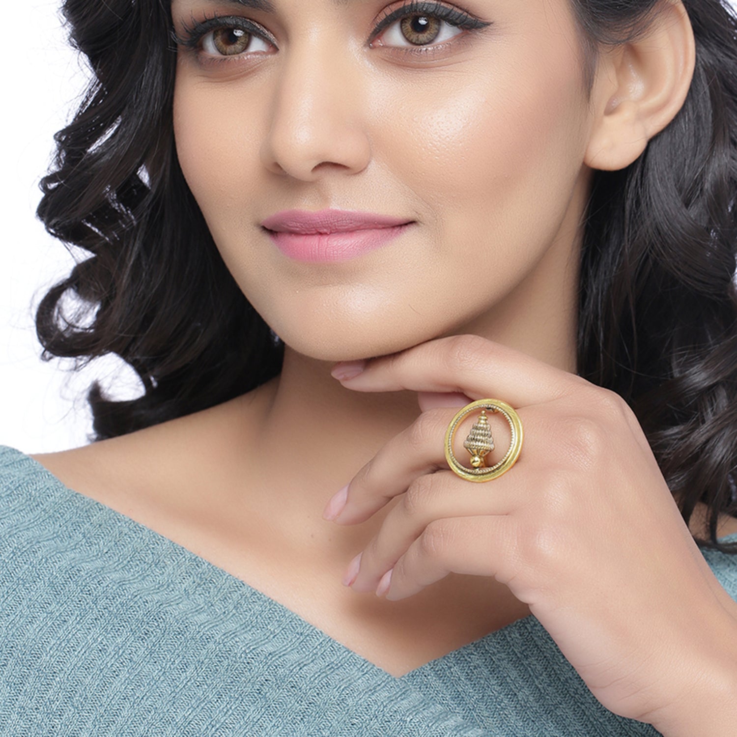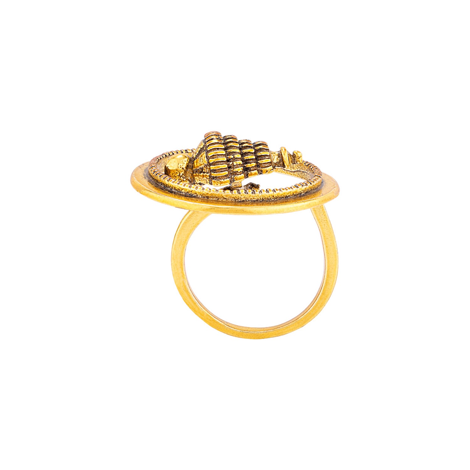 Temple motif brass statement ring. Antique gold plated. Good for Indo-Western and party looks.