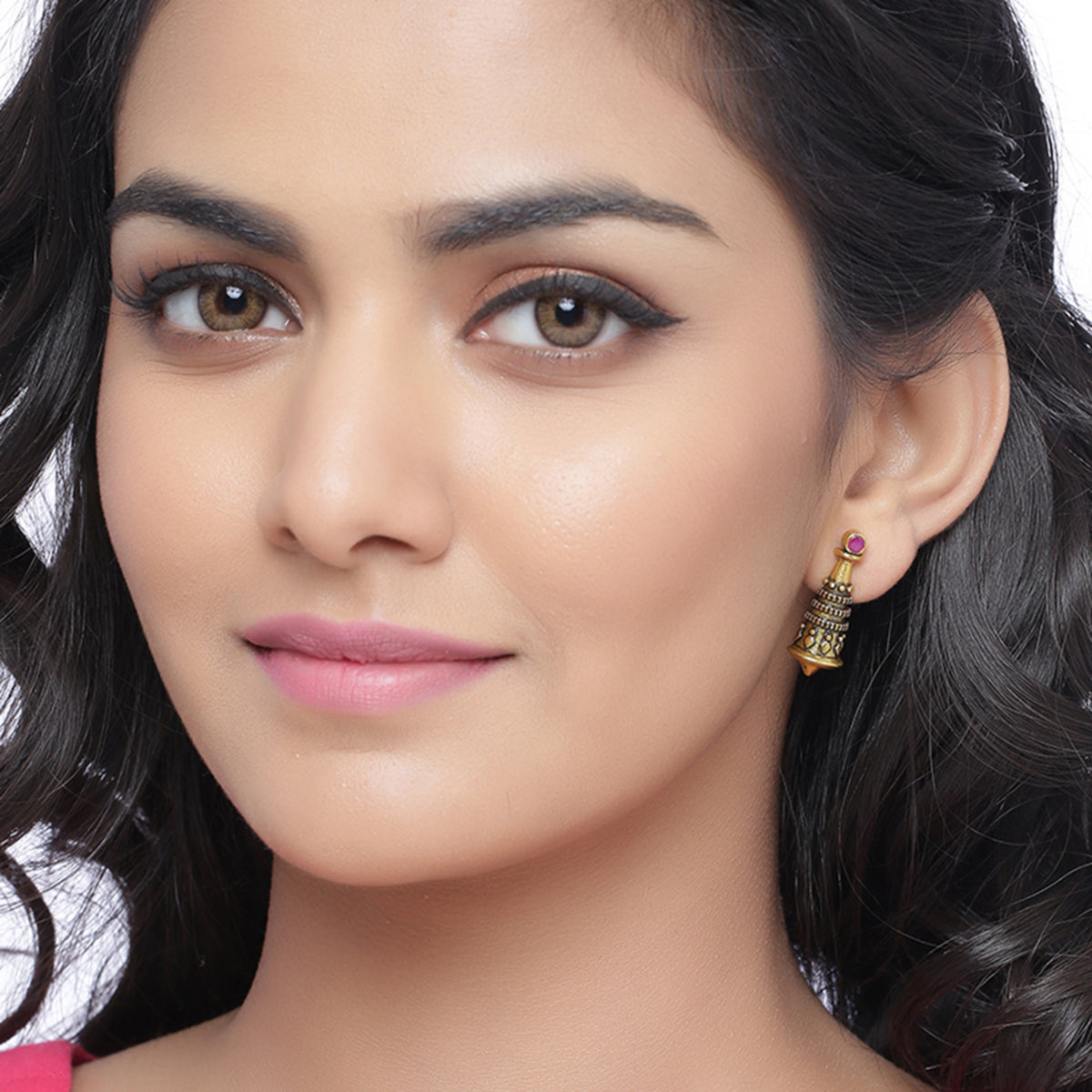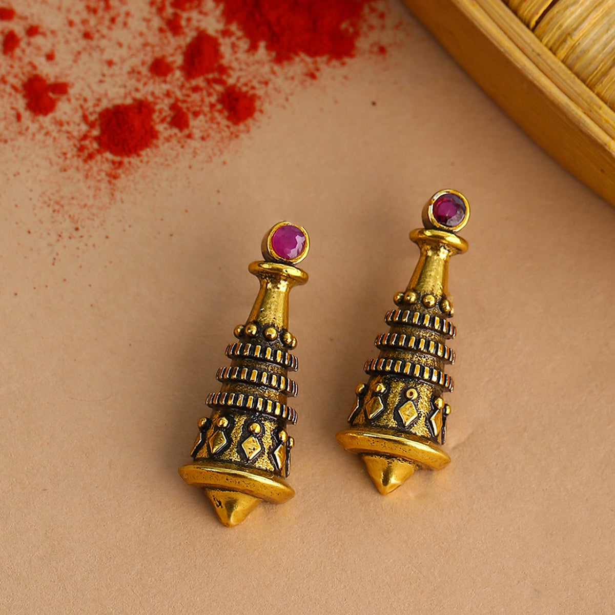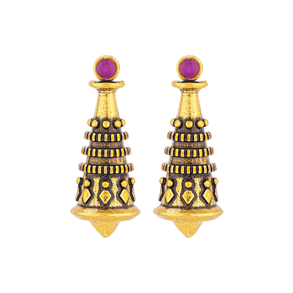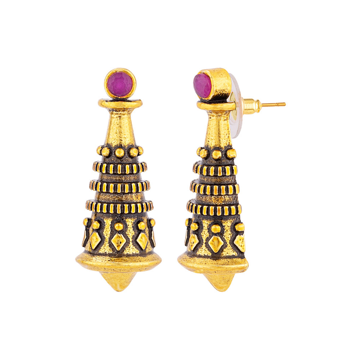 Temple motif stud earrings fashioned out of brass. Lightly embellished and antique gold plated. Pair with casual attire.