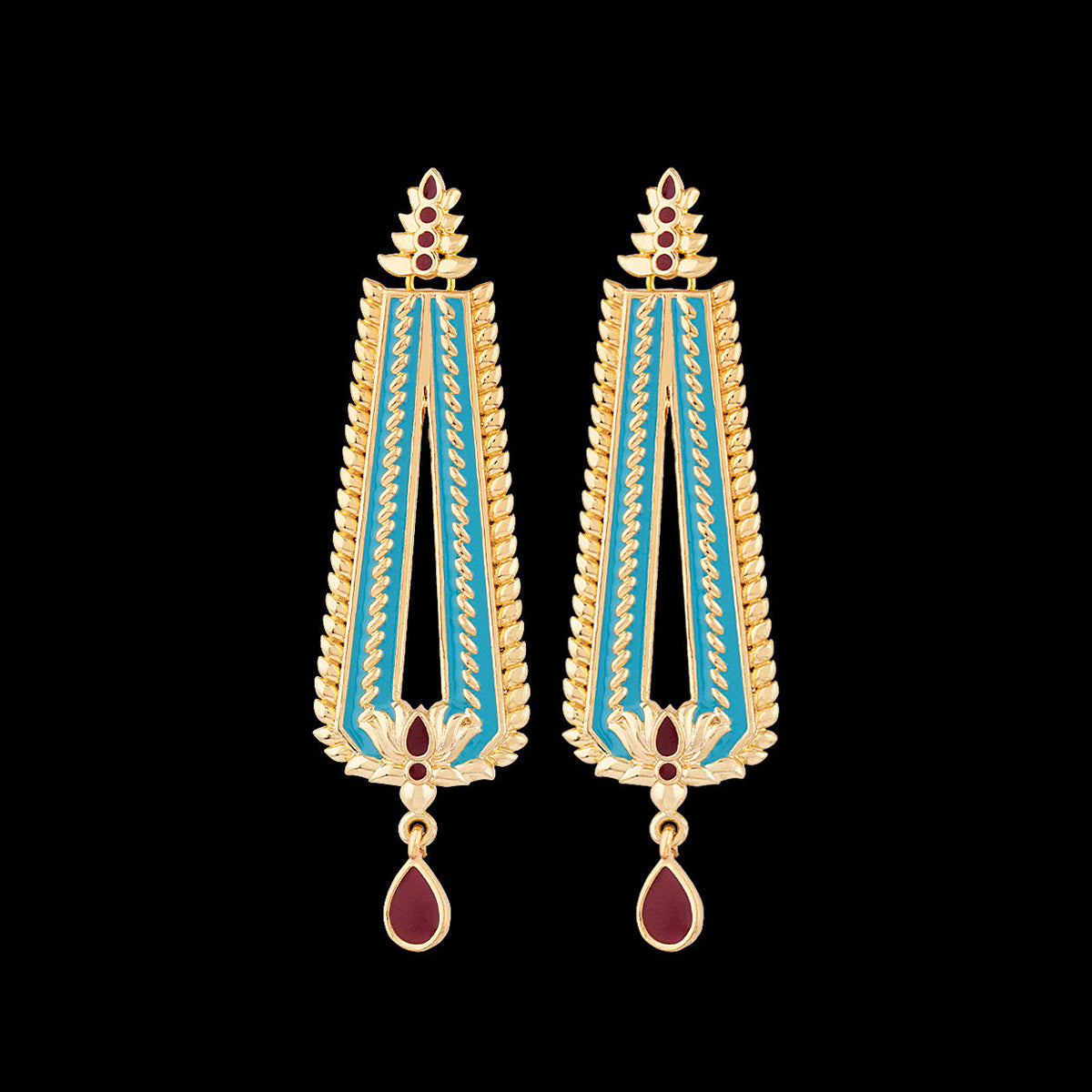 Inspired by the natural beauty of Thailand's jungles, the brass earrings have been adorned with gold enamel details and gemstones. Wear the gold plated pair with a dress or trendy saree.