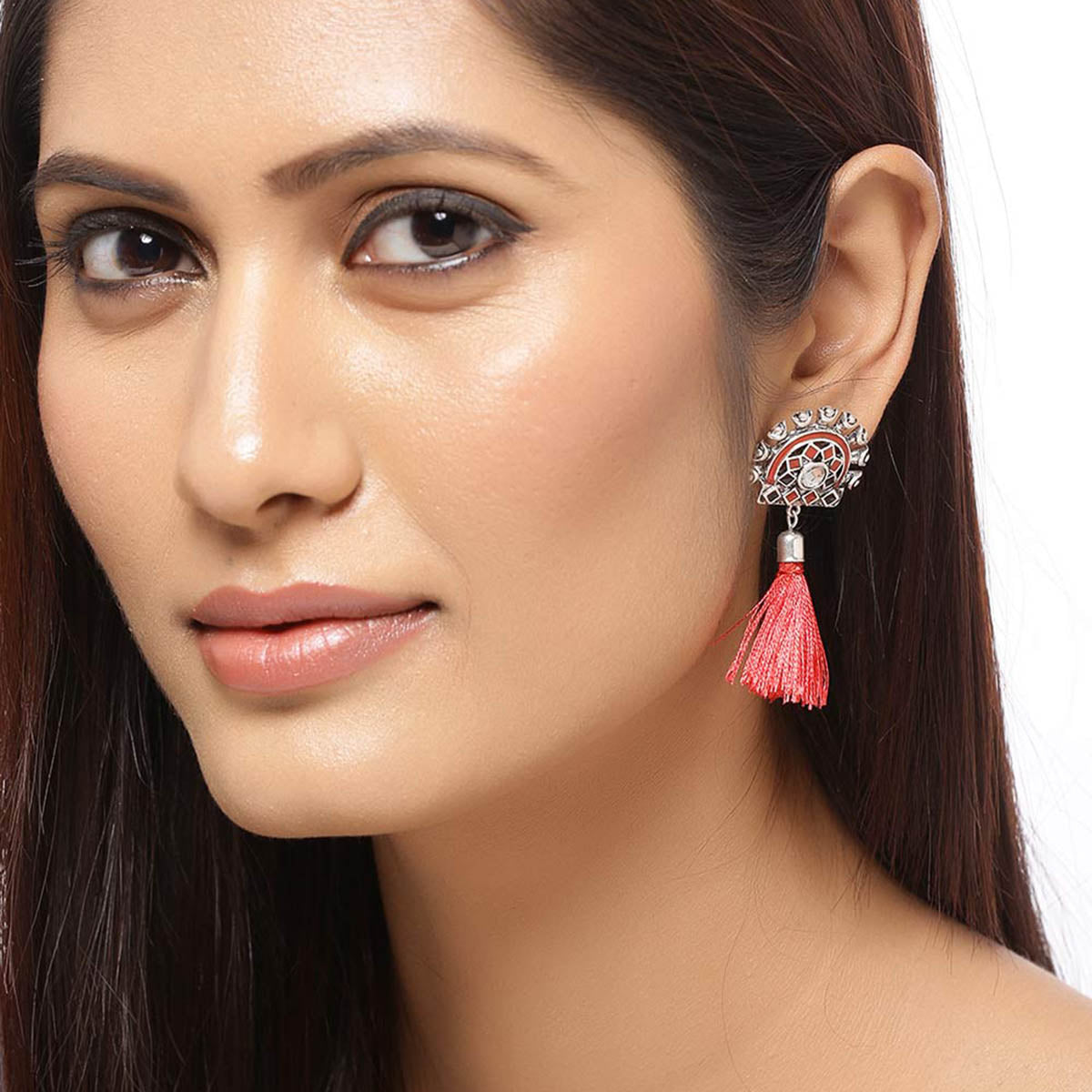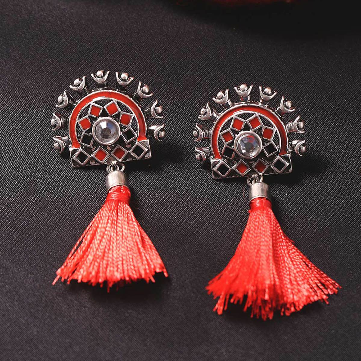 Inspired by Kerala's popular dance form, Theyyam, the red tassels and mirrors earrings have been fashioned out of zinc alloy. Wear the oxidised plated pair with a summer dress.