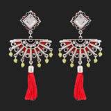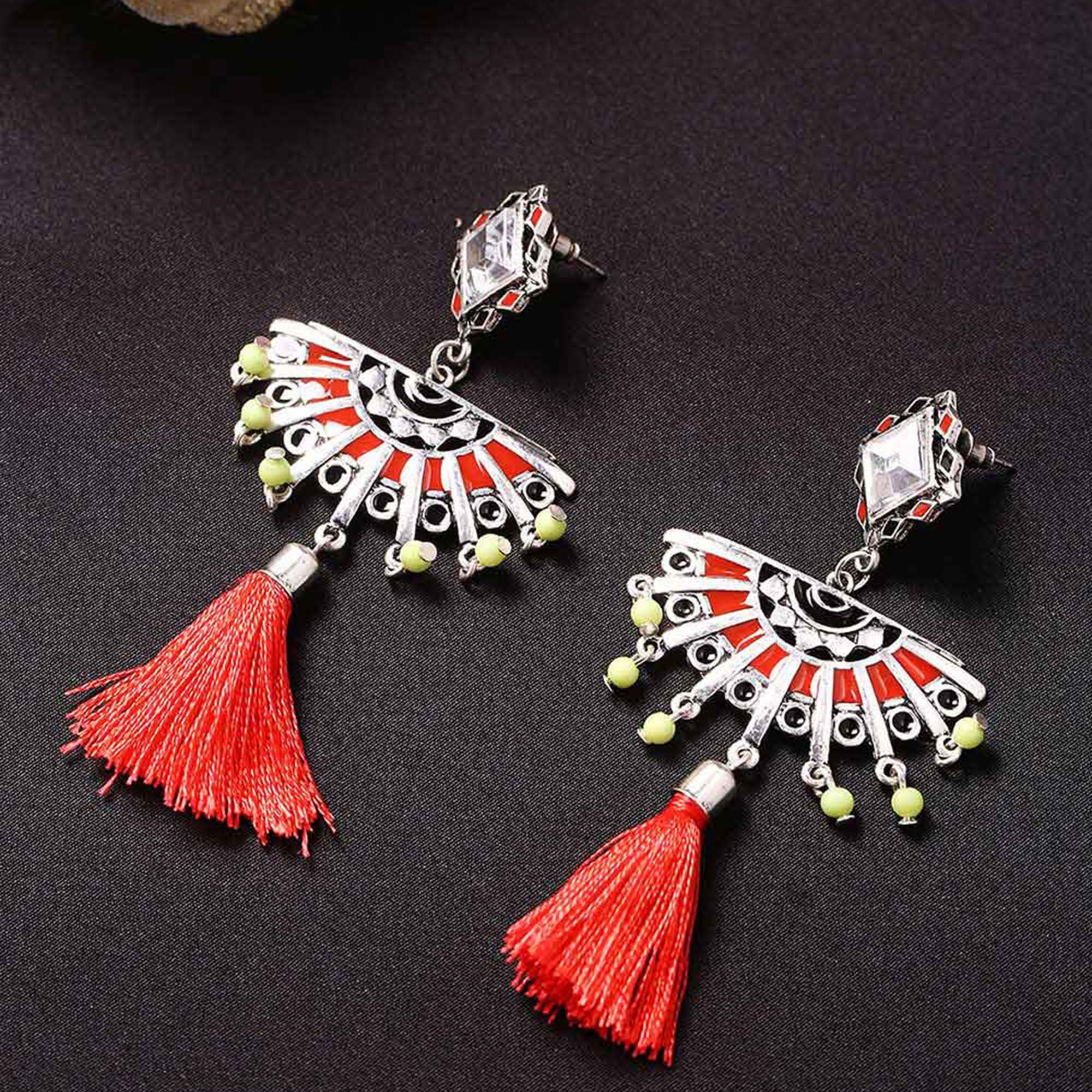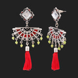 Spokes motif earrings with mirrors and tassels, designed after the Theyyam dance form's costumes. Made from zinc alloy and oxidised plated. Pair with sarees.