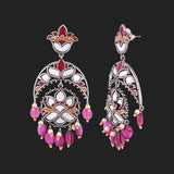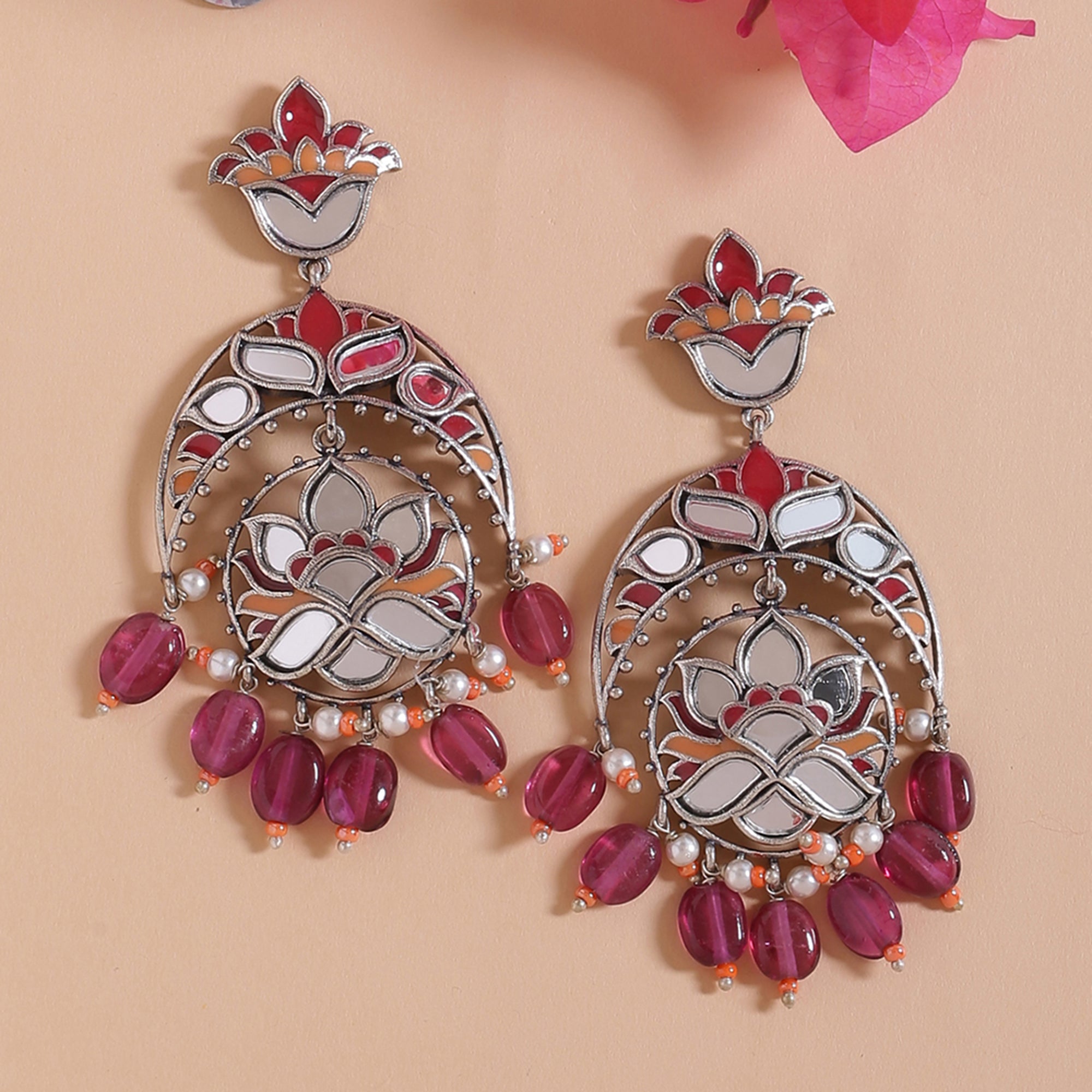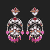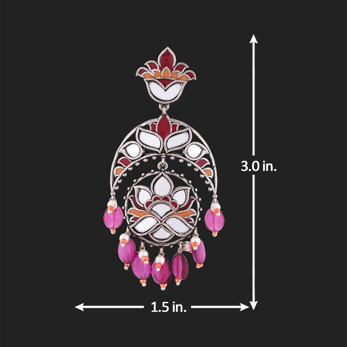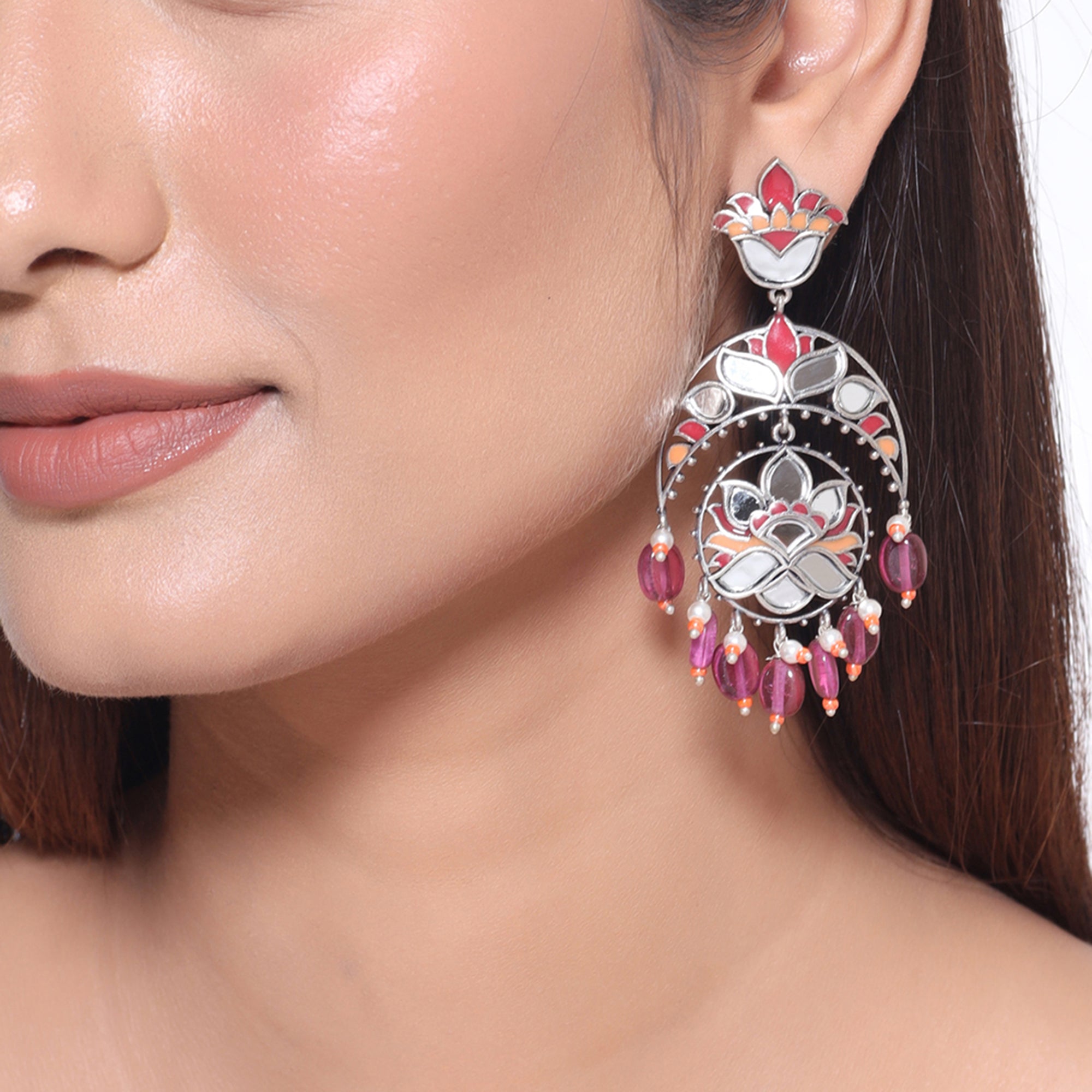 Enameled crescent drop earrings, made from brass and designed as a tribute to the ornate art form of Thikri. Featuring mirror work details and faux pearl embellishments, the enameled earrings are lightweight and can be paired with formal looks.
