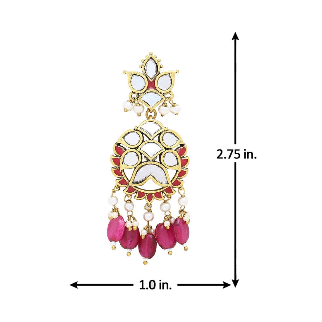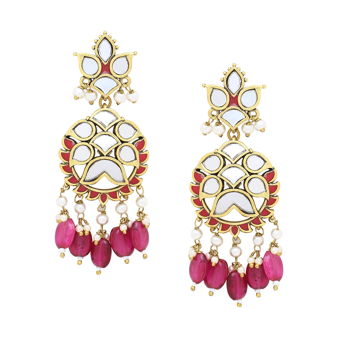 Ethnic drop earrings featuring a traditional hoop design, inspired by Rajasthan's traditional Thikri art-form. Mirror and stone embellishments grace this brass pair which has been given an oxidised yellow gold plating. Wear with a formal kurta.