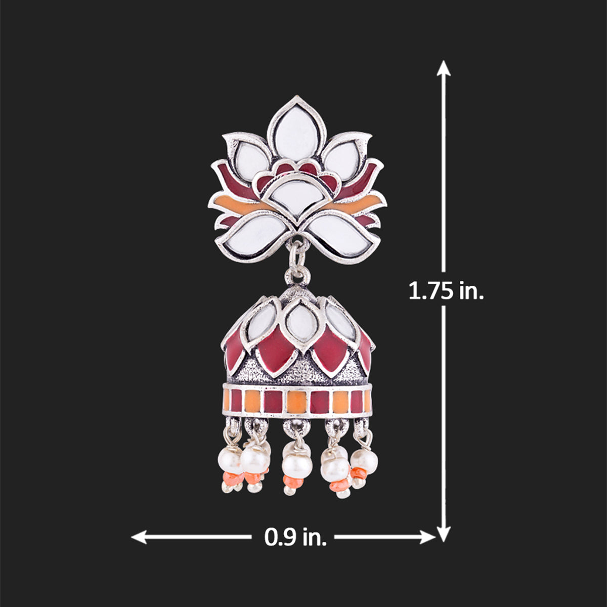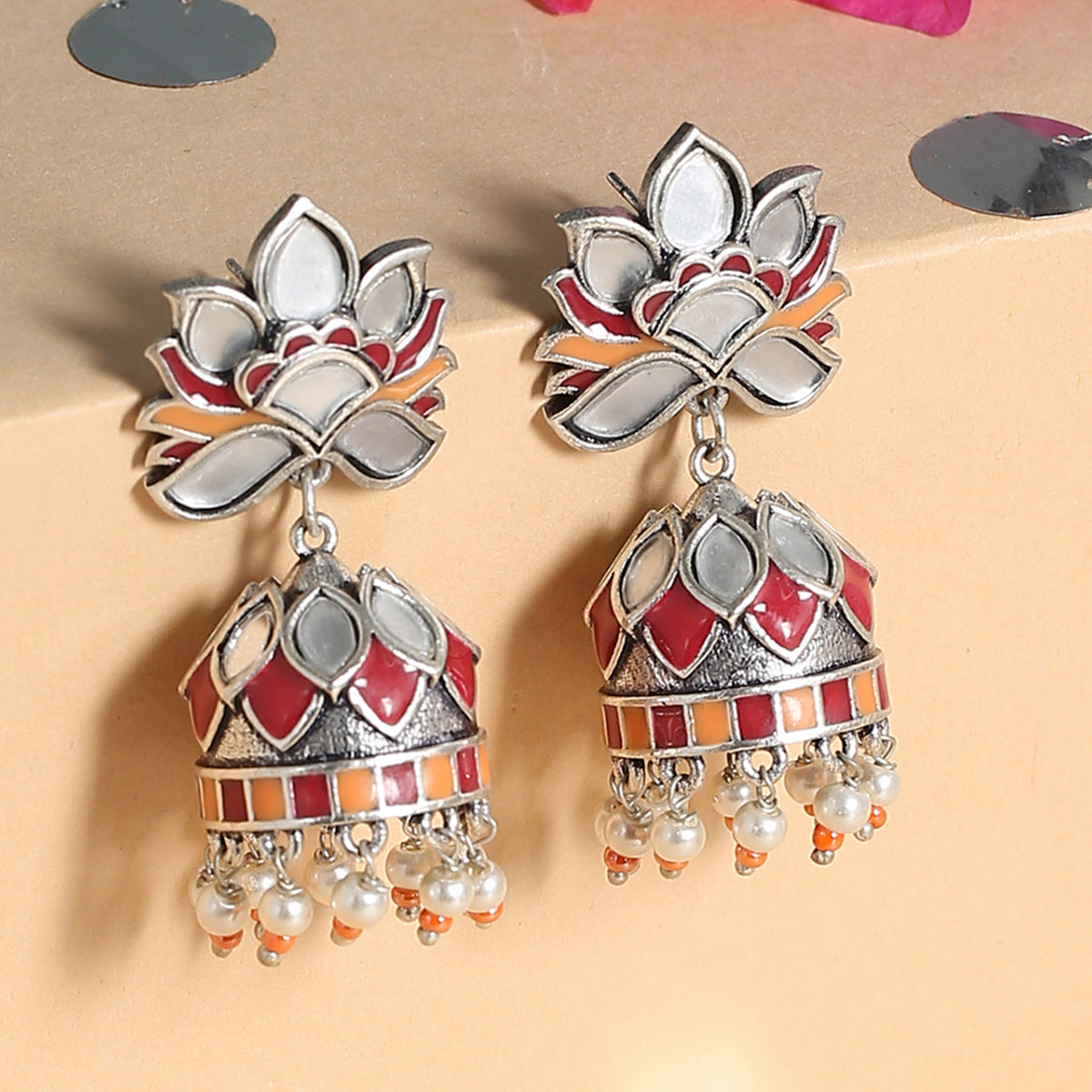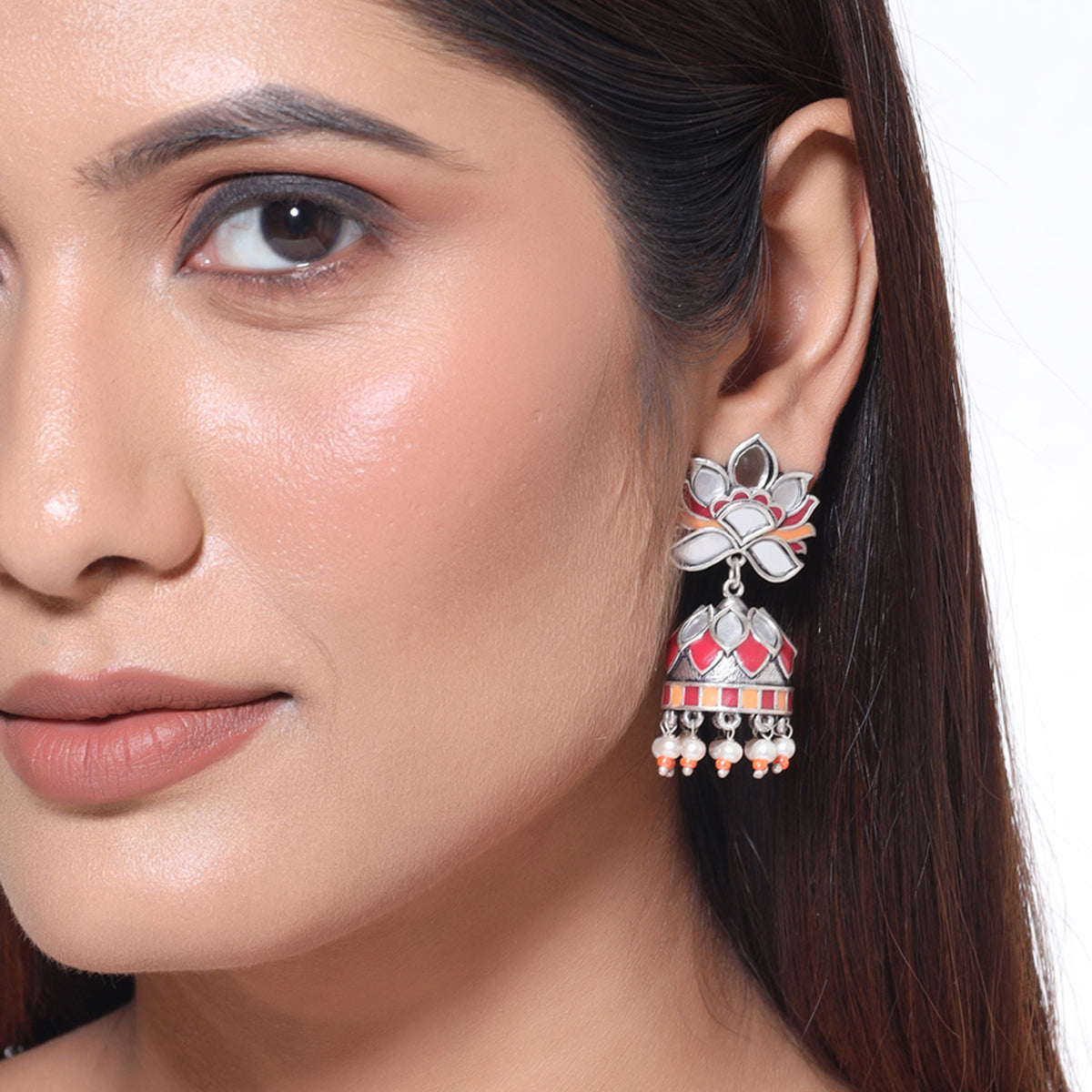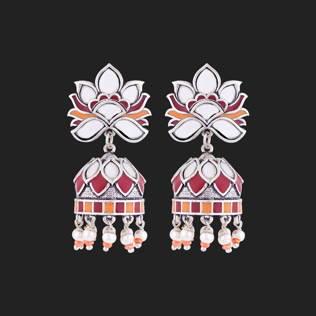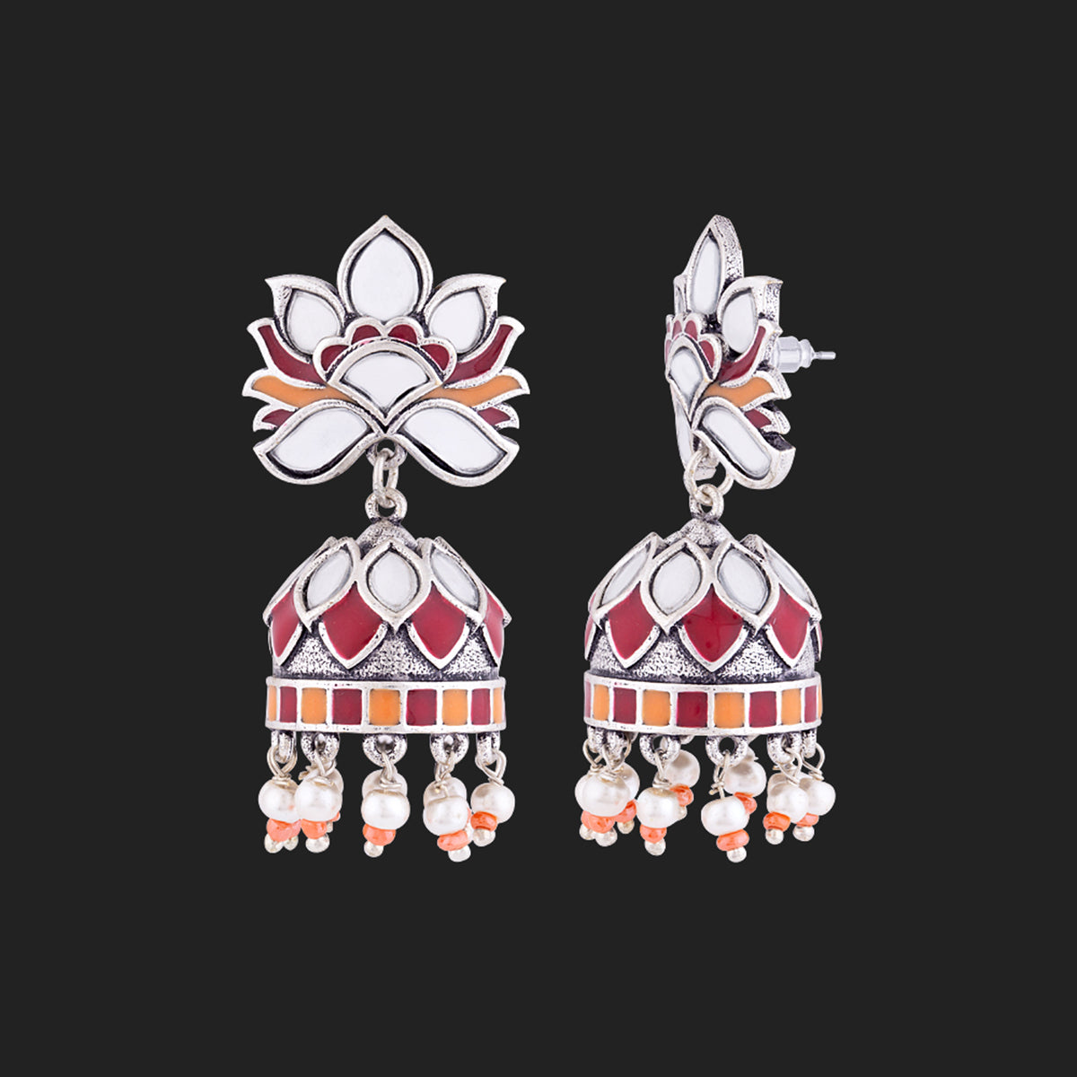 Floral motif jhumka drop earrings, inspired by the Rajasthani mirror inlay art form of Thikri. Made from brass and oxidised silver plated, the enameled pair features mirror details and tiny faux pearls. A good match for casual Indian and Indo-Western looks.