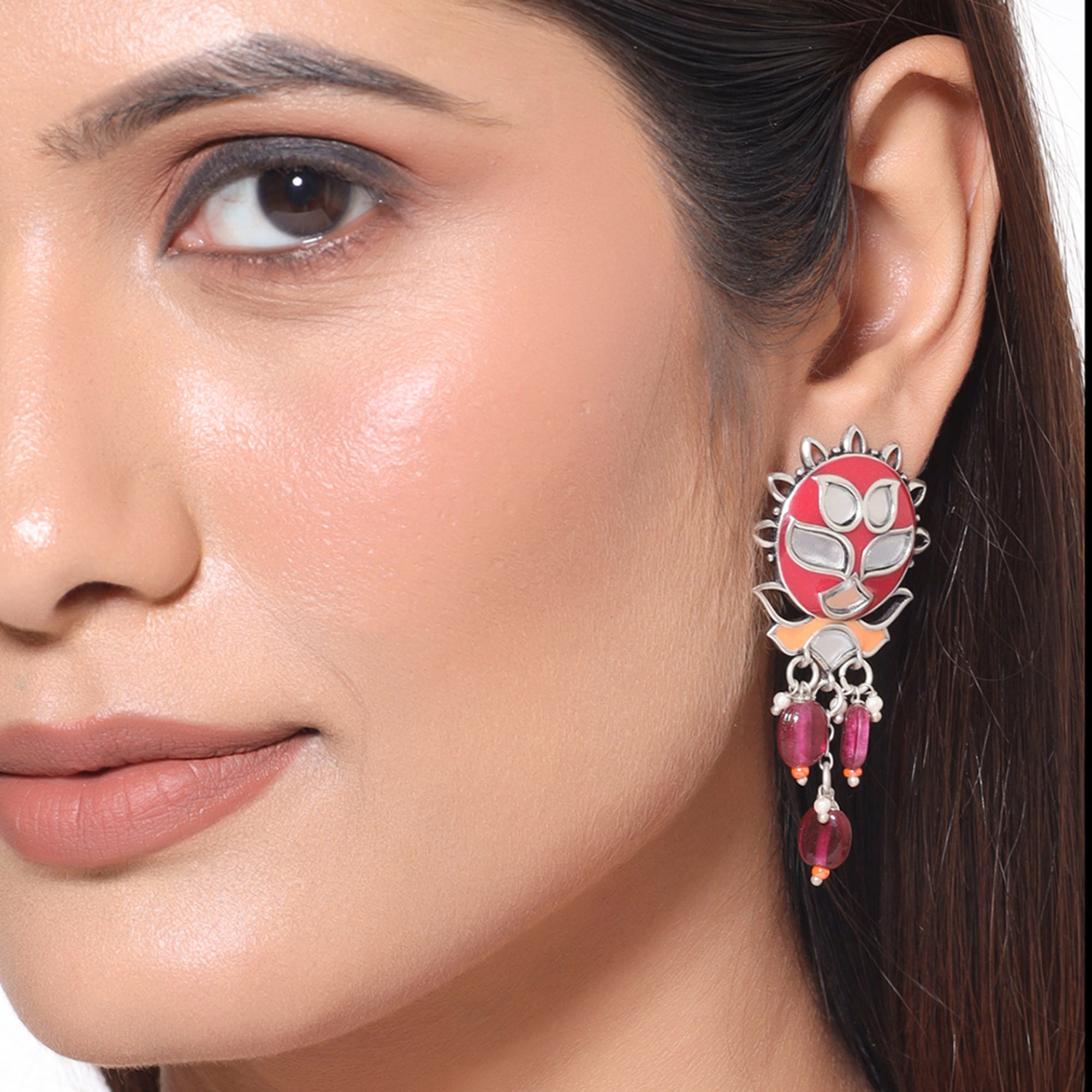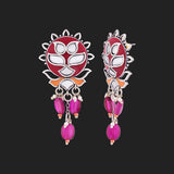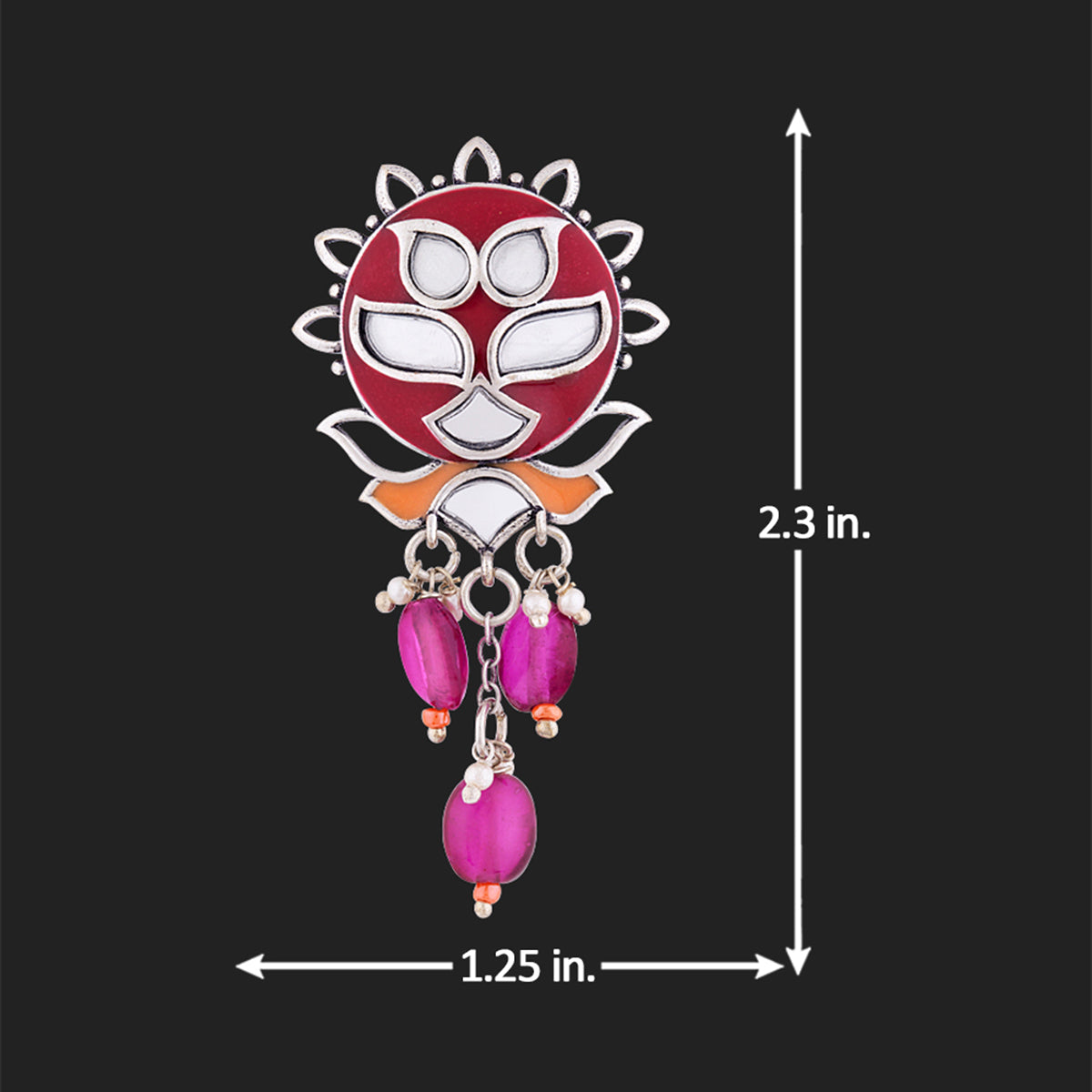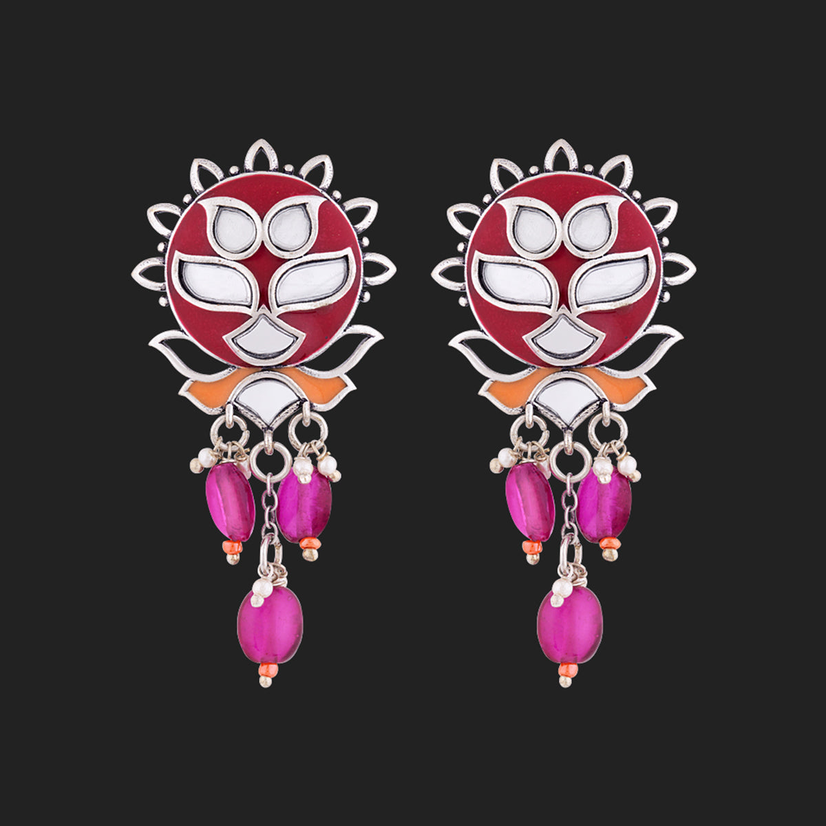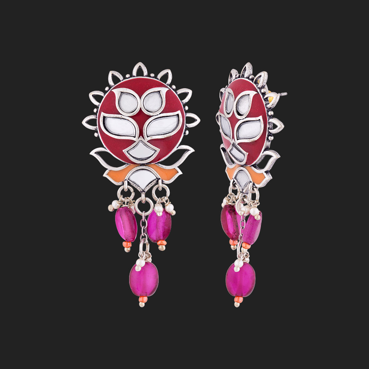 Adorned with floral motifs, these drop style earrings feature mirror work and a design inspired by Rajasthan's famous Thikri art form. Brass has been used in the making of this oxidised silver plated pair. Wear with a casual saree.