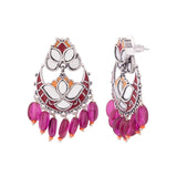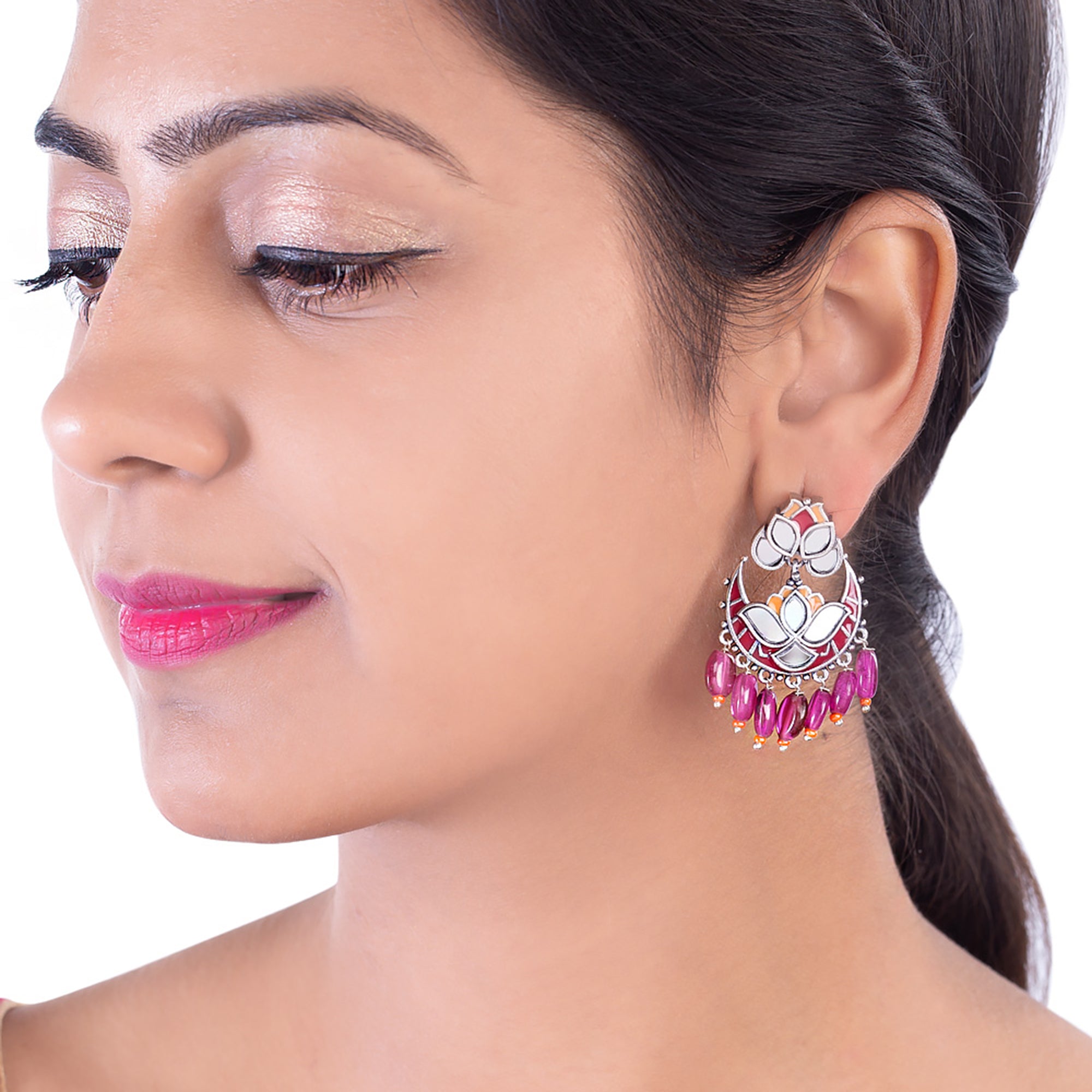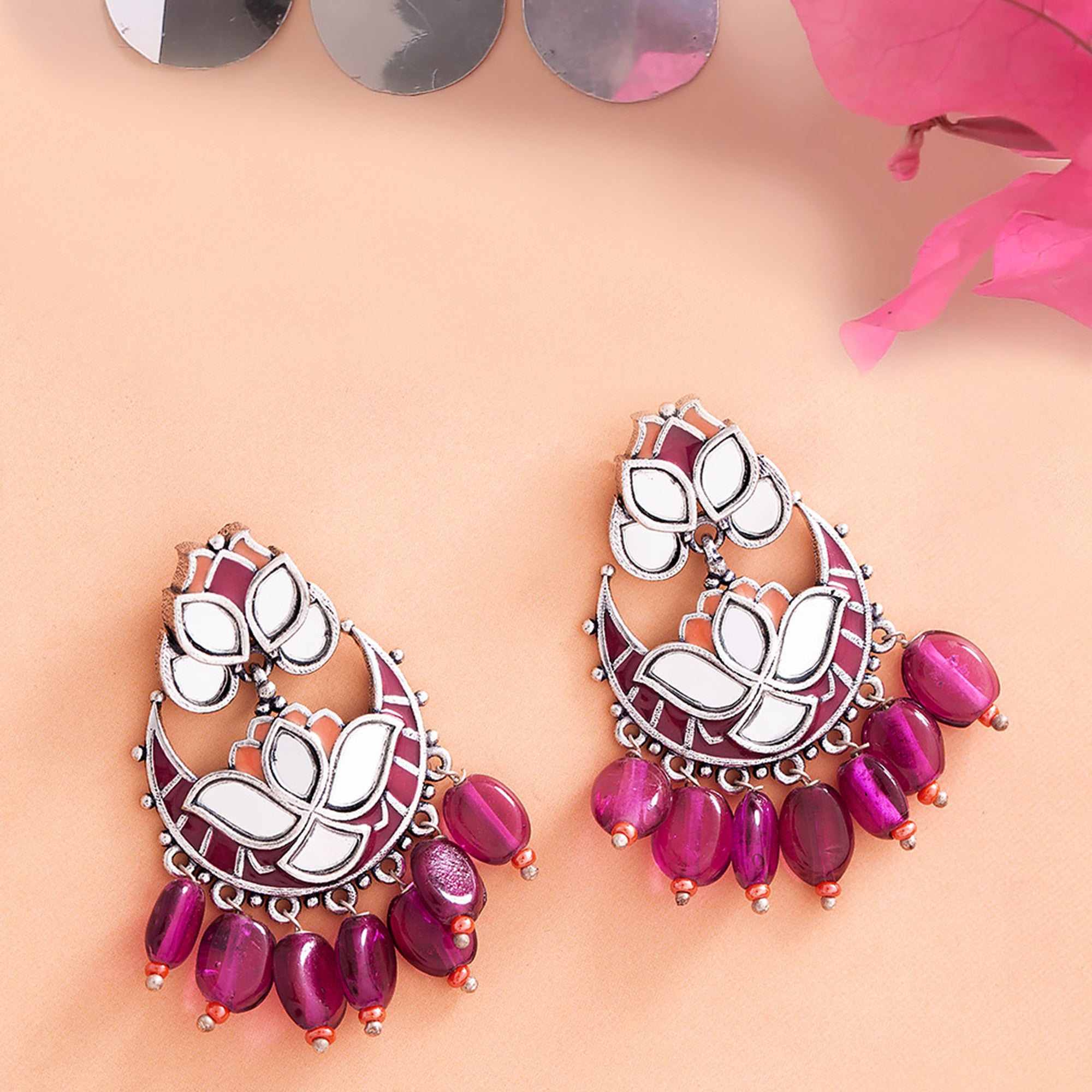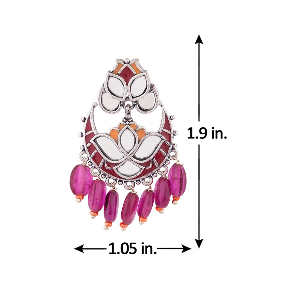 Rajasthan's traditional mirror inlay artform of Thikri has inspired these lotus motif brass earrings, which have been given an oxidised silver plating. Mirrors embellished and enameled, the earrings are lightweight, comfortable and versatile.