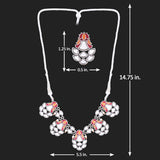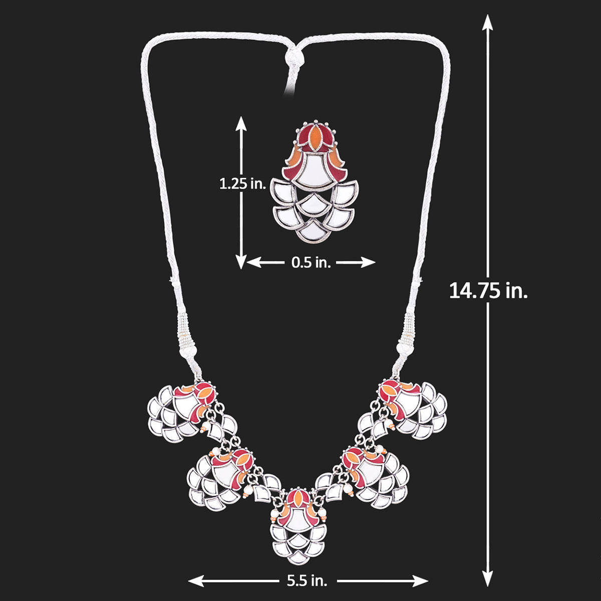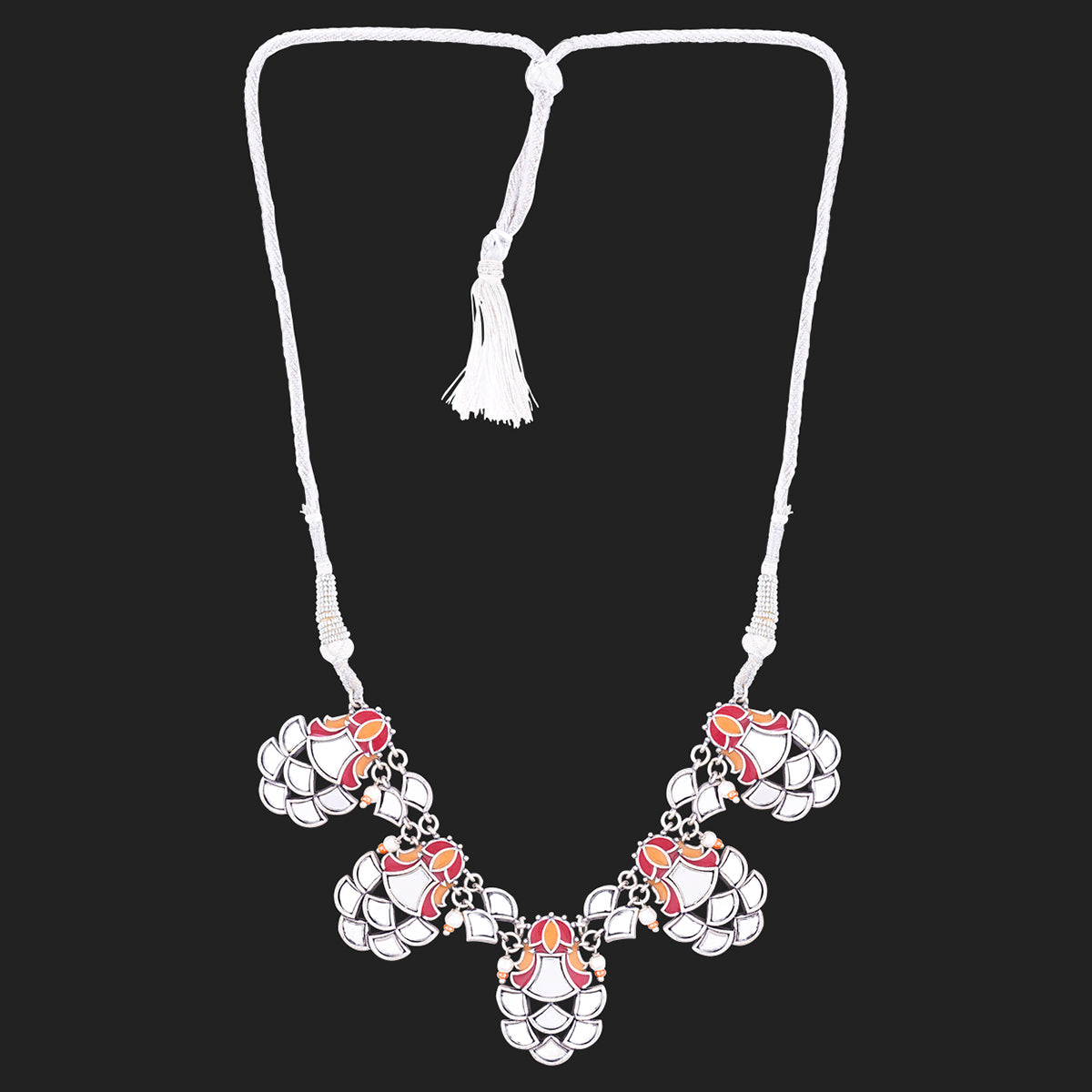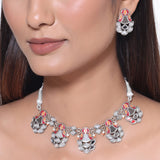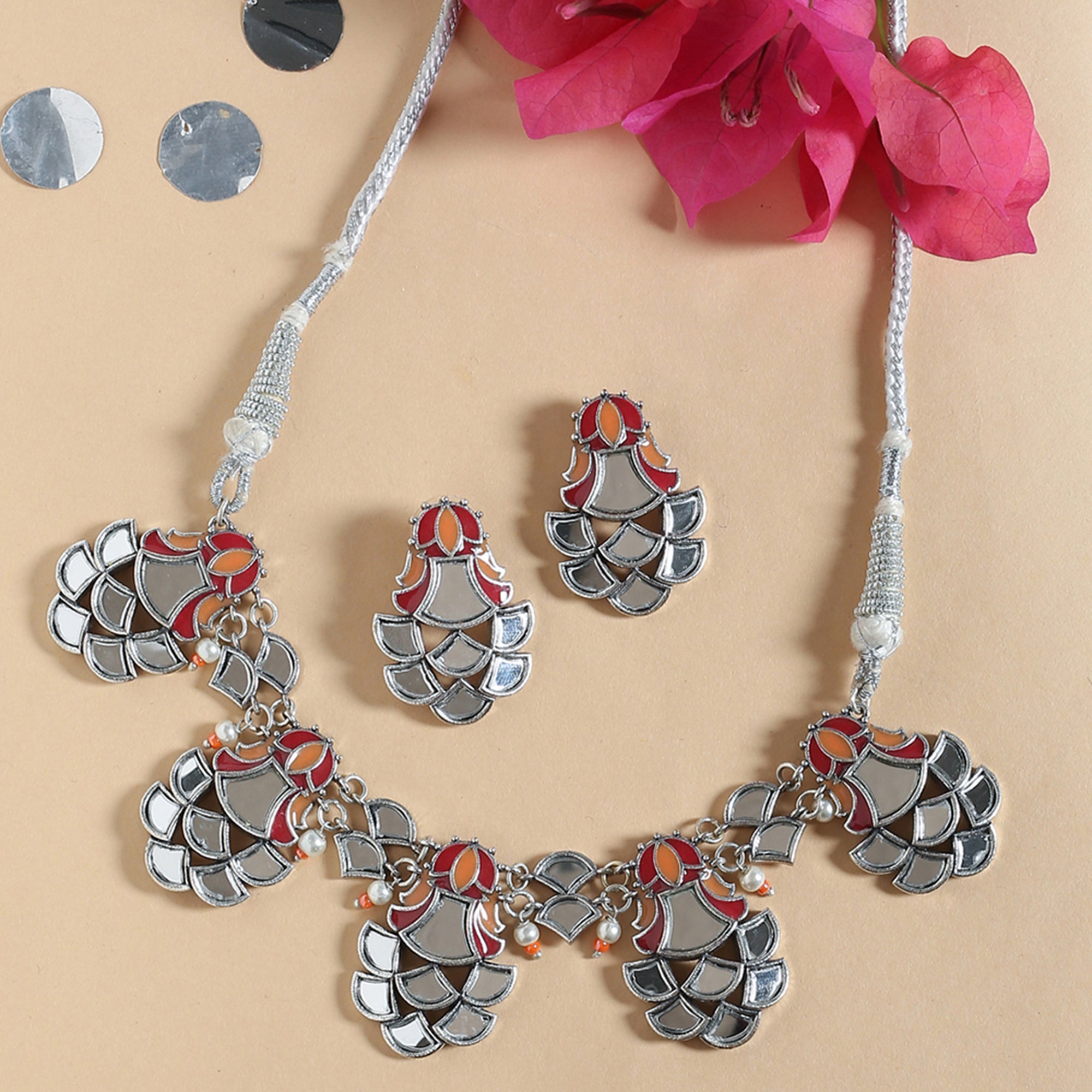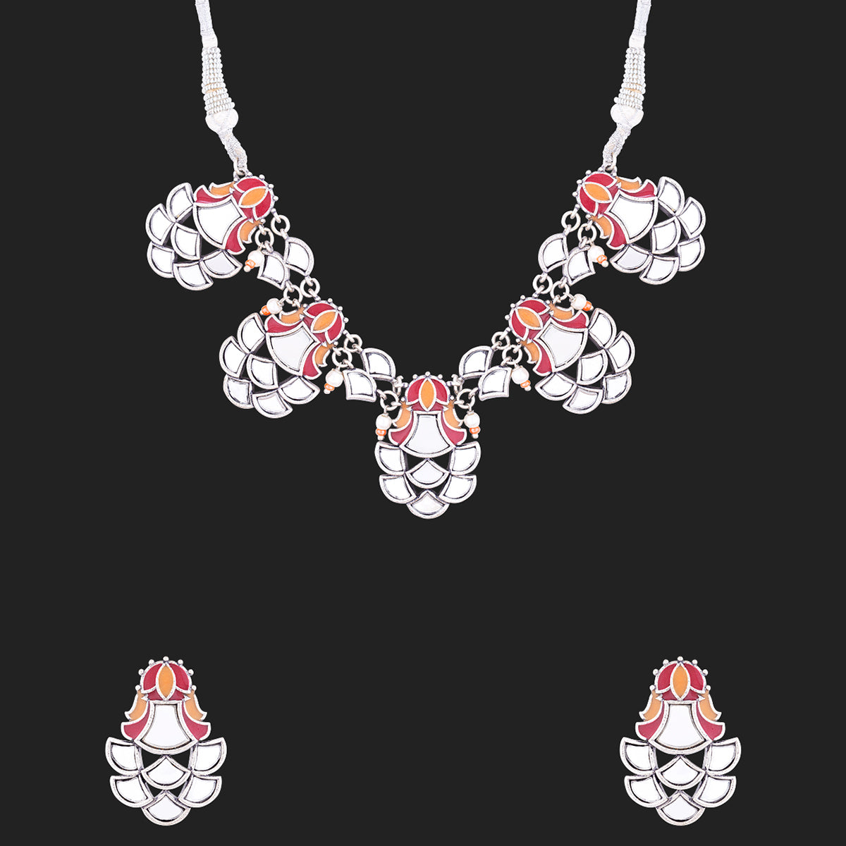 The opulent and beautiful Rajasthani art form of Thikri has inspired this choker necklace set, which features delicate and intricate mirror work. Made from brass and oxidised silver plated, the set has been lightly enameled and can be paired with Indian and Indo-Western looks.