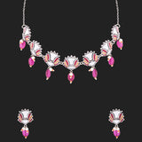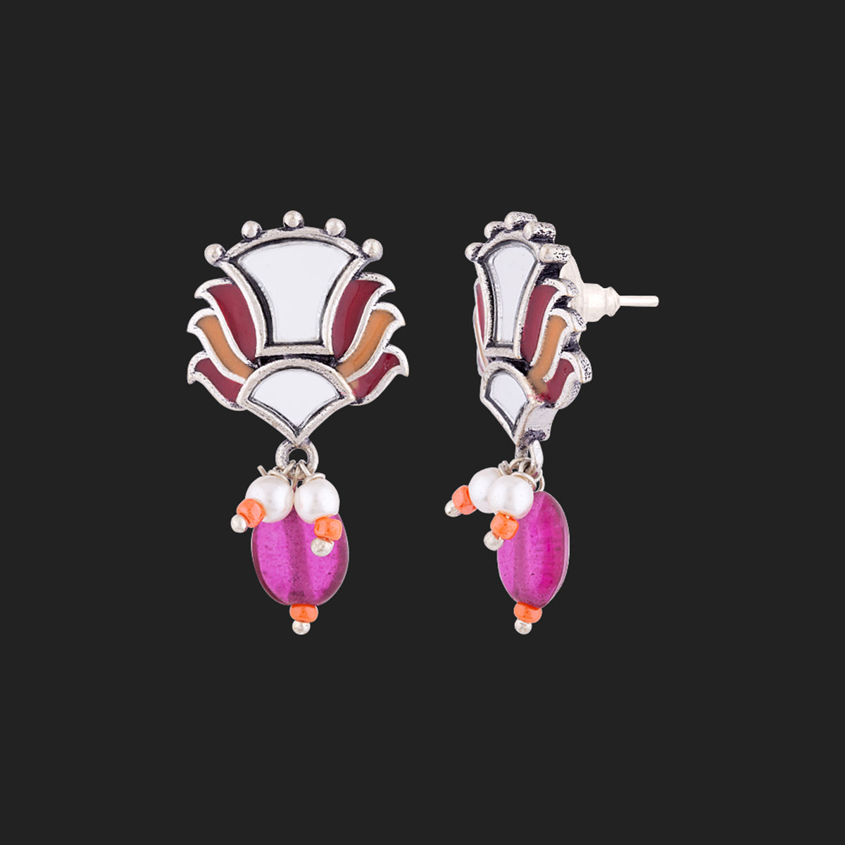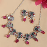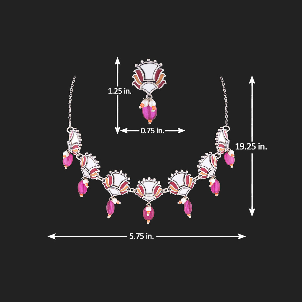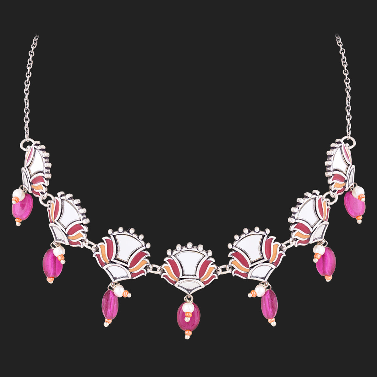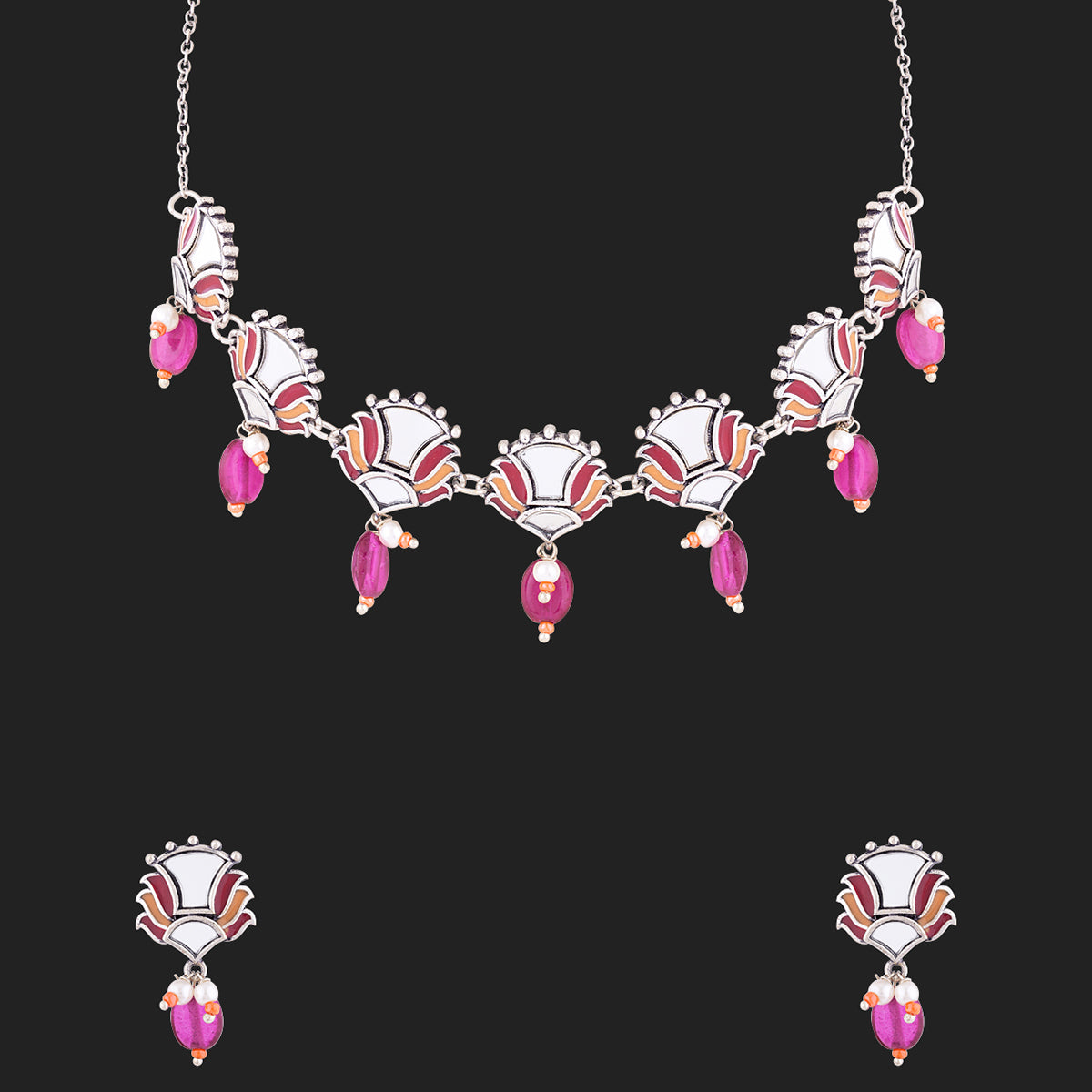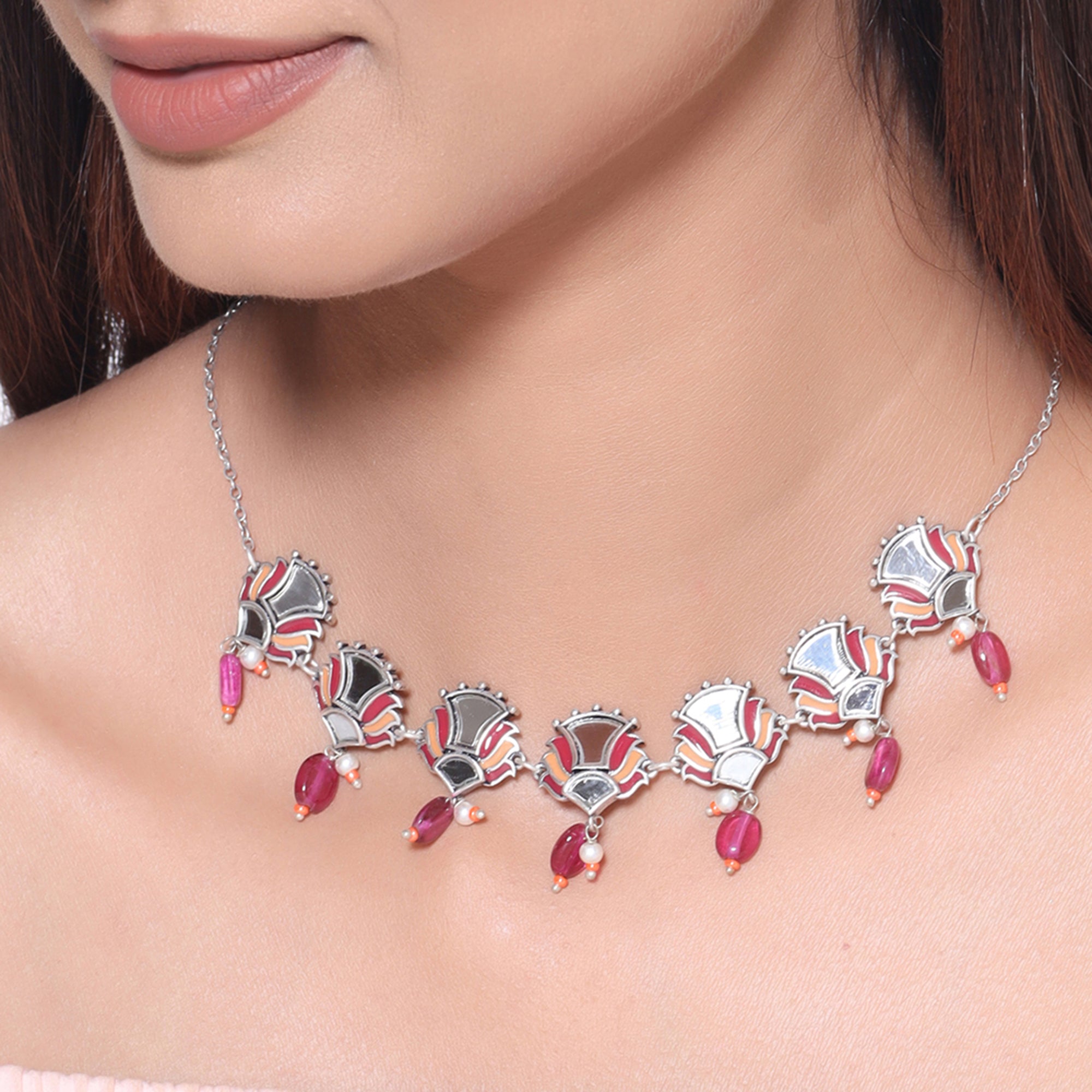 Necklace set fashioned out of brass and designed as a tribute to the opulent Rajasthani art form of Thikri. Mirrored and featuring stone embellishments, the oxidised silver plated set is perfect for Bohemian looks.