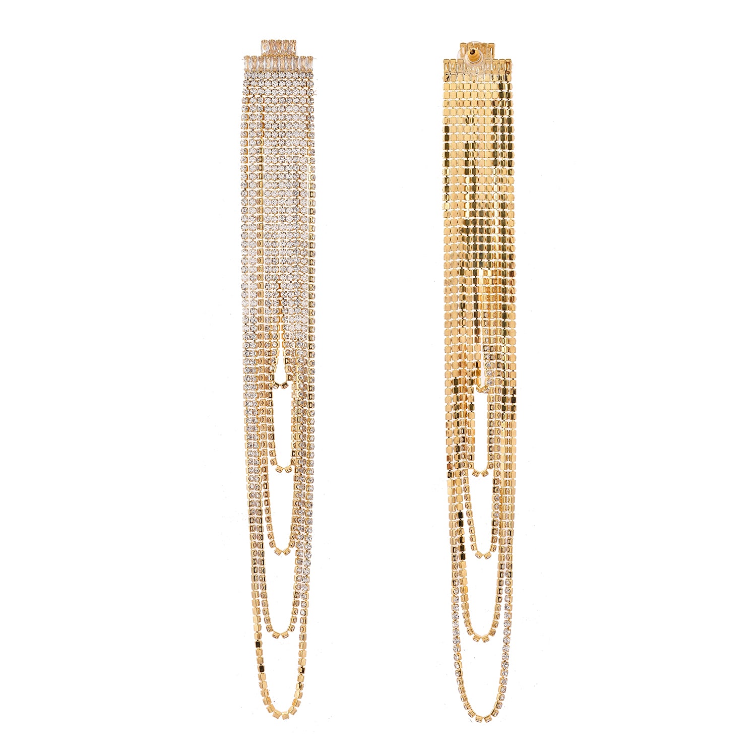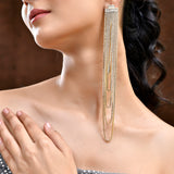 The Crystal Rain Multi-Layer Gold Rhinestone Earrings are a stunning addition to the Timeless Sparkle collection, crafted with meticulous attention to detail. Made from high-quality brass and plated with luxurious gold, these long dangler earrings feature multiple layers of shimmering rhinestones that cascade elegantly, creating a statement piece perfect for any occasion. The intricate design ensures a dazzling effect, making them ideal for party wear, weddings, festive celebrations, or even daily wear. Their versatile gold color complements a wide range of outfits, from western to traditional attire. These designer earrings are not only a trendy accessory but also a thoughtful gift for women on special occasions such as Valentine's Day, Diwali, Rakshabandhan, Christmas, and New Year. Whether for a girlfriend, wife, mother, or sister, these earrings are sure to impress and delight.