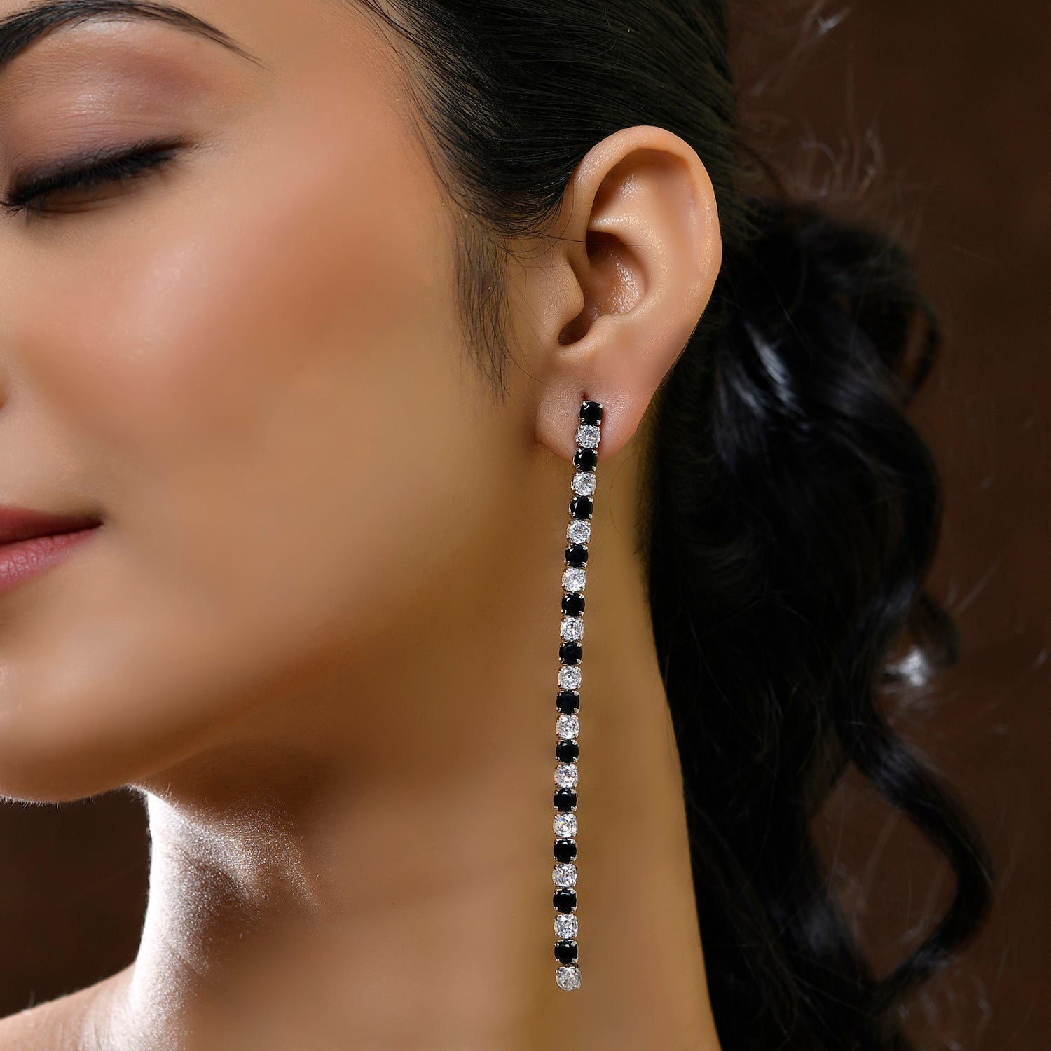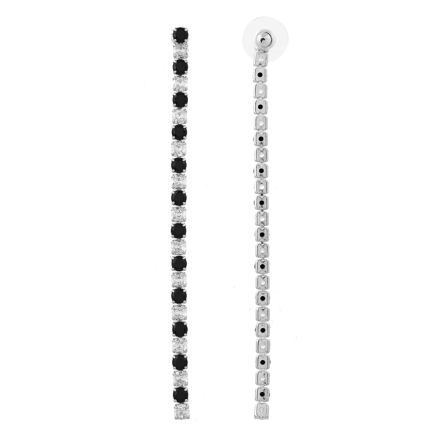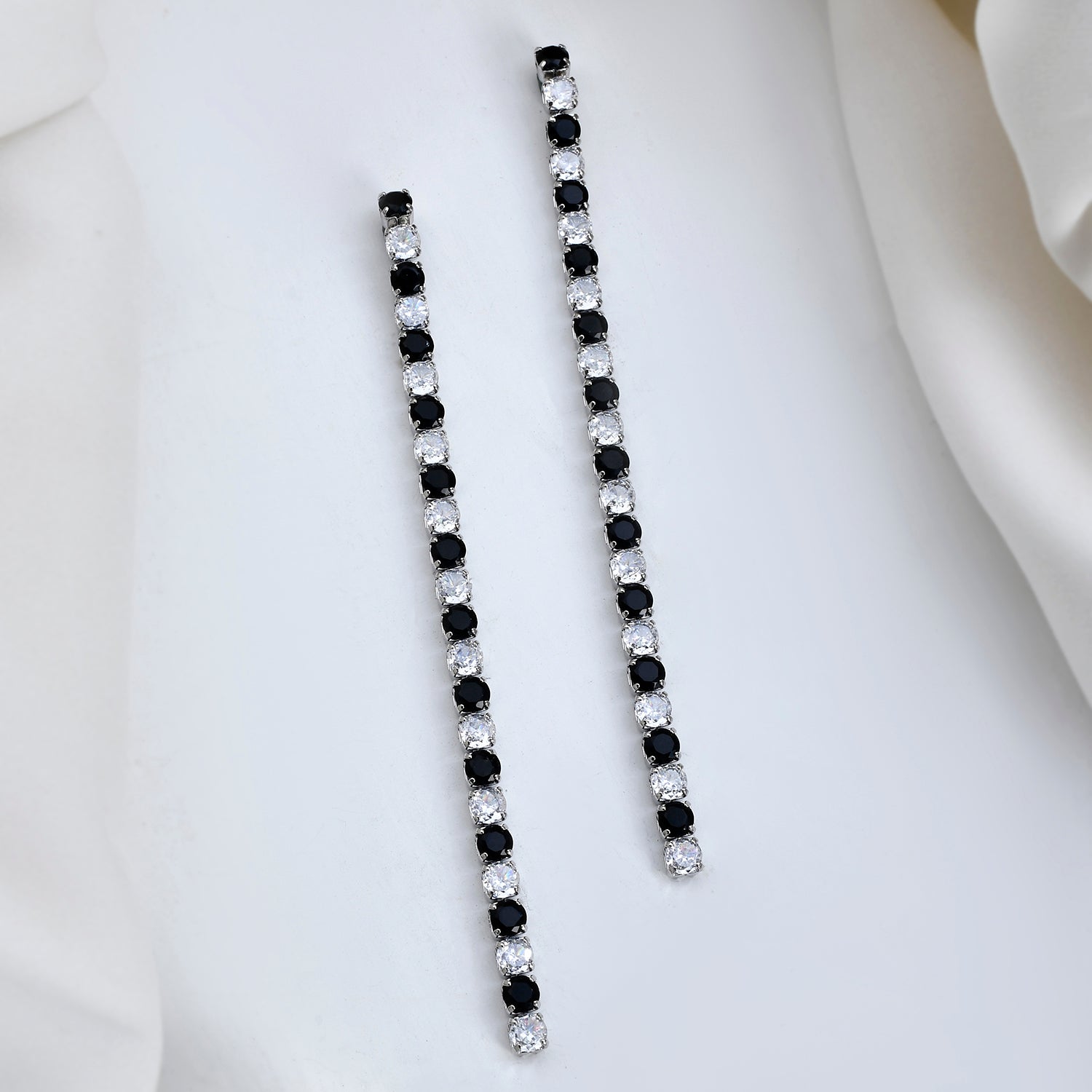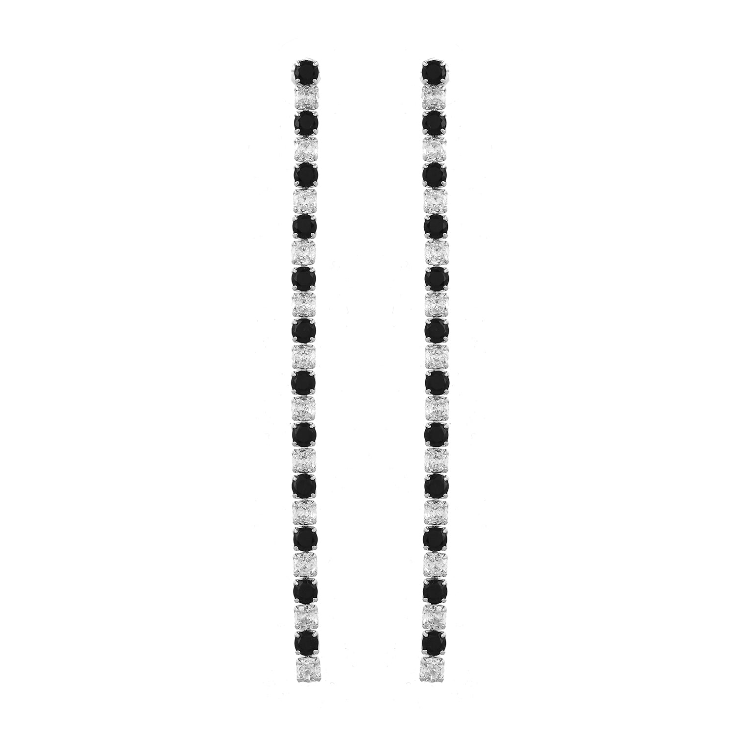 Introducing the Dream Glow Black Long Rhinestone Dangler Earrings, a stunning addition to the Timeless Sparkle collection. These exquisite earrings are crafted from high-quality brass and plated with luxurious white Rhodium, ensuring durability and a radiant finish. The design features a captivating alternating pattern of black and clear rhinestones, creating a striking contrast that catches the light beautifully. Perfect for any occasion, these statement earrings are versatile enough for daily wear, festive celebrations, weddings, or even a glamorous night out. The elegant long dangler style adds a touch of sophistication to any outfit, making them an ideal gift for women, whether it's for Valentine's Day, Diwali, Rakshabandhan, Christmas, or New Year. Surprise your loved ones, be it your girlfriend, wife, mother, or sister, with these trendy and fashionable earrings that are sure to make them feel special.