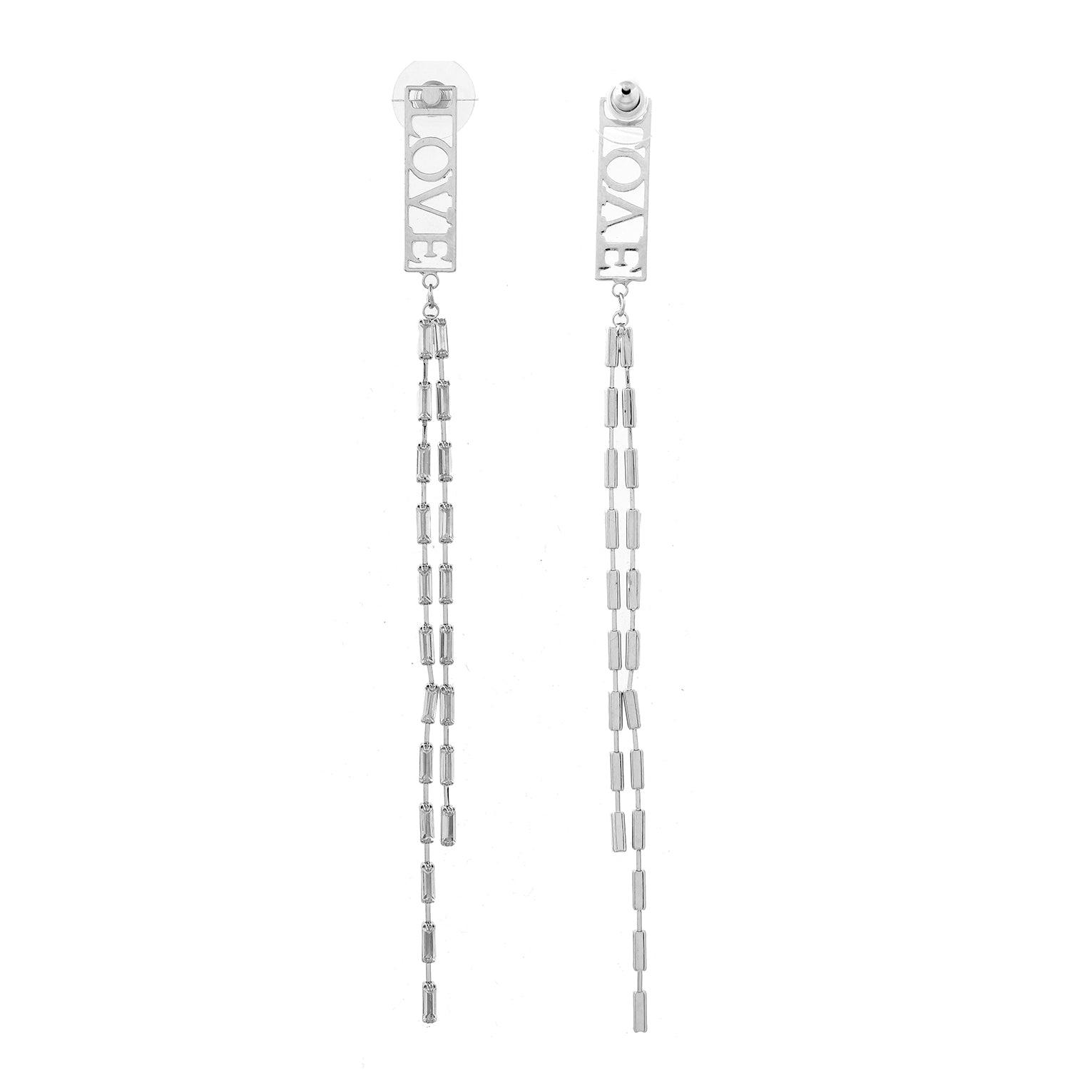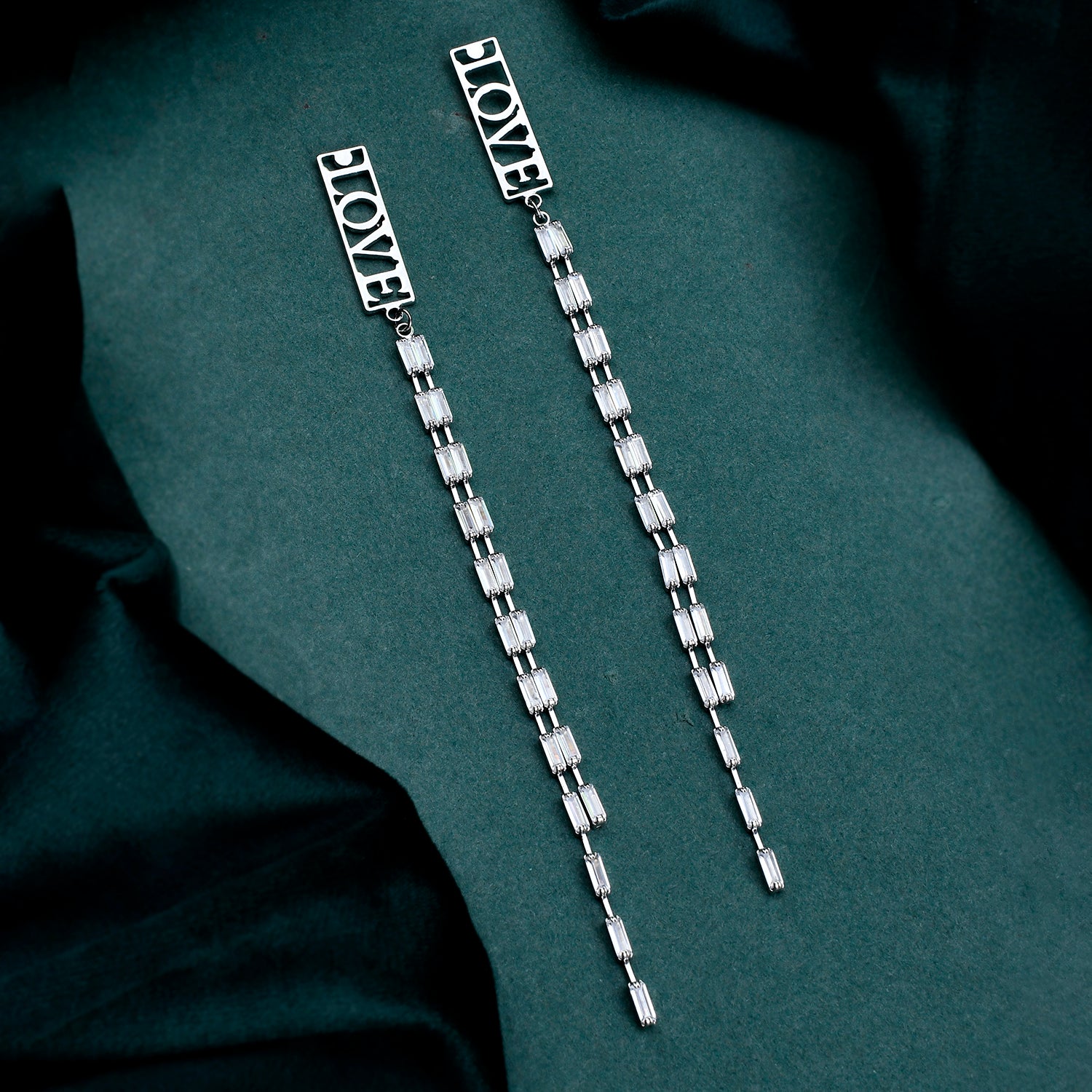 The Endless Love Long Rhinestone Dangler Earrings are a stunning addition to the Timeless Sparkle collection, crafted from high-quality brass and plated with white rhodium for a luxurious finish. These designer earrings feature an elegant design with the word "LOVE" beautifully integrated into the top part, followed by a cascade of sparkling rhinestones that create a mesmerizing effect. Perfect for any occasion, these statement earrings are versatile enough for daily wear, festive celebrations, weddings, or even a glamorous night out. The sleek silver color complements any outfit, making them an ideal gift for women, whether it's for Valentine's Day, Diwali, Rakshabandhan, Christmas, or New Year. These trendy earrings are a thoughtful gift for a sister, girlfriend, wife, mother, or any special woman in your life. Elevate your style with these exquisite long dangler earrings that exude elegance and charm.