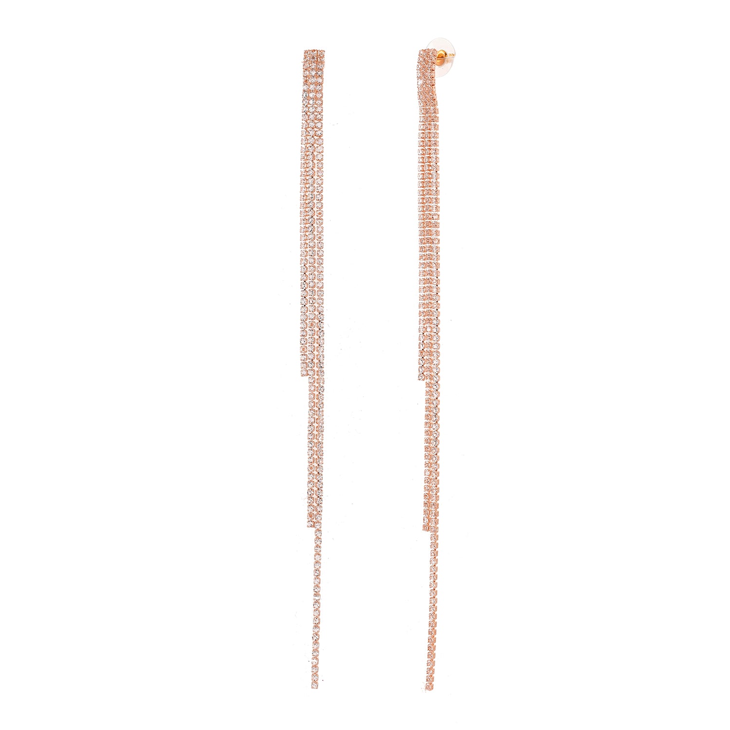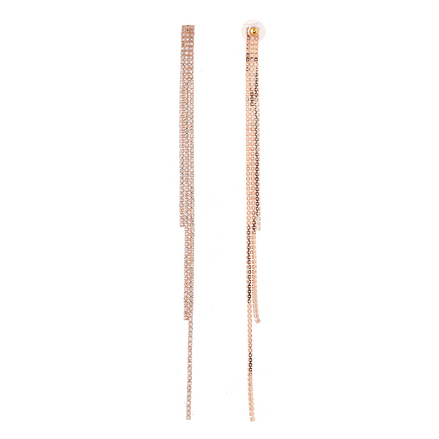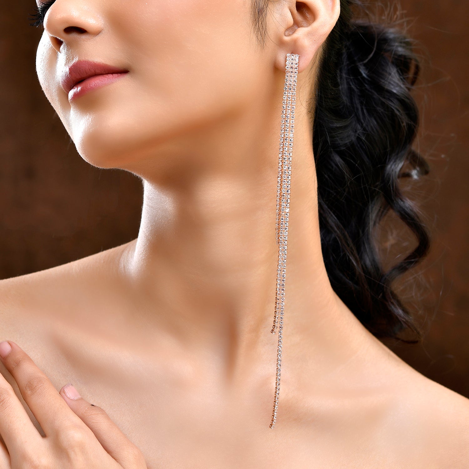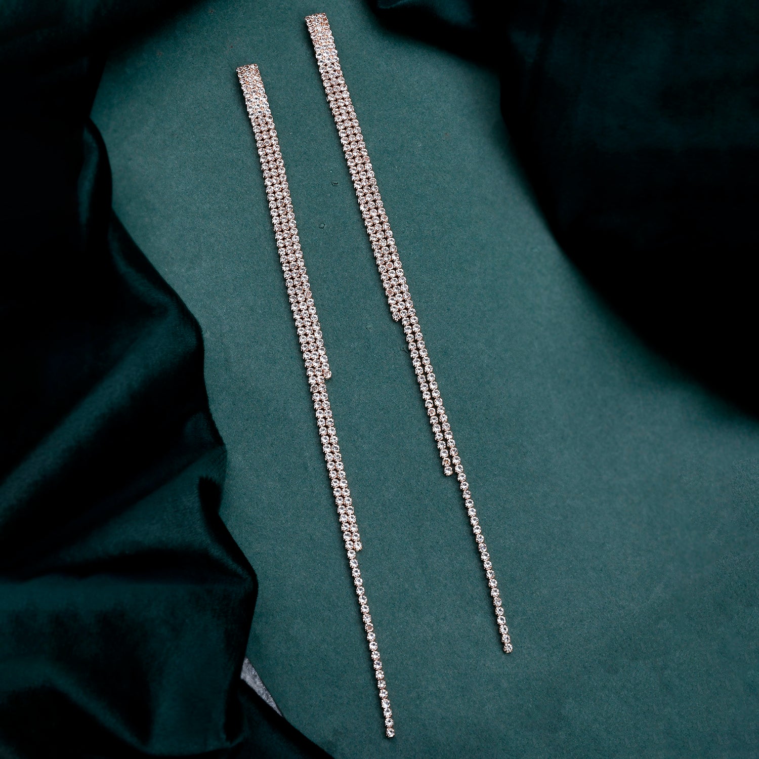 Elevate your style with "The Shimmering Shower" long rhinestone dangler earrings from our exclusive Timeless Sparkle collection. These exquisite earrings are meticulously crafted from high-quality brass and plated in luxurious rose gold, making them a stunning addition to any jewelry collection. Adorned with shimmering rhinestones, they effortlessly capture and reflect light, adding a touch of glamour to any ensemble. Perfect for weddings, festive occasions, and parties, these statement earrings are versatile enough for daily wear and vacations. Whether paired with western attire or festive outfits, they are sure to turn heads. Ideal as a gift for women on Valentine's Day, Diwali, Rakshabandhan, and Christmas, these earrings make a thoughtful present for your sister, girlfriend, wife, mother, or lover. Embrace the elegance and sophistication of these designer earrings and make every moment special.