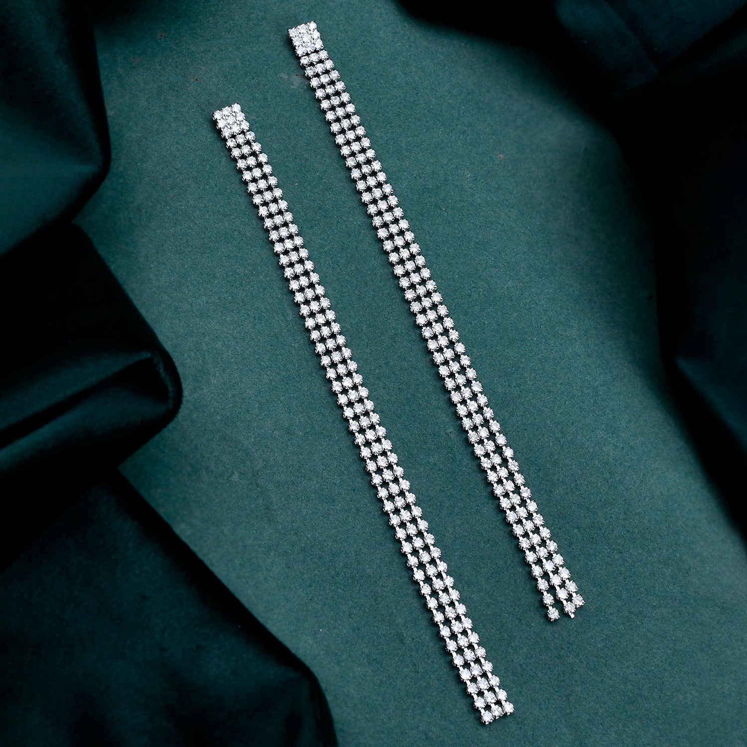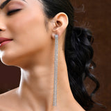 Elevate your elegance with the Twinkling Cascade Long Rhinestone Dangler Earrings, a stunning addition to the Timeless Sparkle collection. These designer earrings are meticulously crafted from high-quality brass and plated in radiant white rhodium, ensuring durability and a lasting shine. The cascading design features multiple rows of shimmering rhinestones that catch the light beautifully, making them perfect for any occasion, from daily wear to festive celebrations. Their versatile style complements both western and traditional outfits, making them an ideal choice for weddings, parties, vacations, and more. These statement earrings are not only a trendy accessory but also a thoughtful gift for women on special occasions like Valentine's Day, Diwali, Rakshabandhan, Christmas, and New Year. Surprise your loved ones—be it your sister, girlfriend, wife, or mother—with these exquisite earrings that symbolize timeless beauty and sophistication.