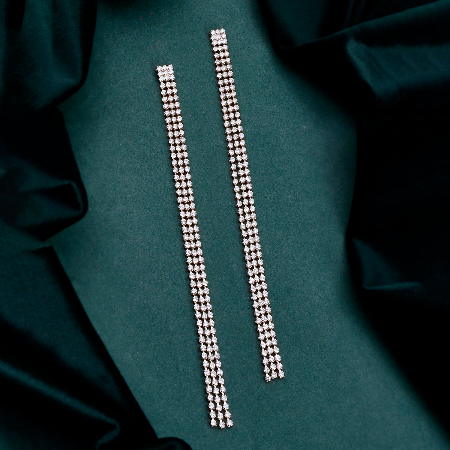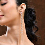 Elevate your elegance with the Twinkling Cascade Long Rhinestone Dangler Earrings, a stunning addition to the Timeless Sparkle collection. These designer earrings are meticulously crafted from high-quality brass and plated in luxurious rose gold, ensuring durability and a lasting shine. The cascading design features multiple rows of shimmering rhinestones that catch the light beautifully, making them perfect for any occasion, from daily wear to festive celebrations. Their versatile style complements both western and traditional outfits, making them an ideal choice for weddings, parties, vacations, and more. These statement earrings are not only a trendy accessory but also a thoughtful gift for women on special occasions like Valentine's Day, Diwali, Rakshabandhan, Christmas, and New Year. Surprise your loved ones—be it your sister, girlfriend, wife, or mother—with these exquisite earrings that symbolize timeless beauty and sophistication.