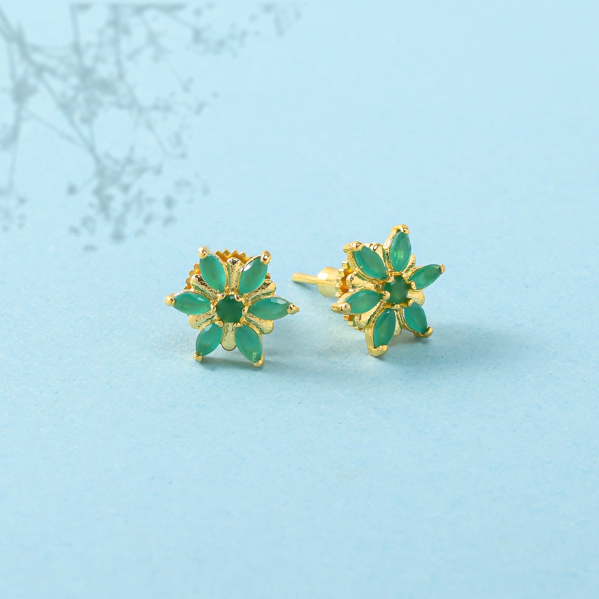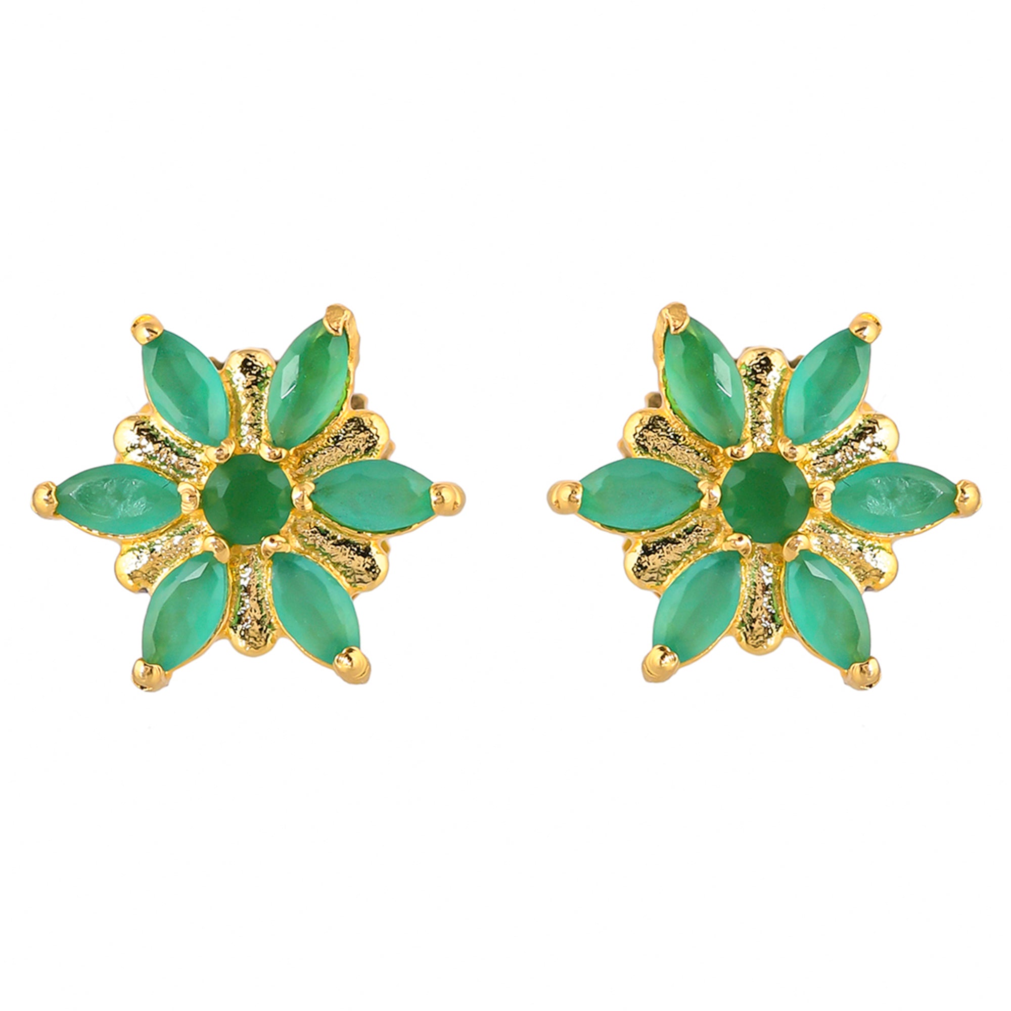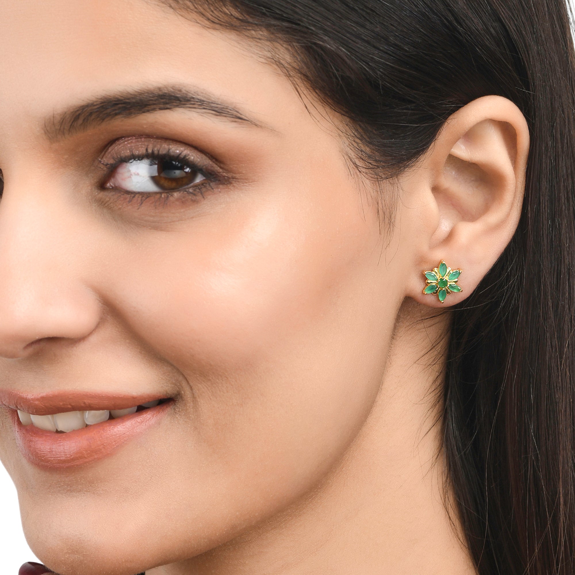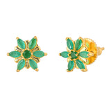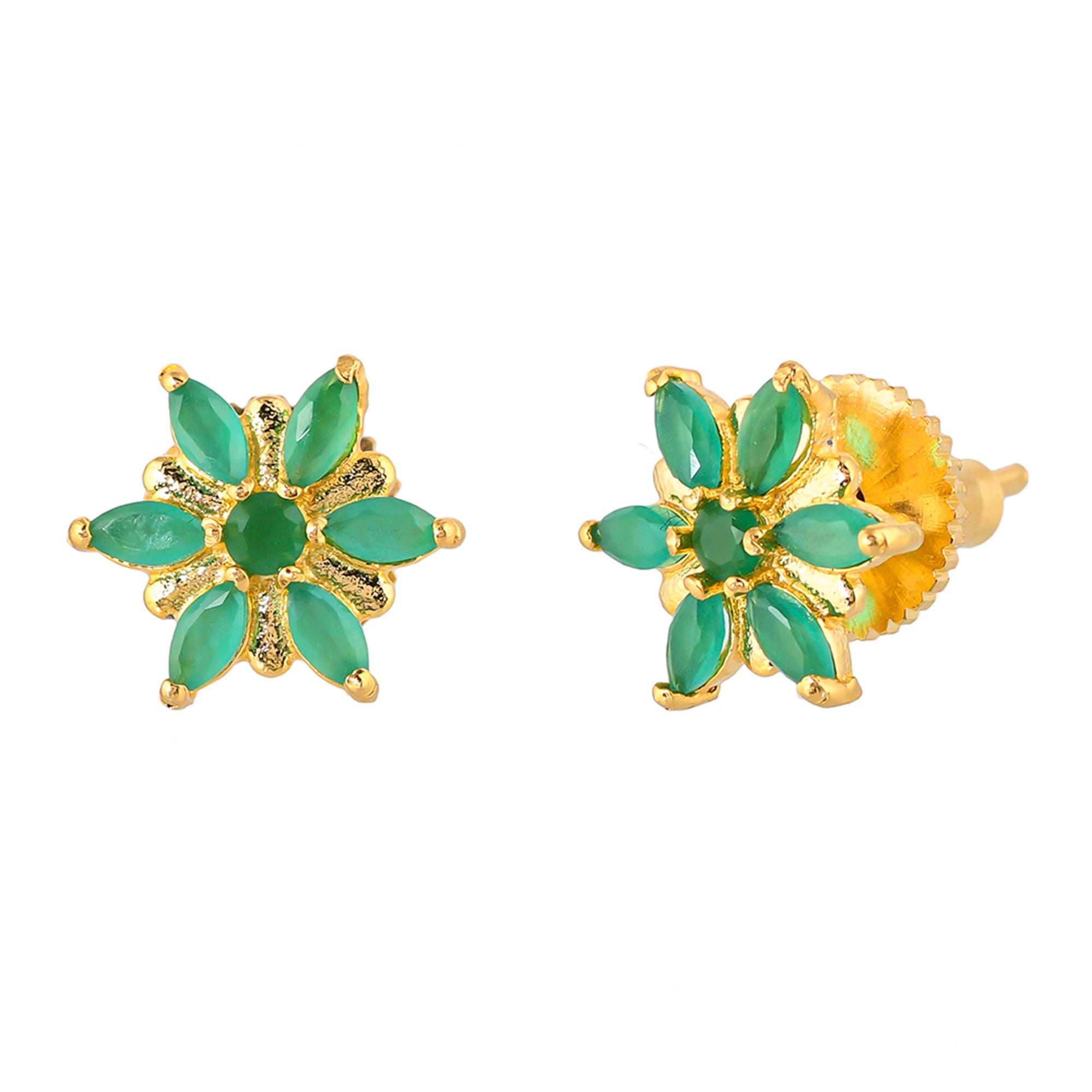 Tiny floral stud earrings with green zirconia gemstones. Made from brass and gold plated. Pair with casual attire.