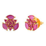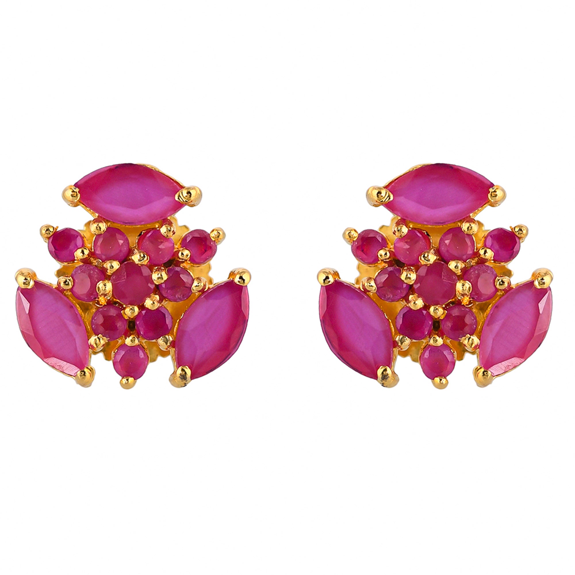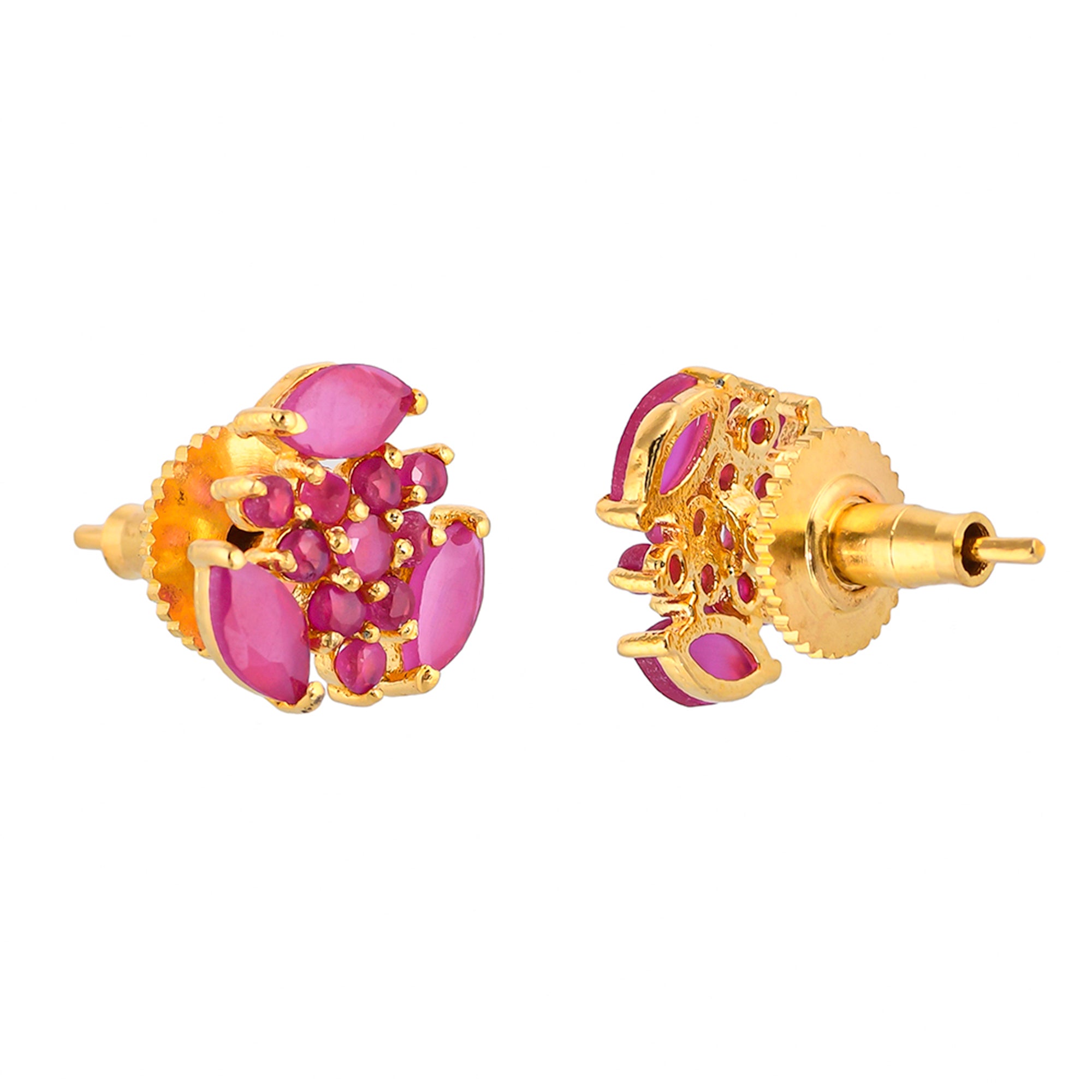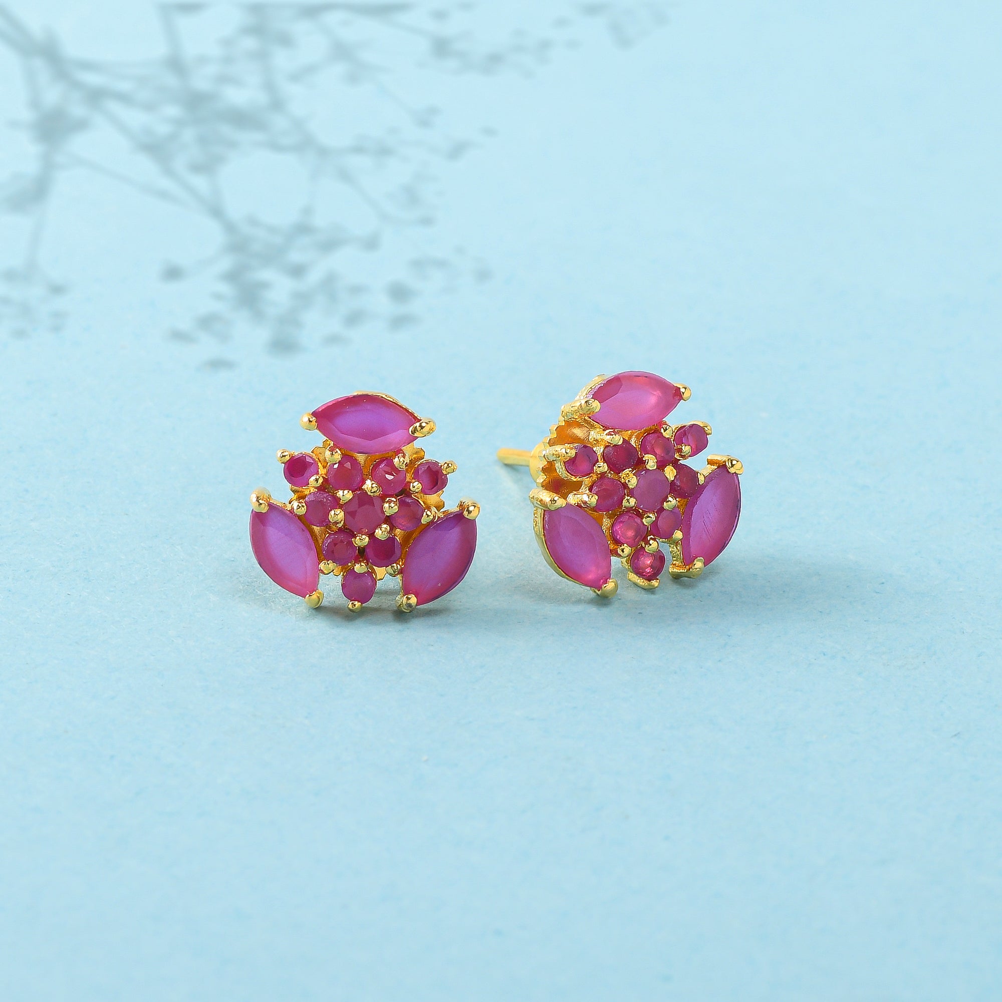 Tiny brass stud earrings with pink zirconia gemstones. Gold plated, lightweight and versatile.