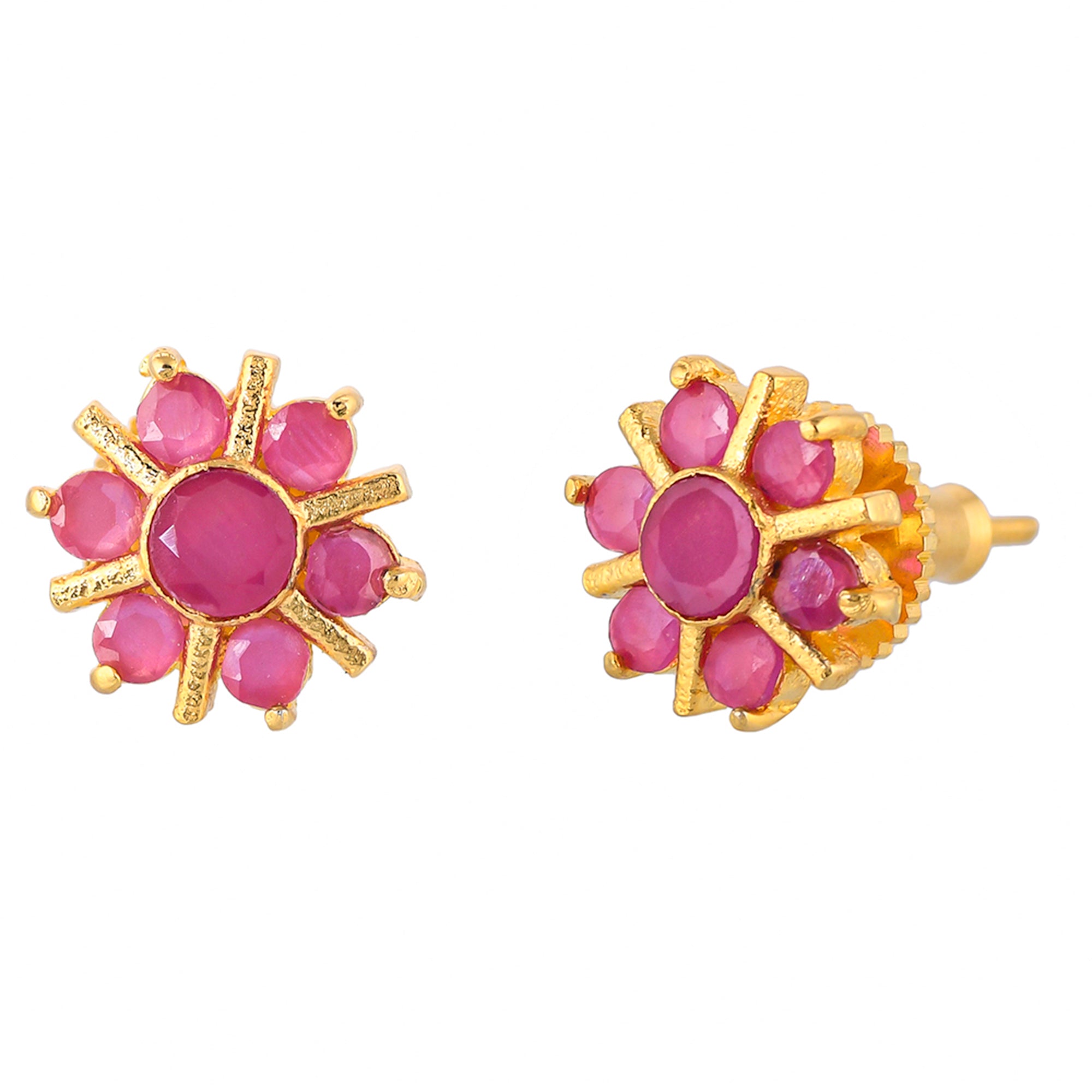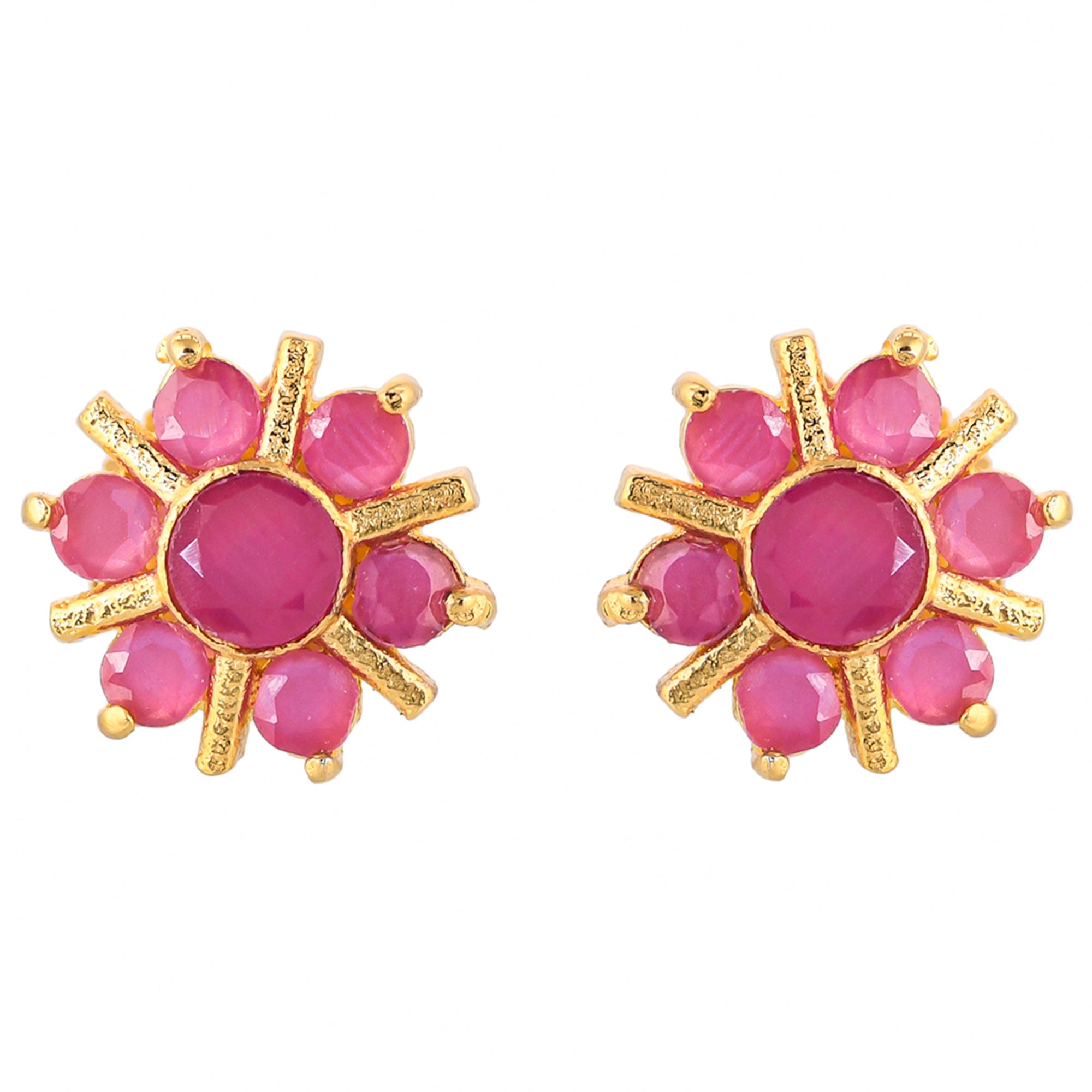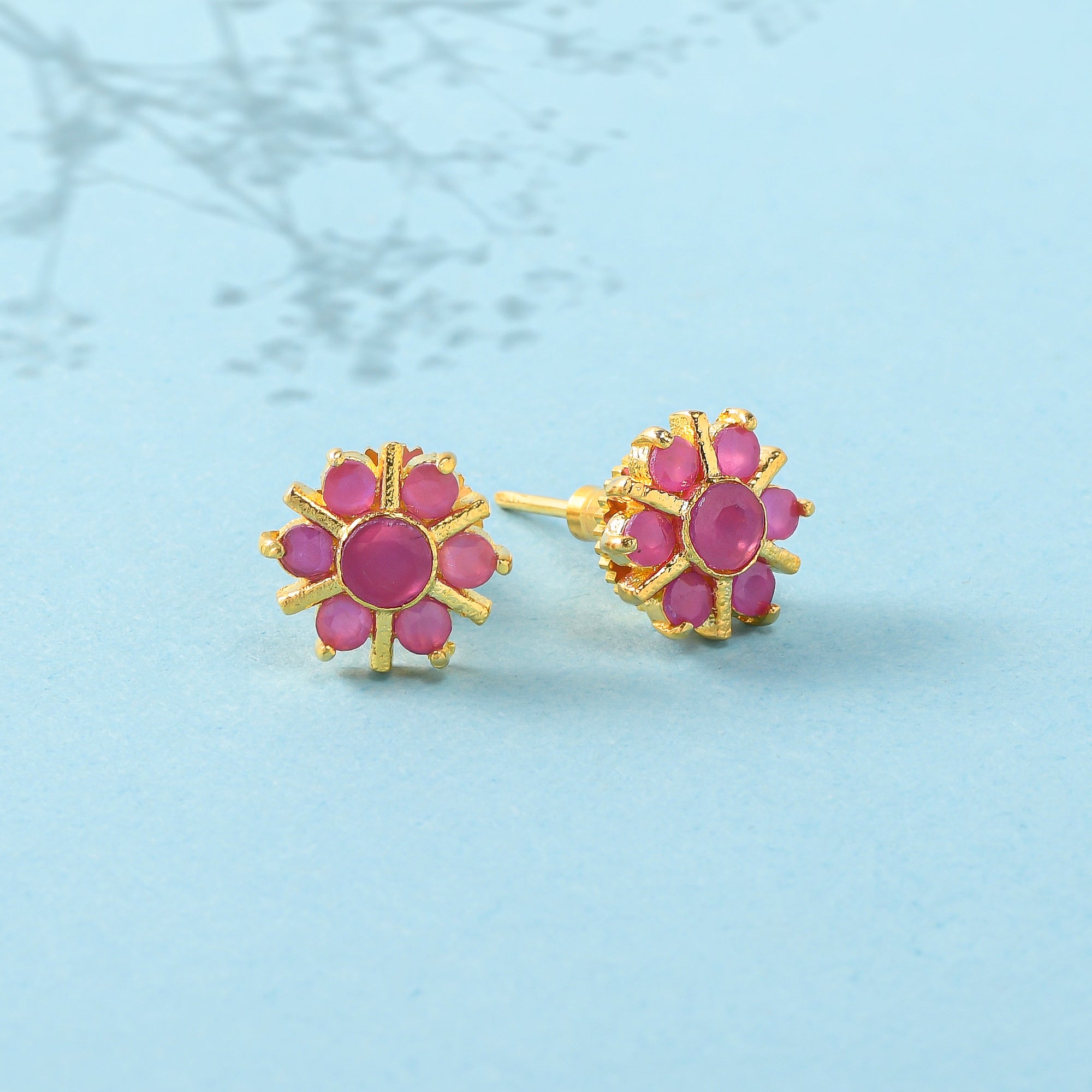 Tiny stud earrings with cluster setting pink CZ gems. Made from brass and gold plated. Pair with casual attire.