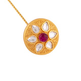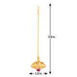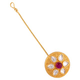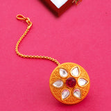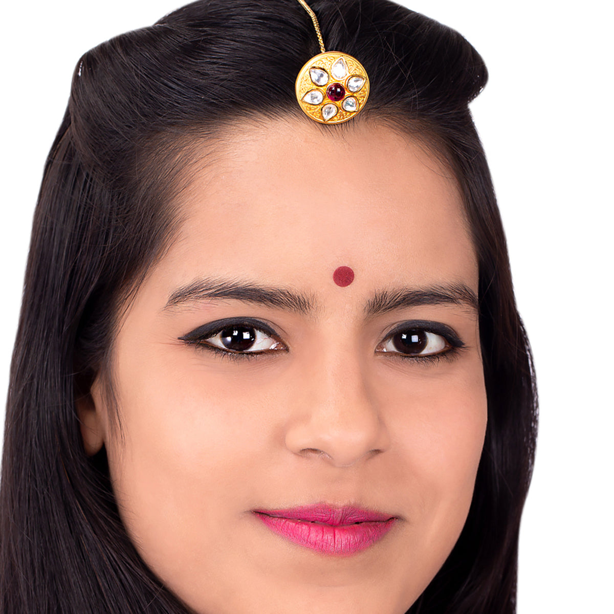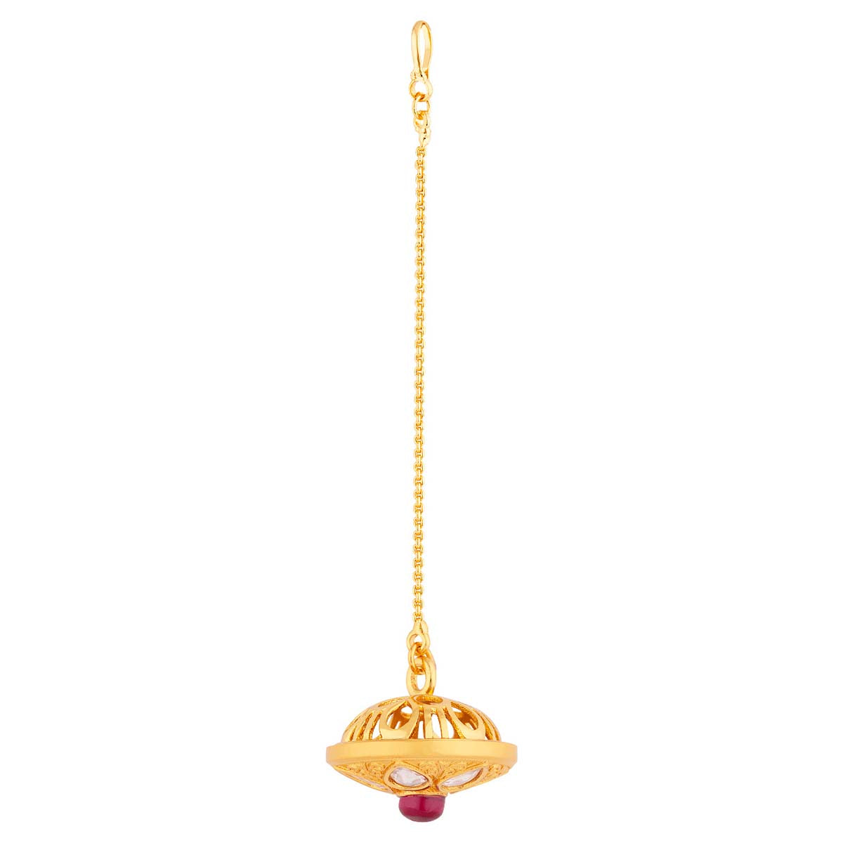 Brass borla maang tika with yellow gold plating. Faux kundan gems adorned and good for formal Indian looks. This piece of jewelry comes with the Voylla assurance of quality and durability.