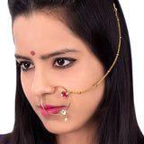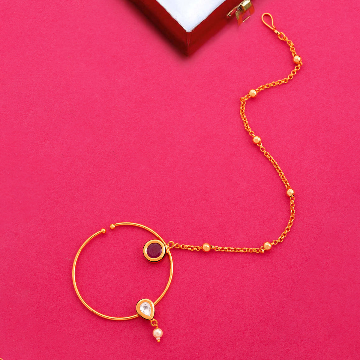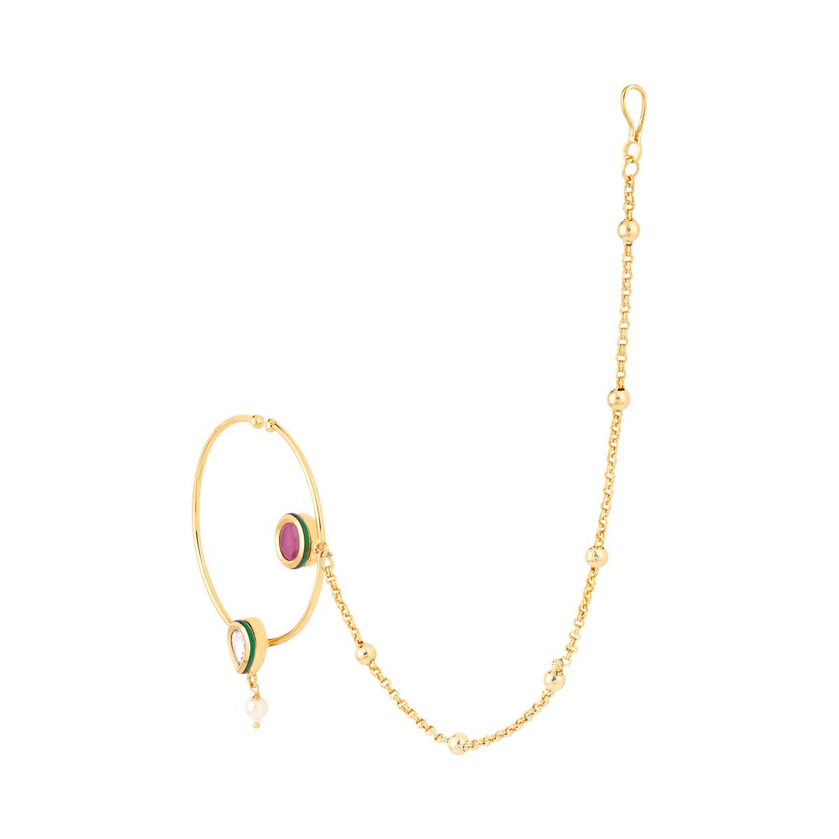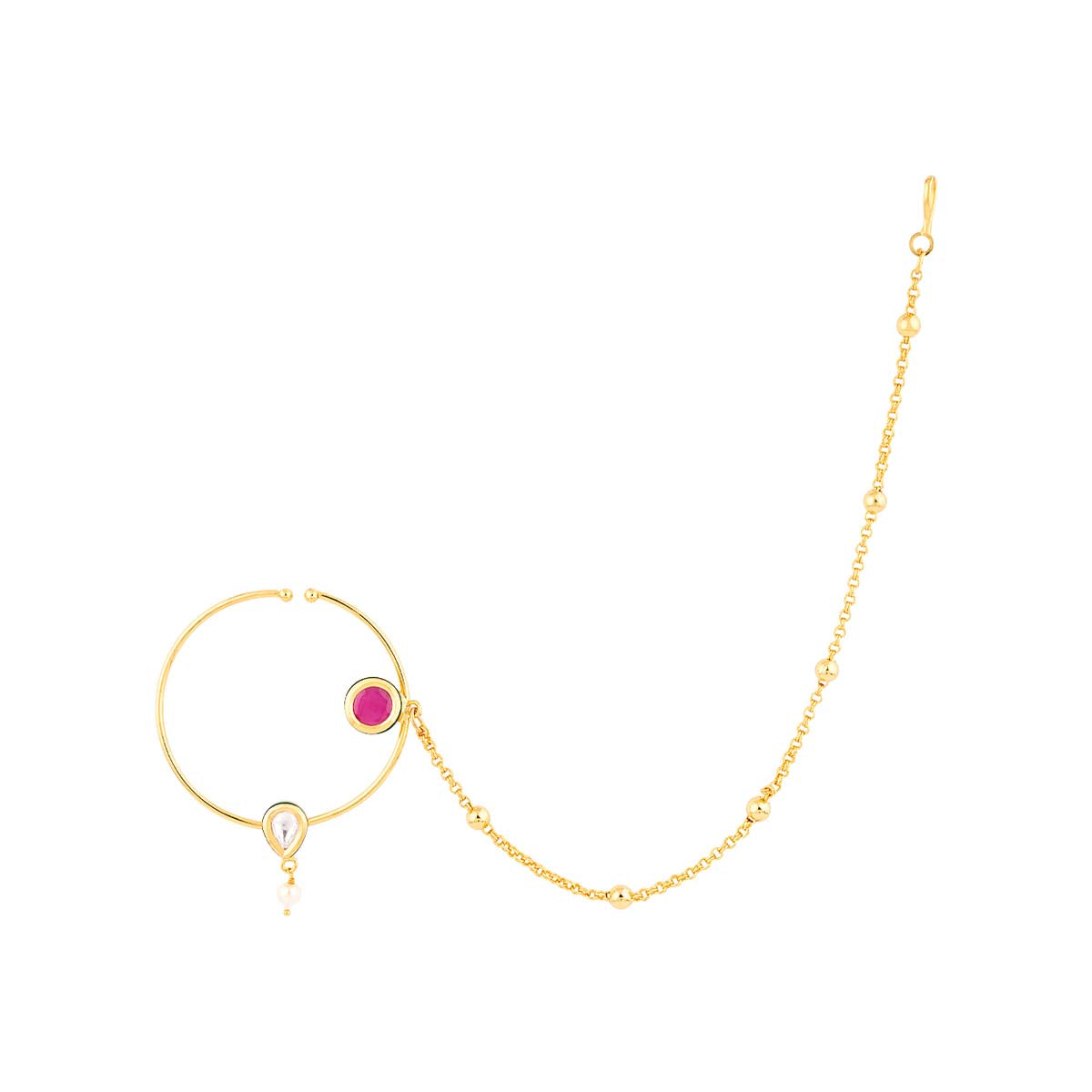 Traditional faux kundan gems adorned nath nose pin. Made from brass and yellow gold plated. Wear with formal Indian outfits. This piece of jewelry comes with the Voylla assurance of quality and durability.
