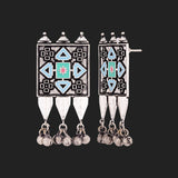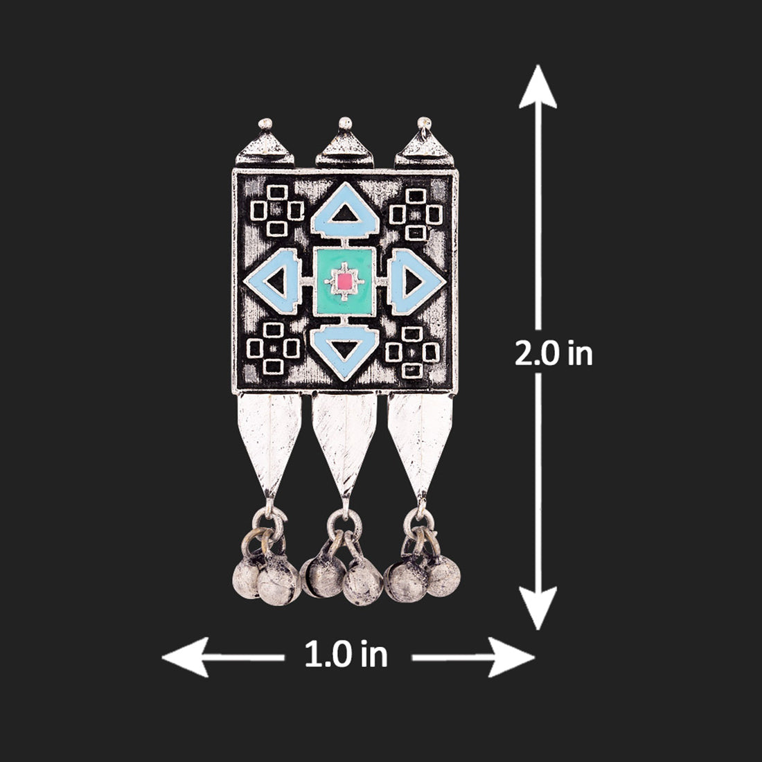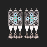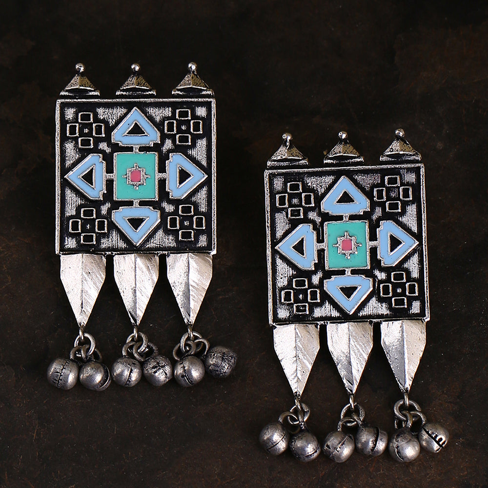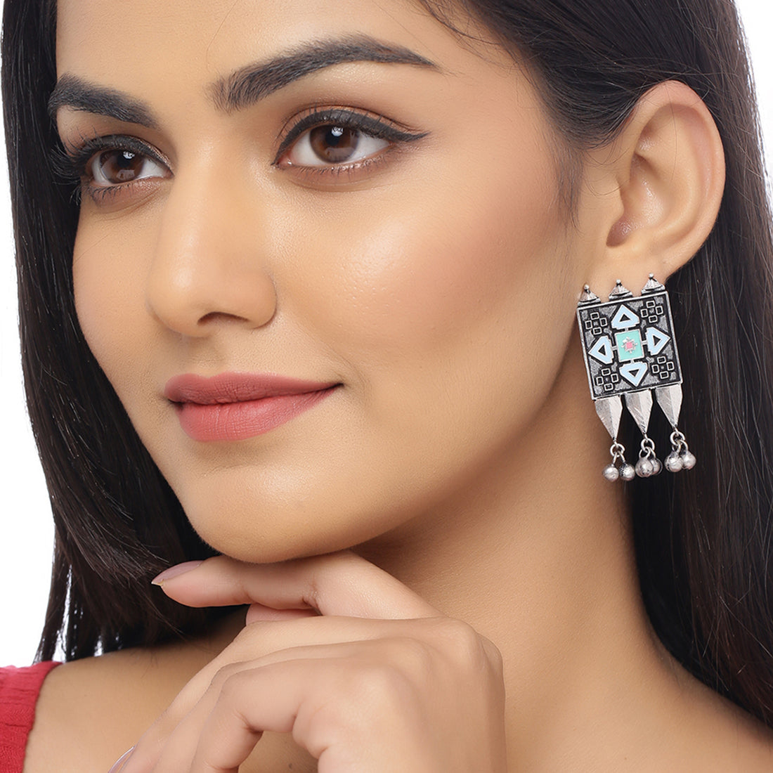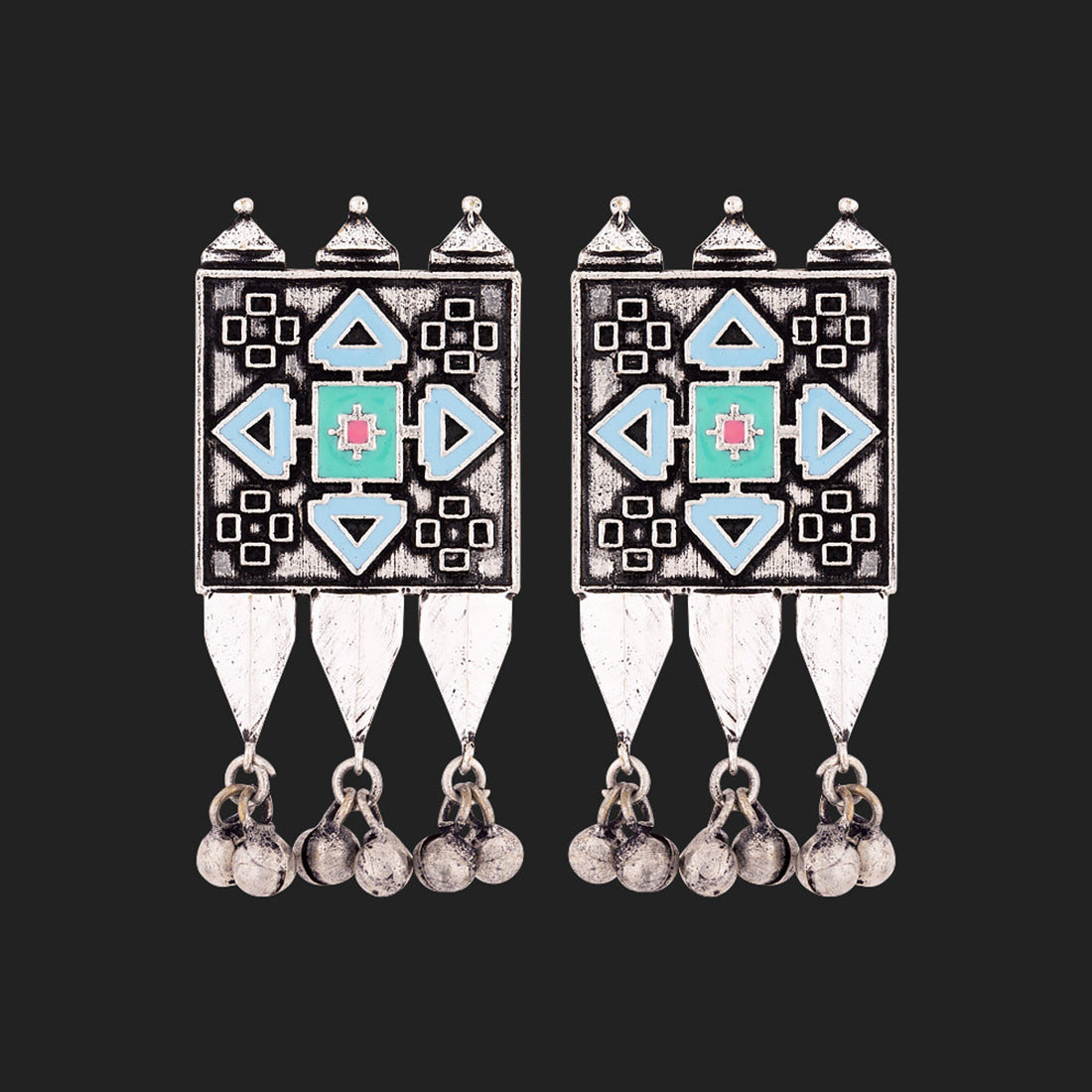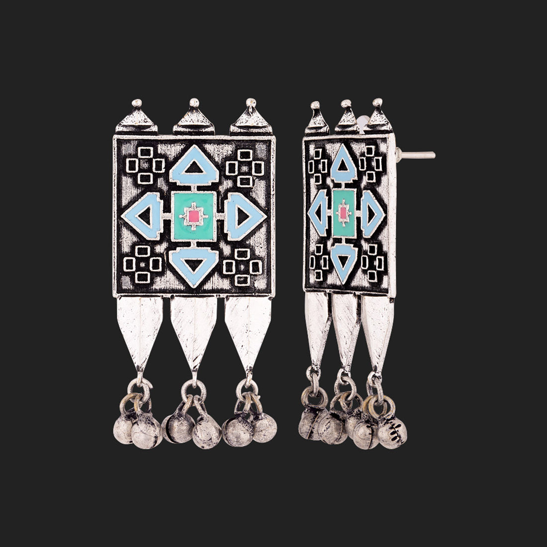 Lightly embellished brass earrings, embossed with motifs inspired by antique Indian jewelry trunks that were opulent and decorative. Enameled and oxidised plated, the comfortable and lightweight earrings are good for casual and semi-casual ethnic looks.