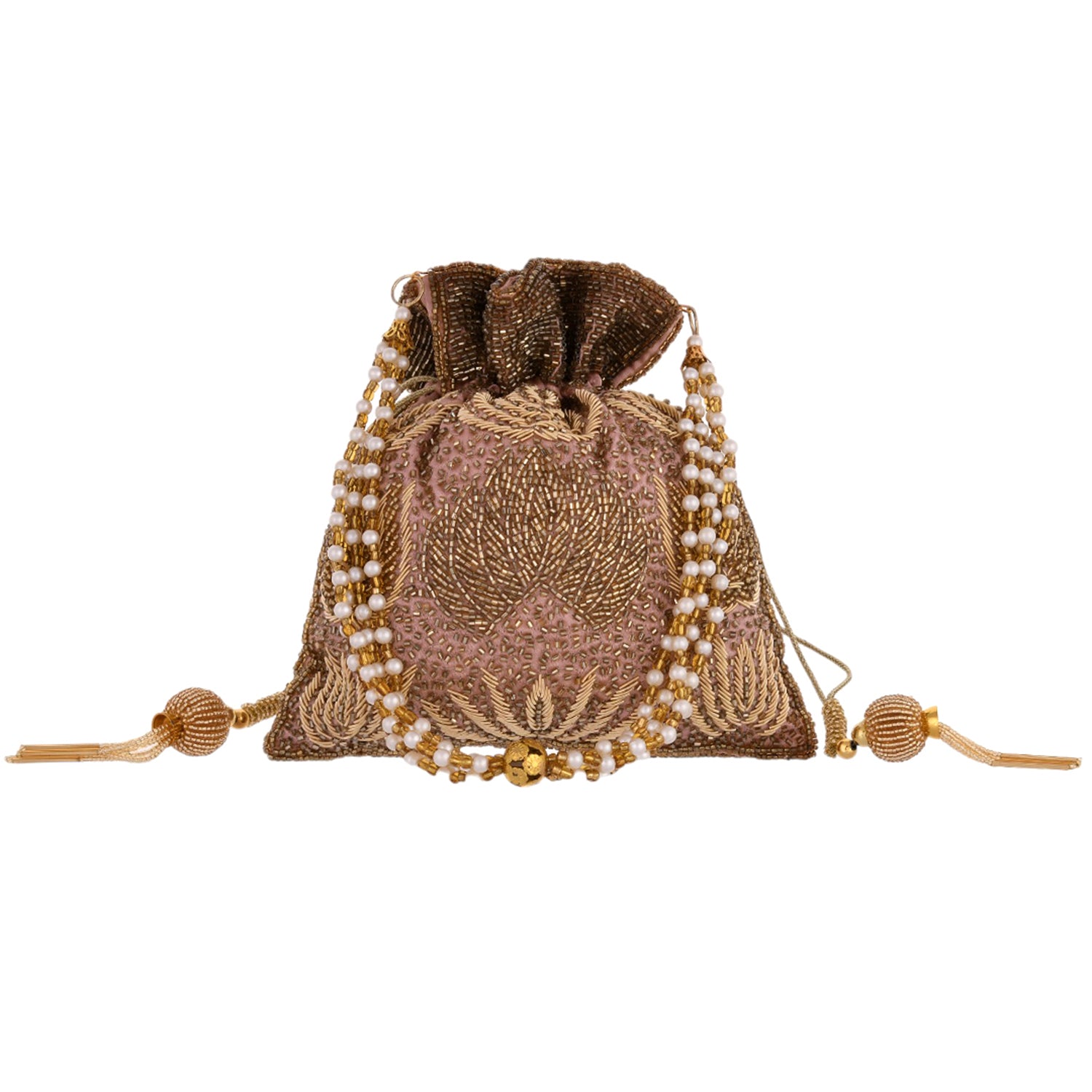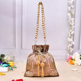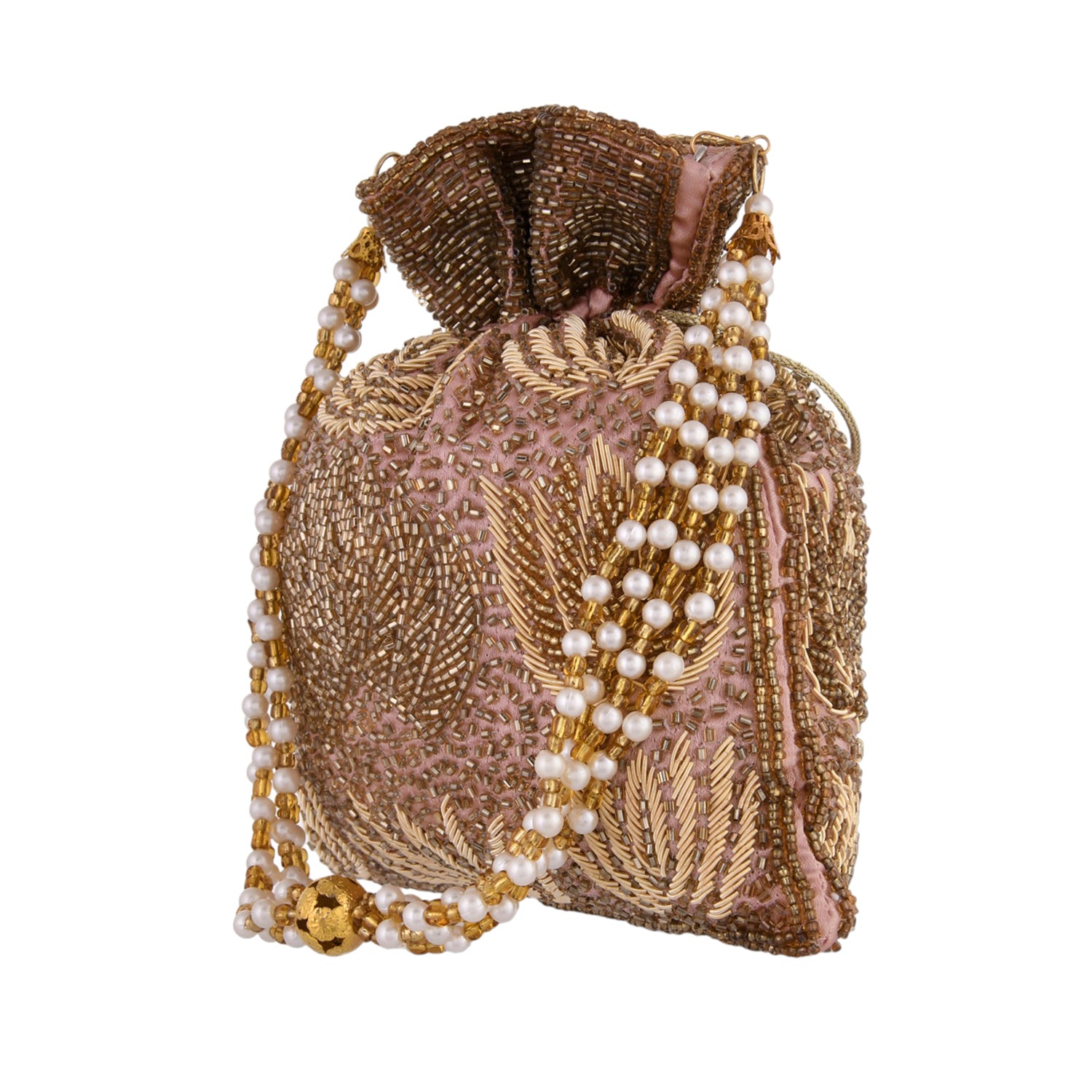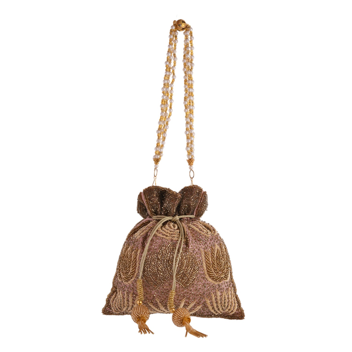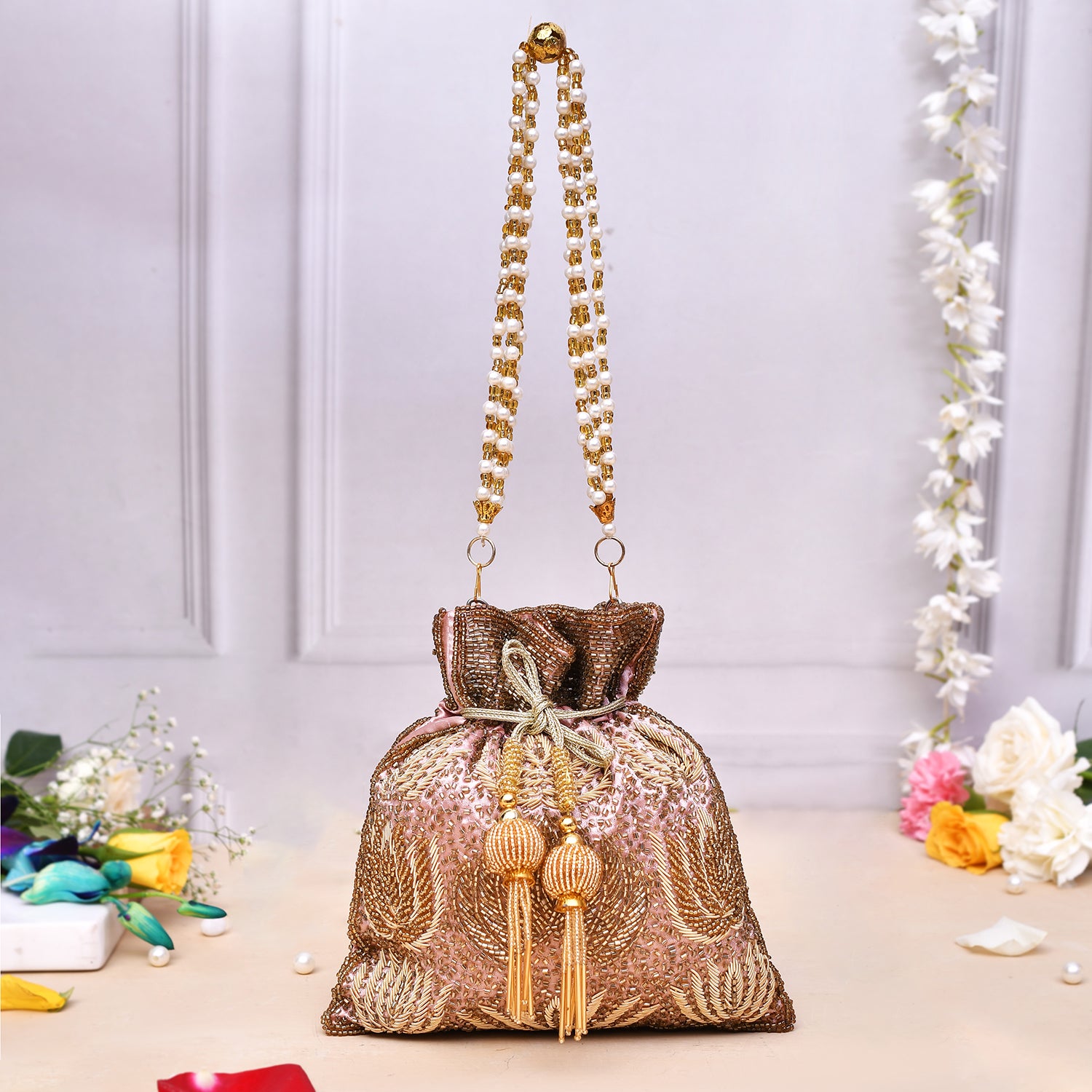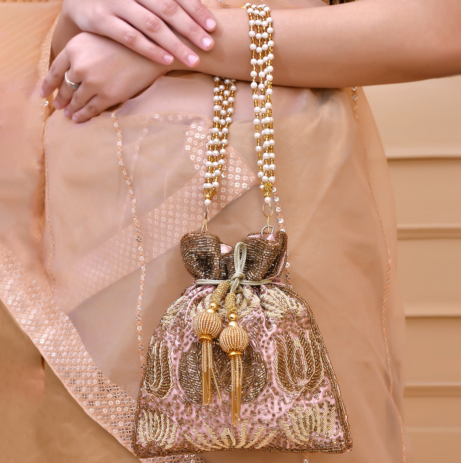 Adorned with intricate golden beads, this potli is a celebration of traditional charm and contemporary style. The timeless allure of the golden beads complements the versatile design, making it an ideal accessory for ethnic party wear. The beaded short sling adds a touch of sophistication, ensuring you carry your essentials with grace and style.