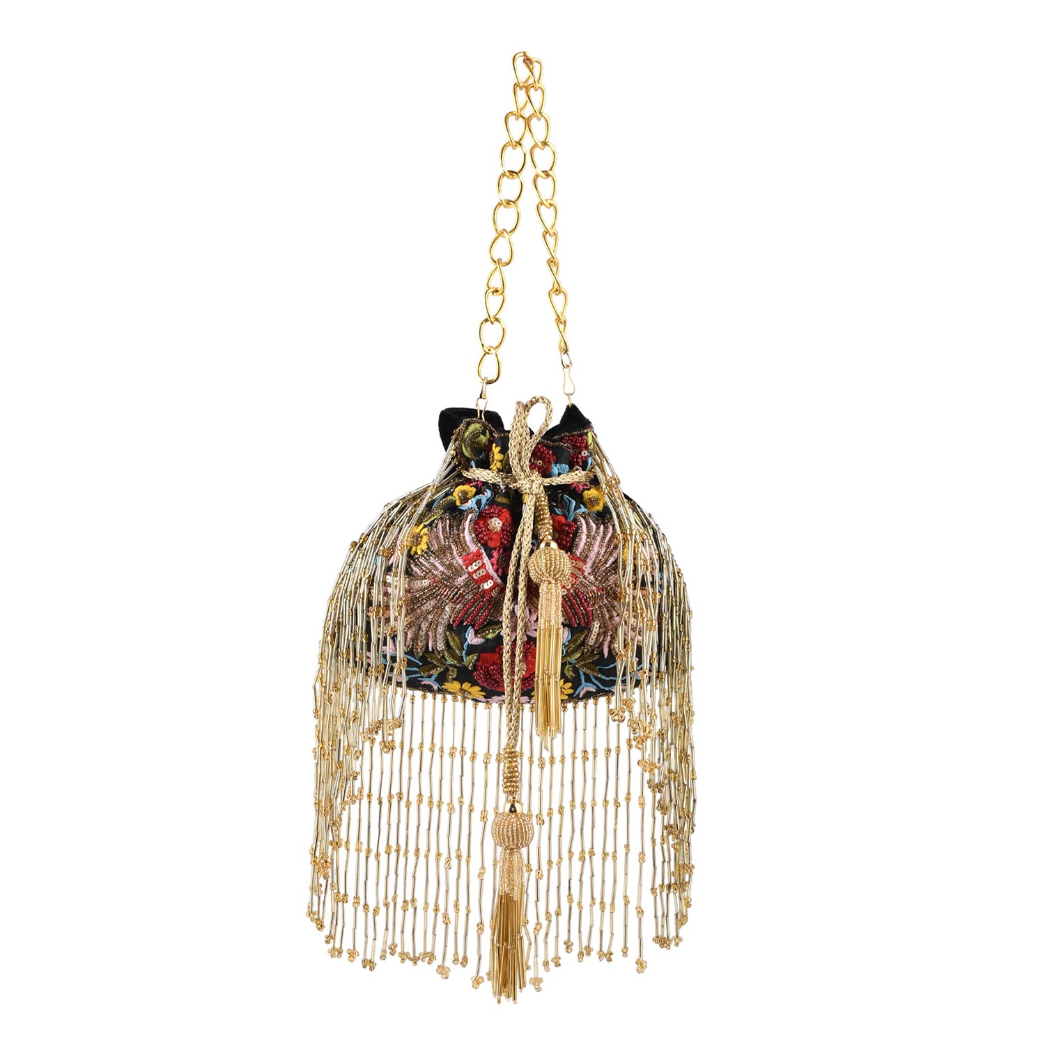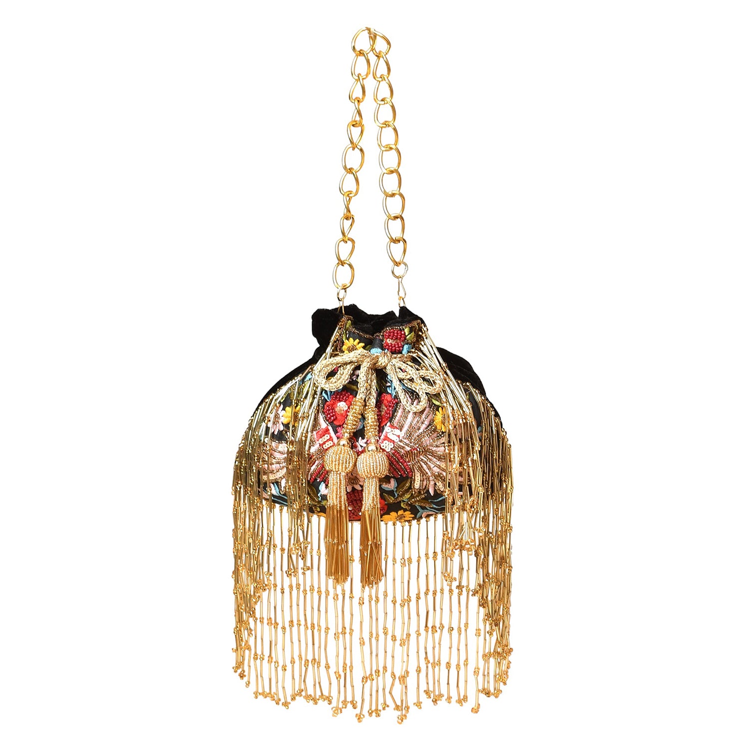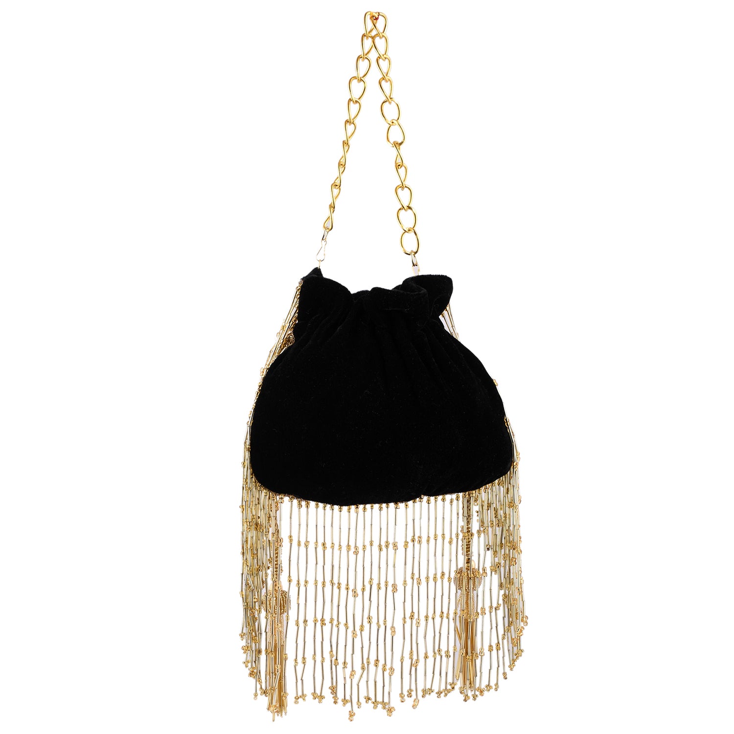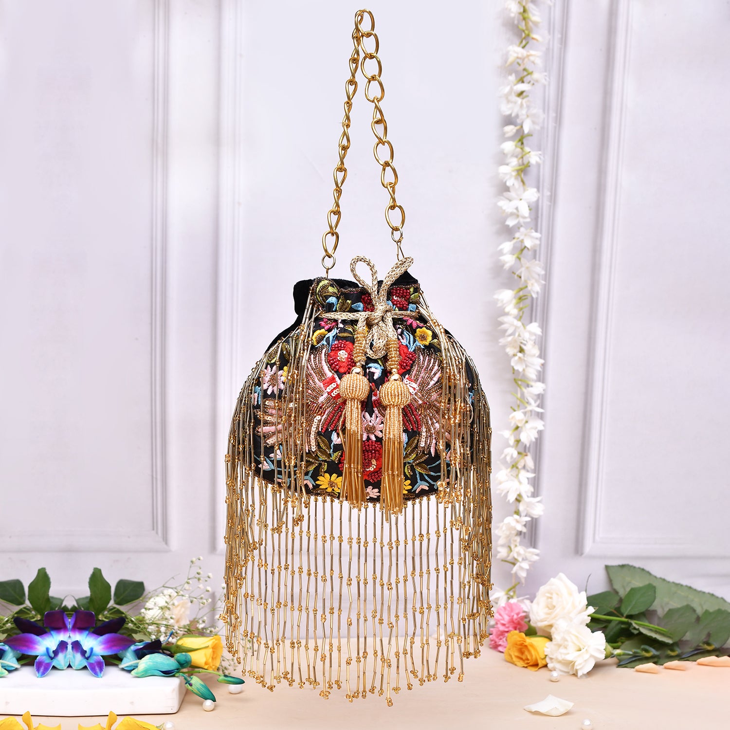 Trendy Bags Multicolored Sequins Embellished Tasseled Black Potli
