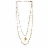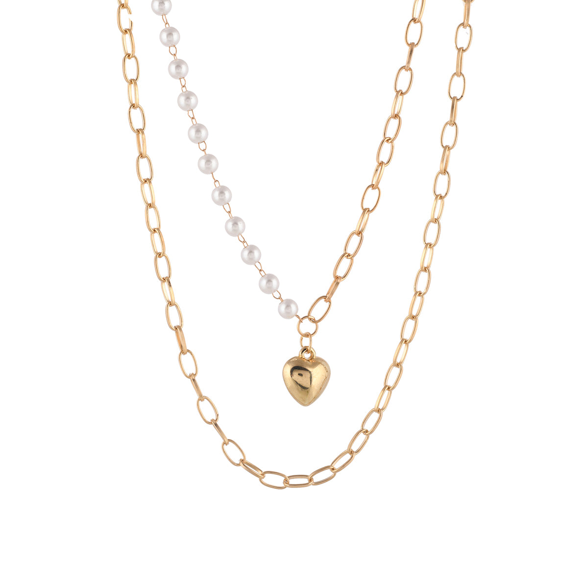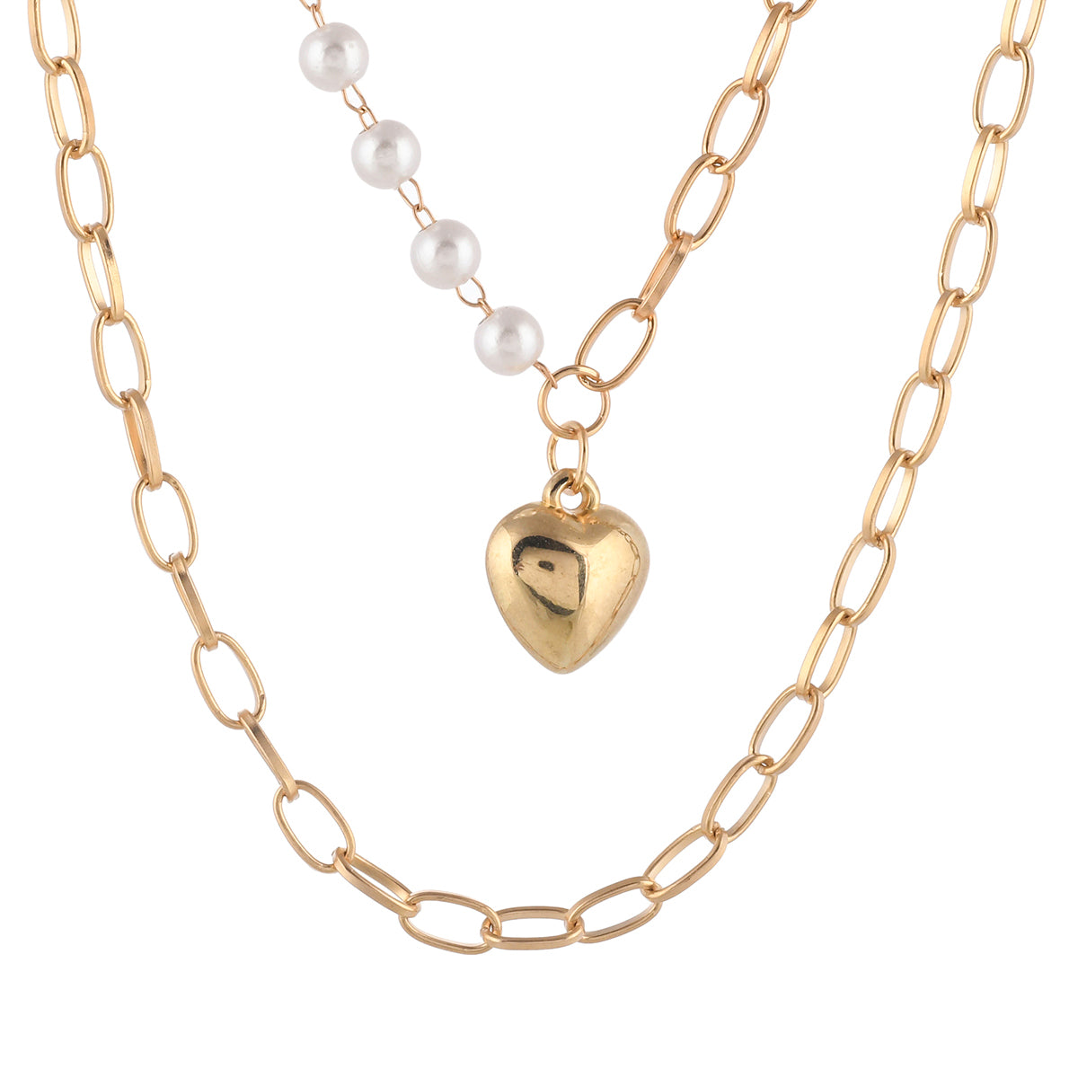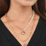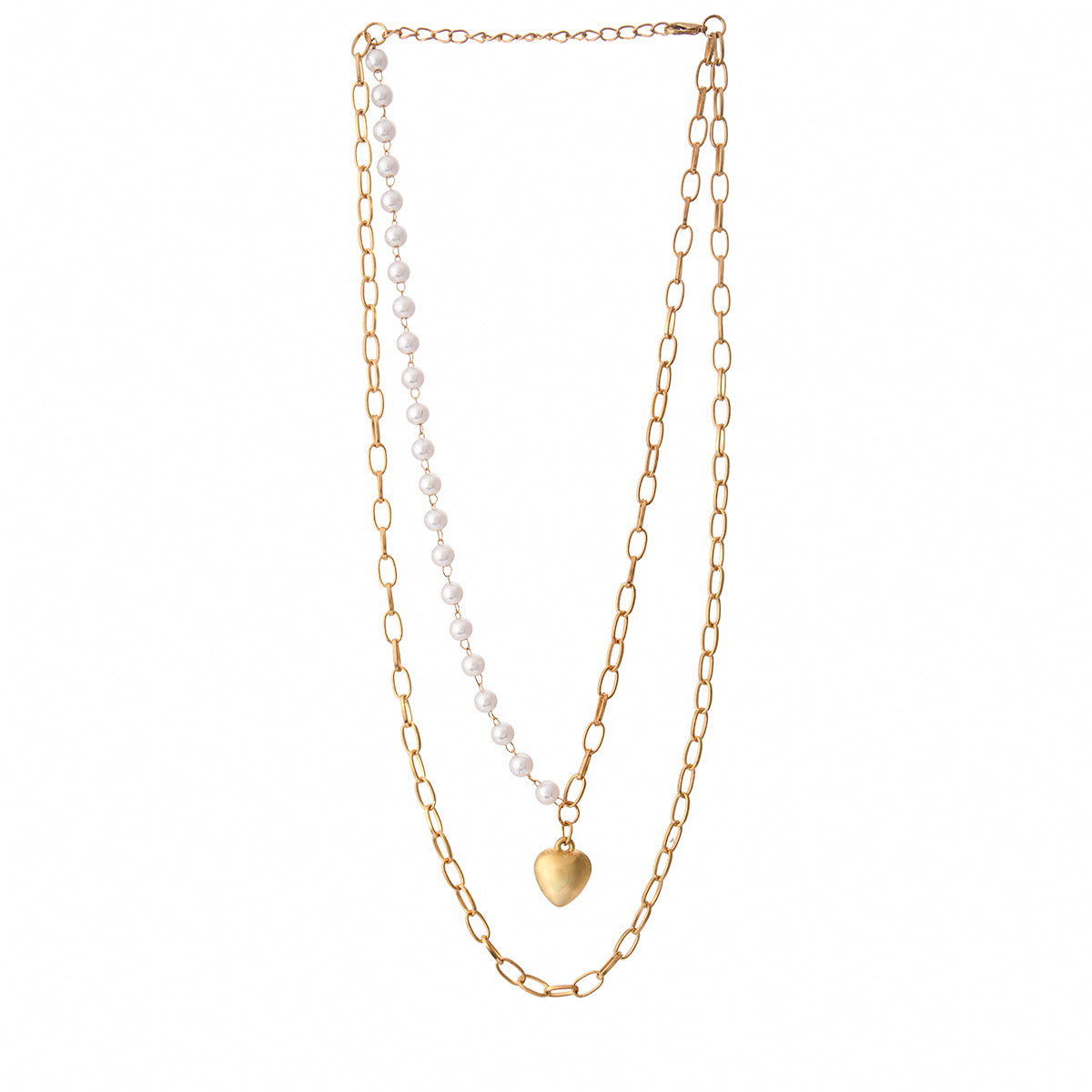 Trendy Essentials Faux Pearls Heart Motif Brass Gold Plated Link Chain Necklace