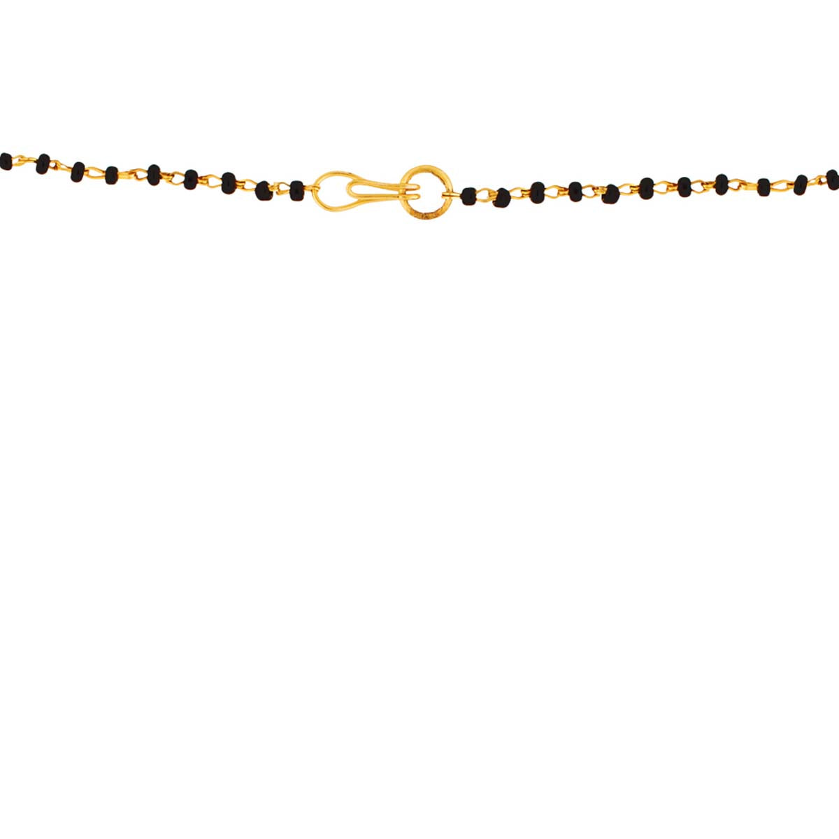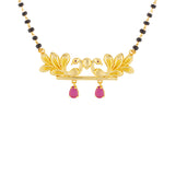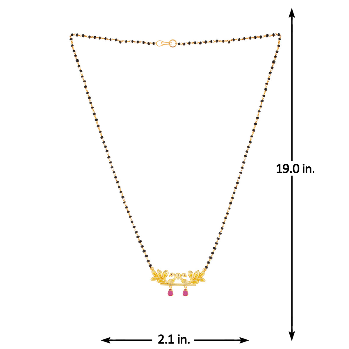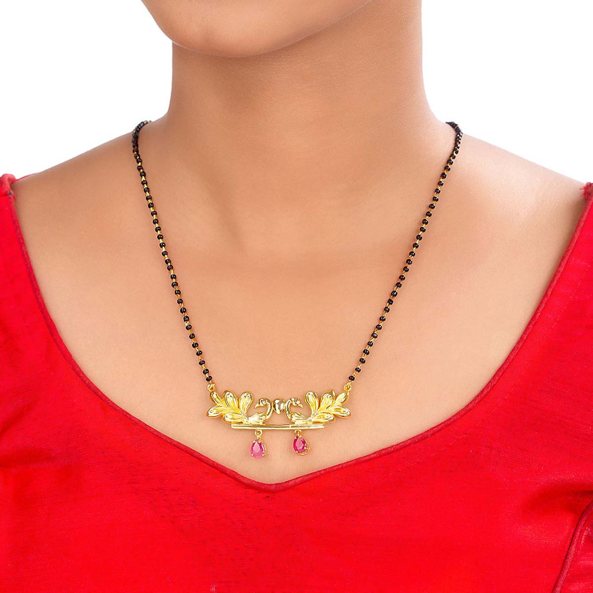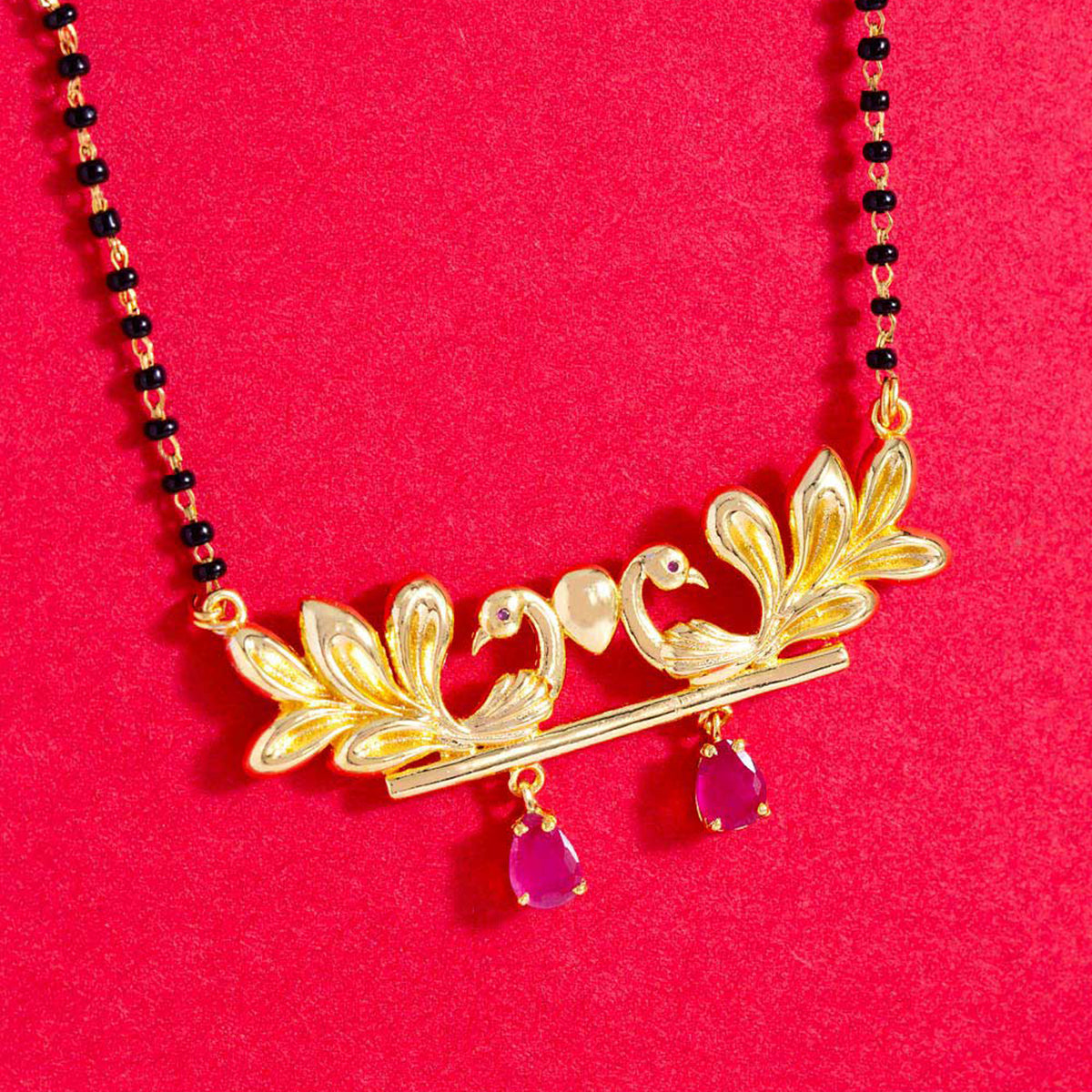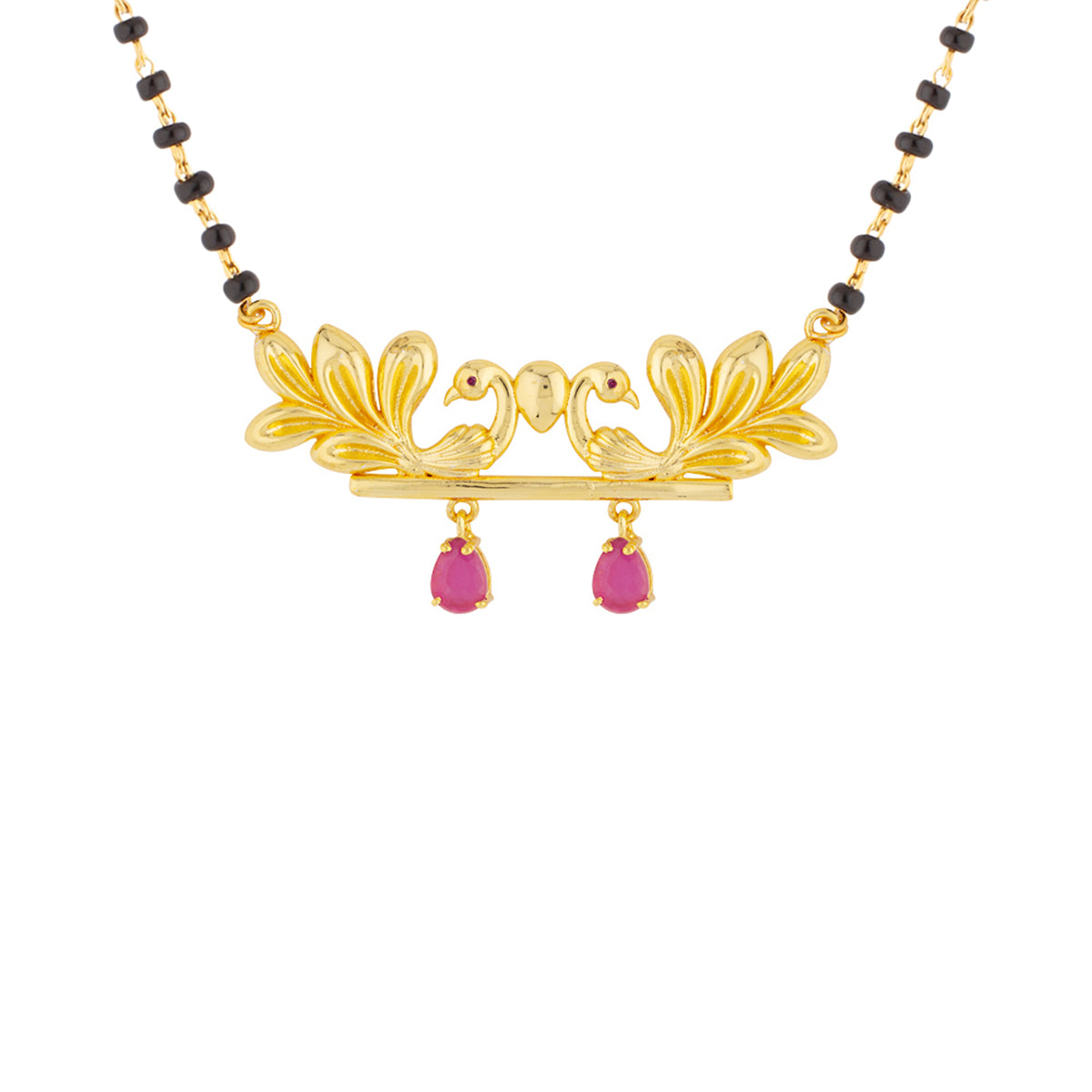 Adorned with peacock motifs and teardrop cut gems, this brass mangalsutra has been given a yellow gold plating. Pair with a saree or ethnic skirt.