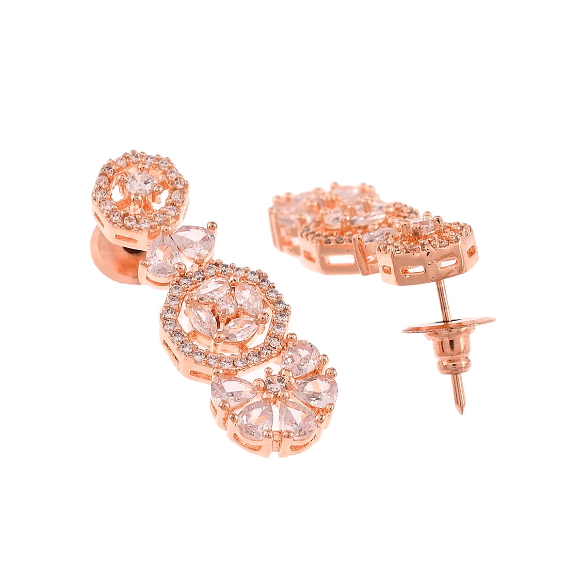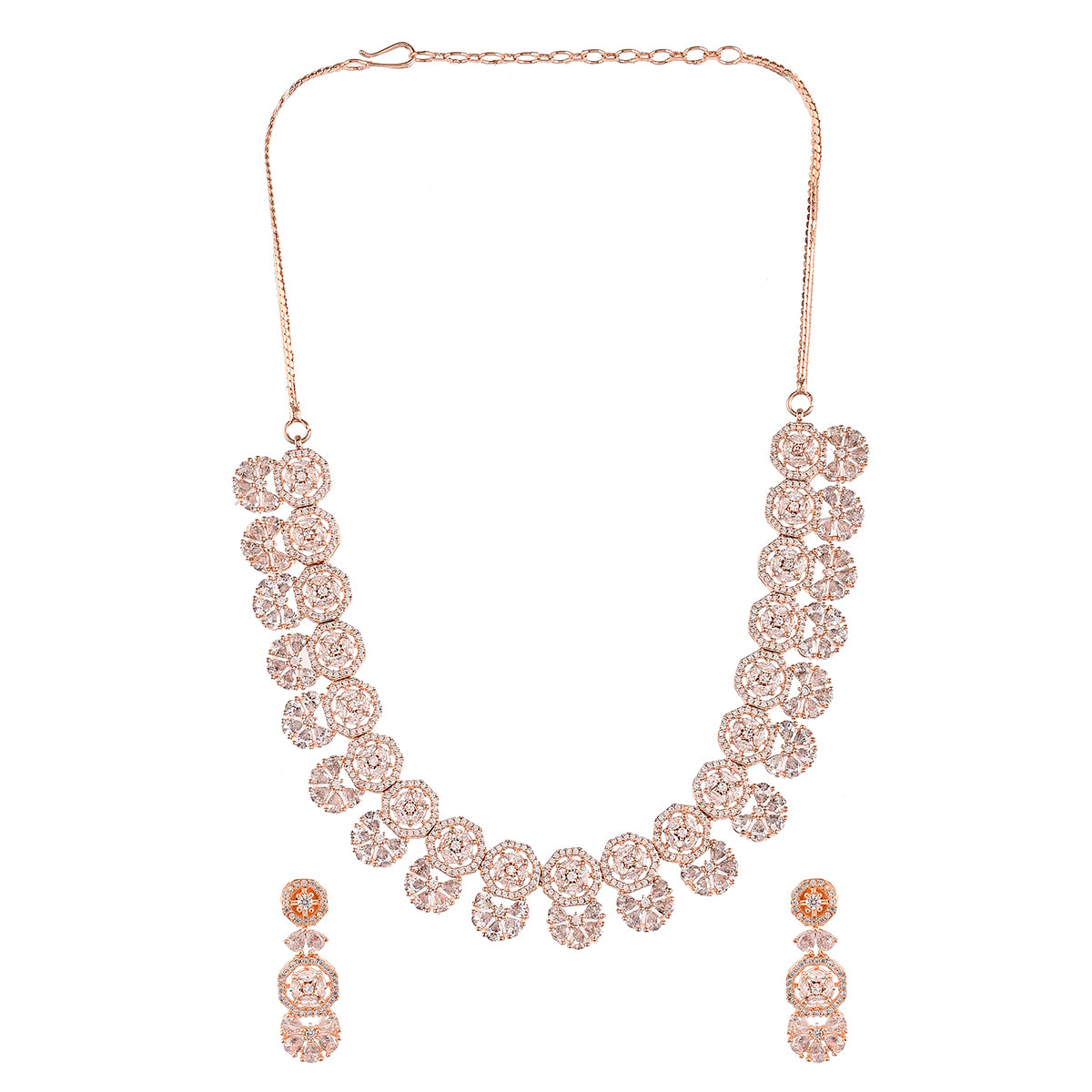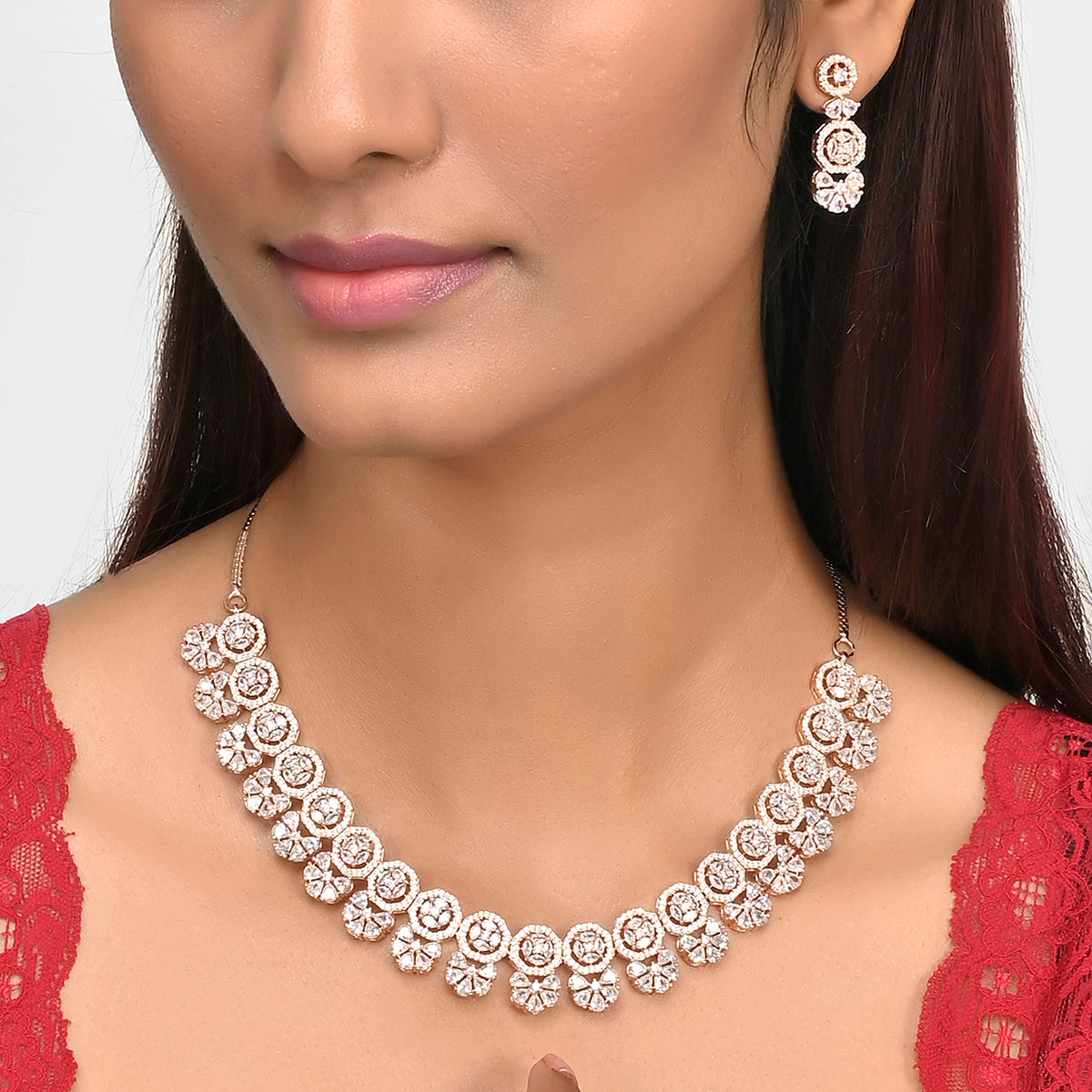 Embellished with cubic zirconia gemstones in triangle and round cuts, this jewellery set has been fashioned out of quality brass. The long necklace and drop earrings have been given a lovely silver plating. The set can be paired with formal looks of all kinds, for any occasion.