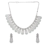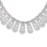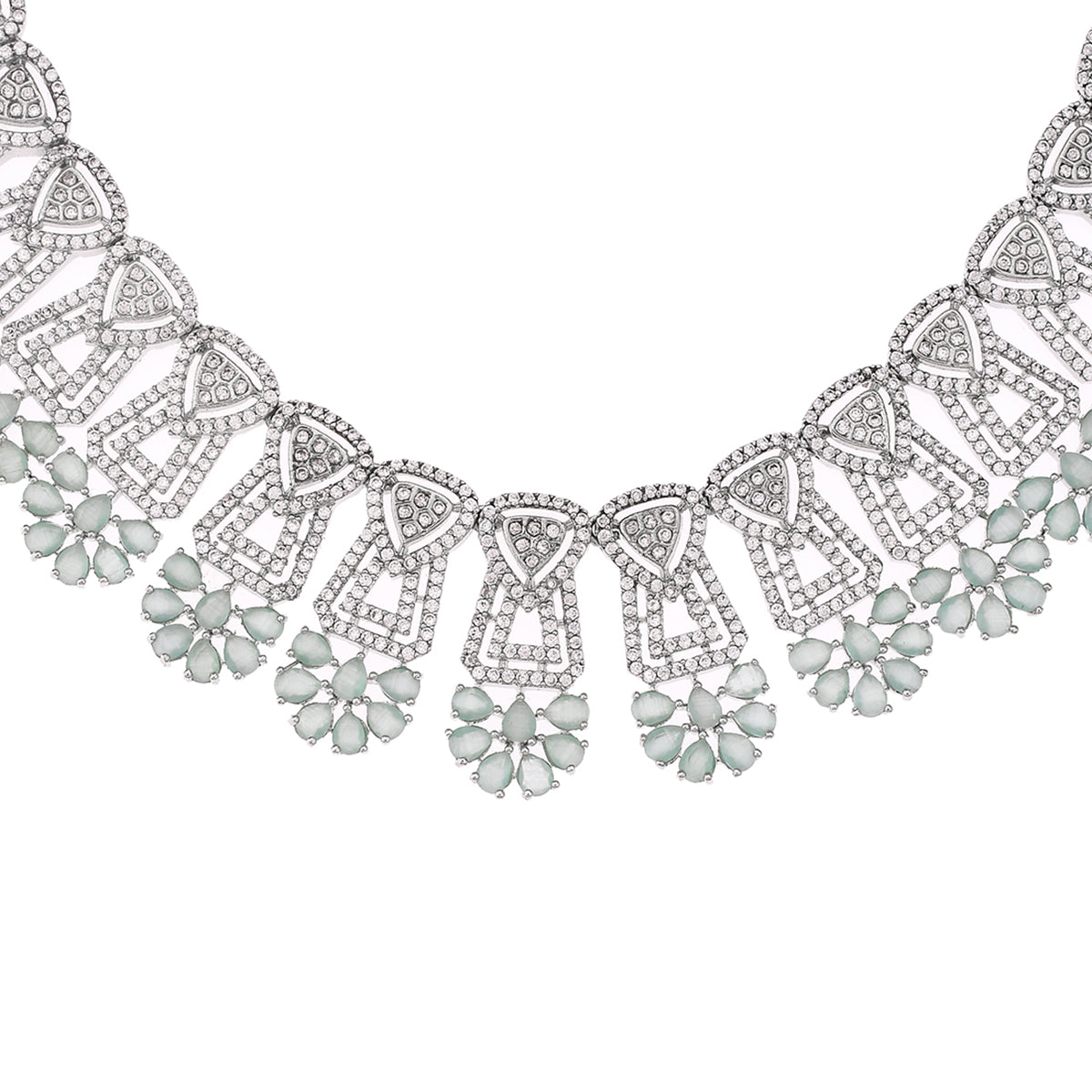 Brass jewellery set, embellished heavily with triangle cut cubic zirconia gemstones in a classic cluster setting. Silver plating adds to the charm of this set, which promises to be a comfortable wear at all times. Pair with a designer saree.