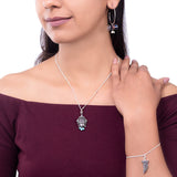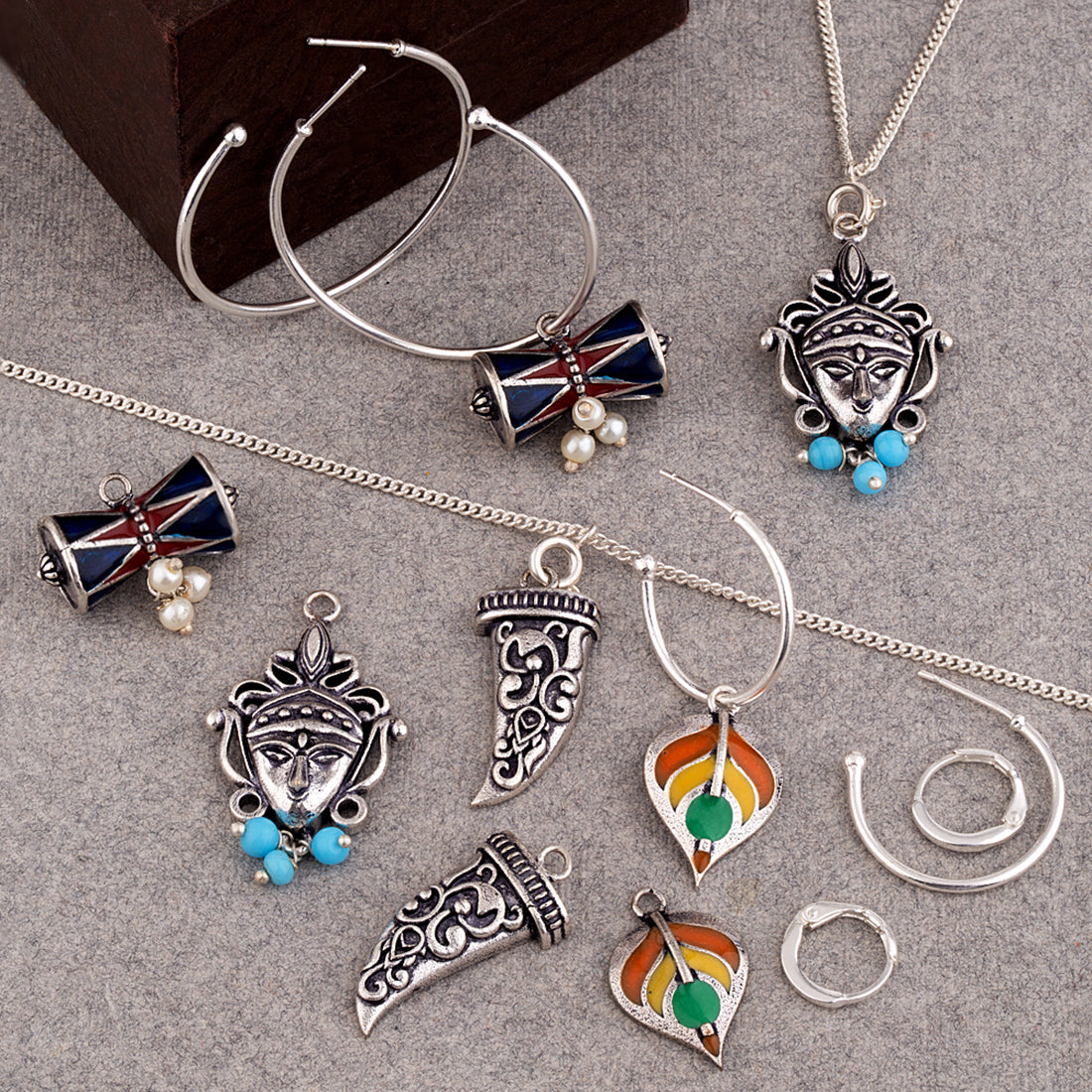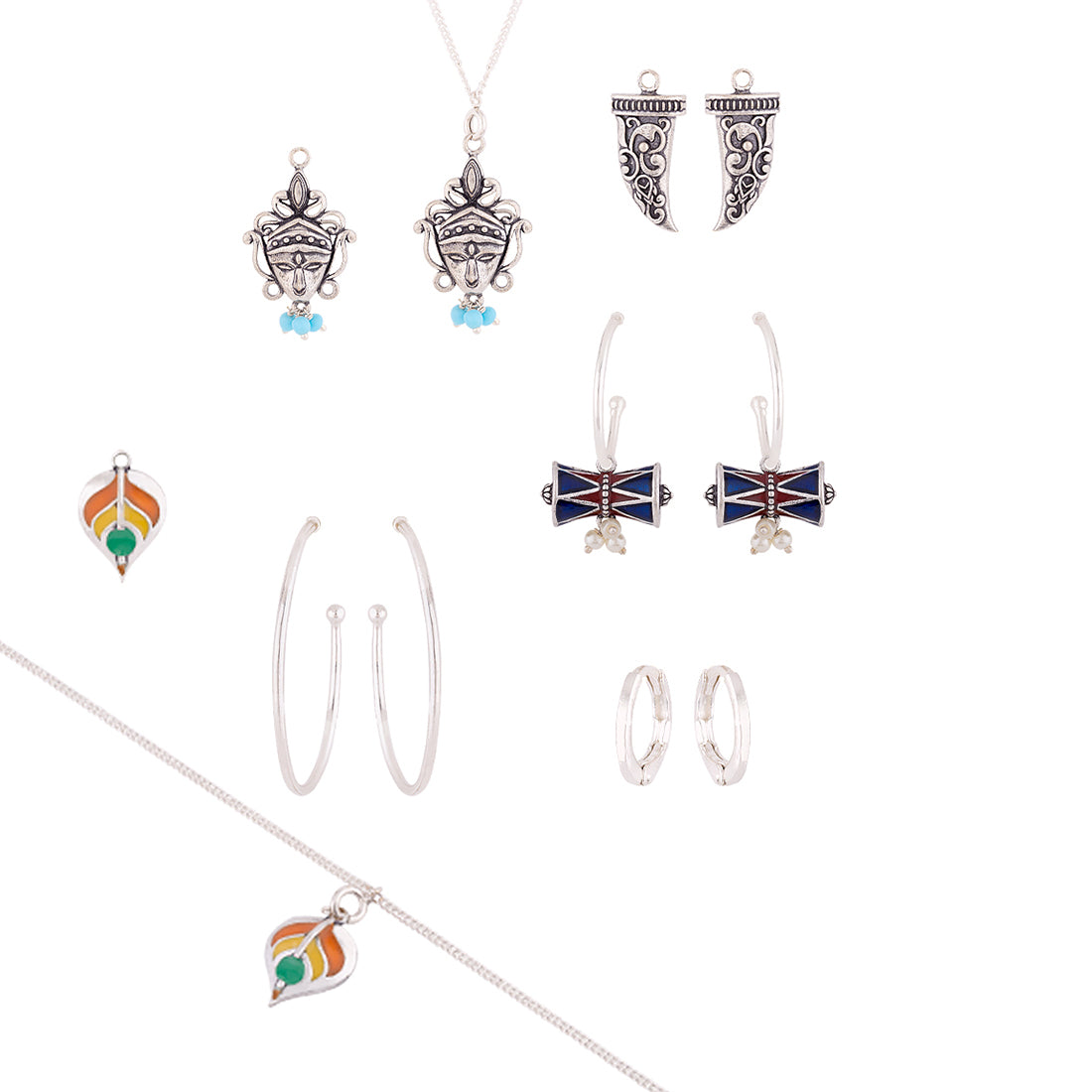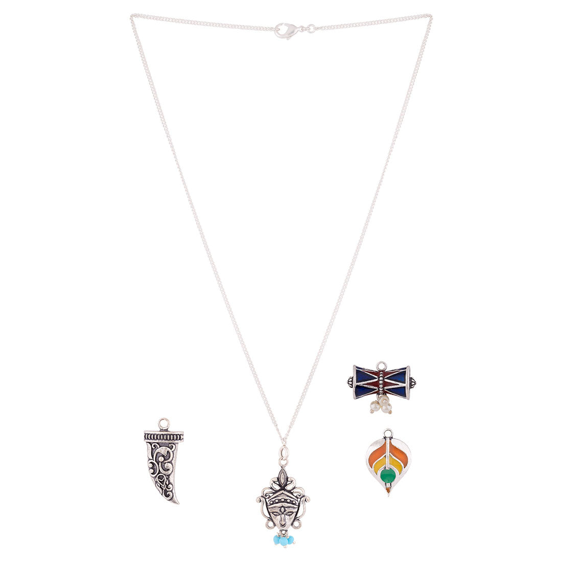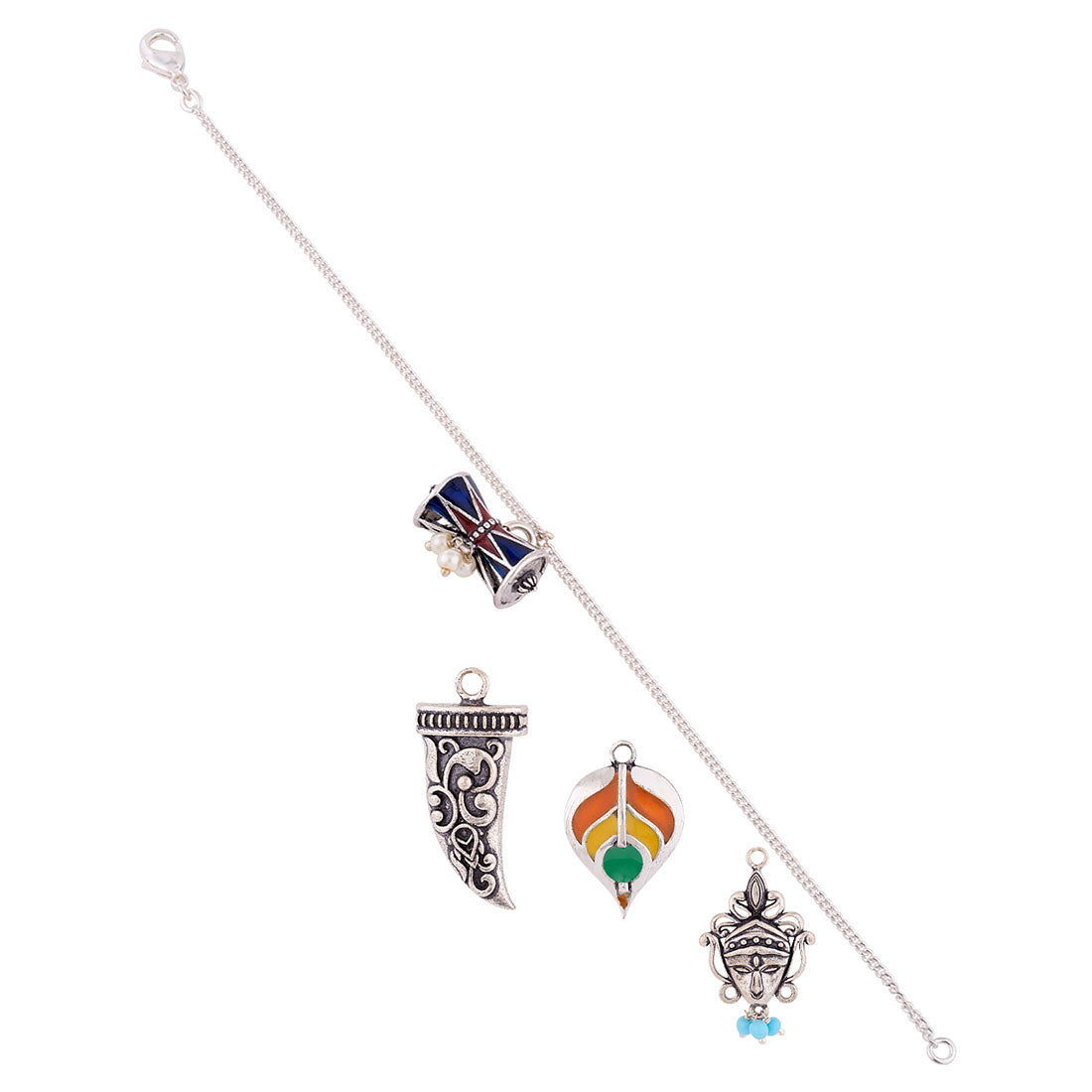 Mix-and-match combo with tribal inspired motifs. It has Earrings, Bracelet and Chain with multiple charms to give you a new look everyday. Made from brass and oxidized silver plated.
