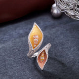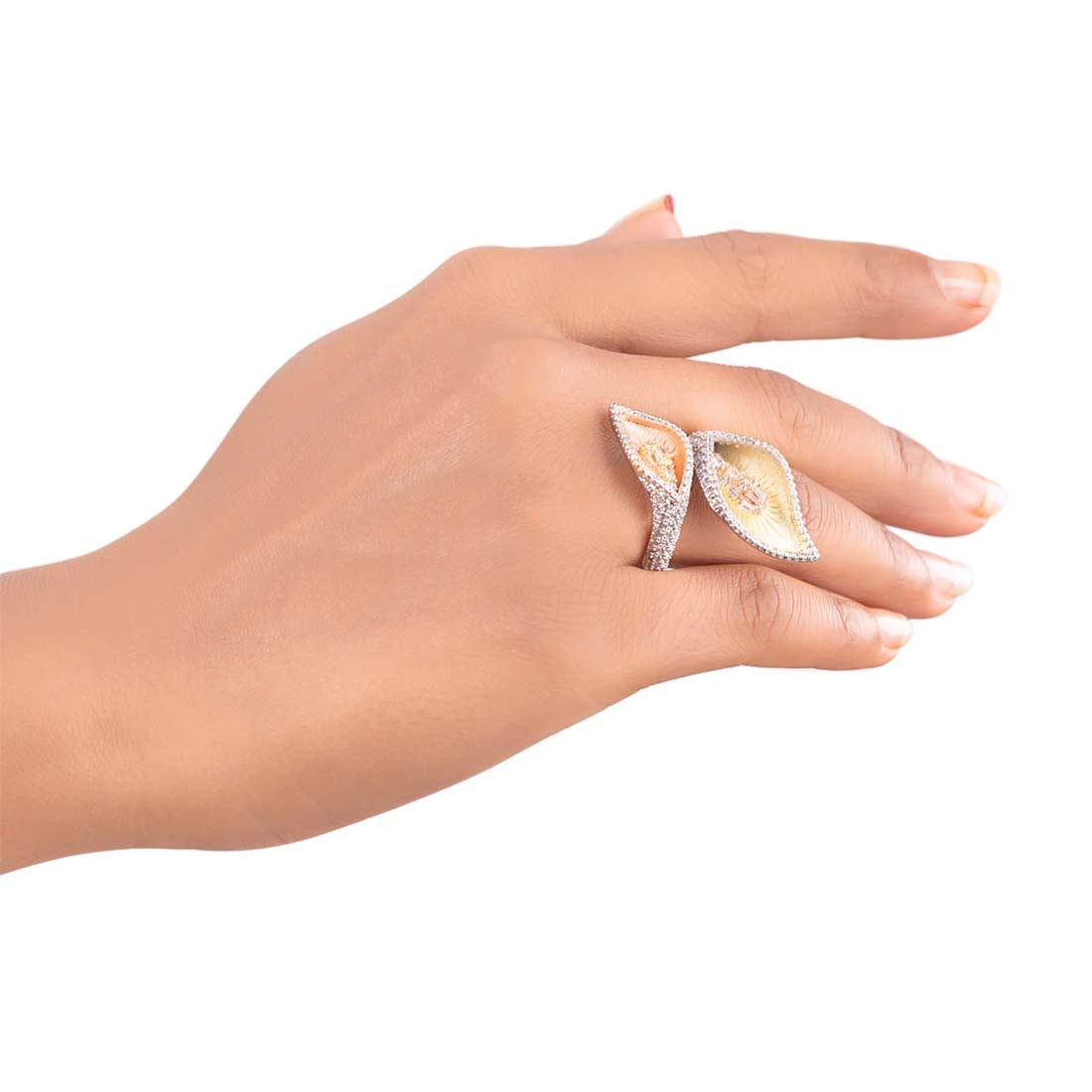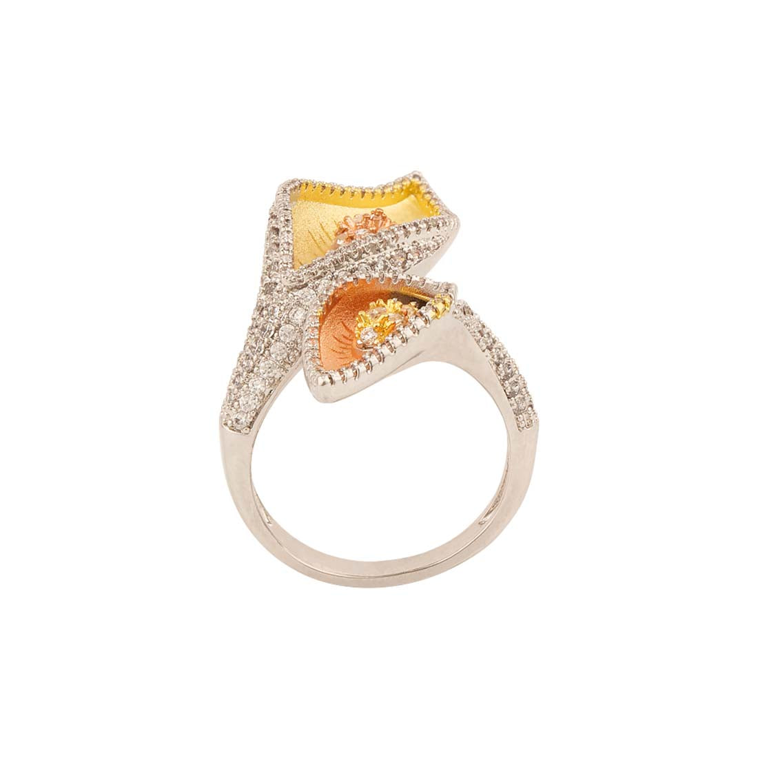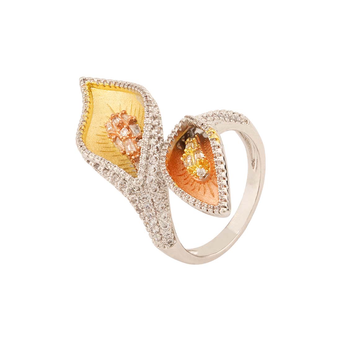 Leaves motifs ring made from brass. Gems embellished and three tone plated. Wear with formal attire.