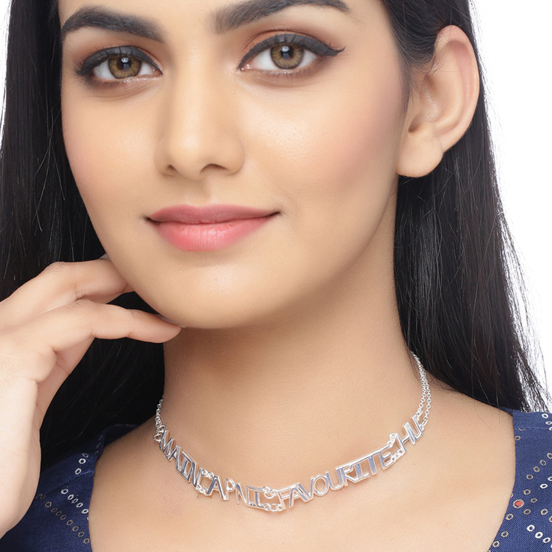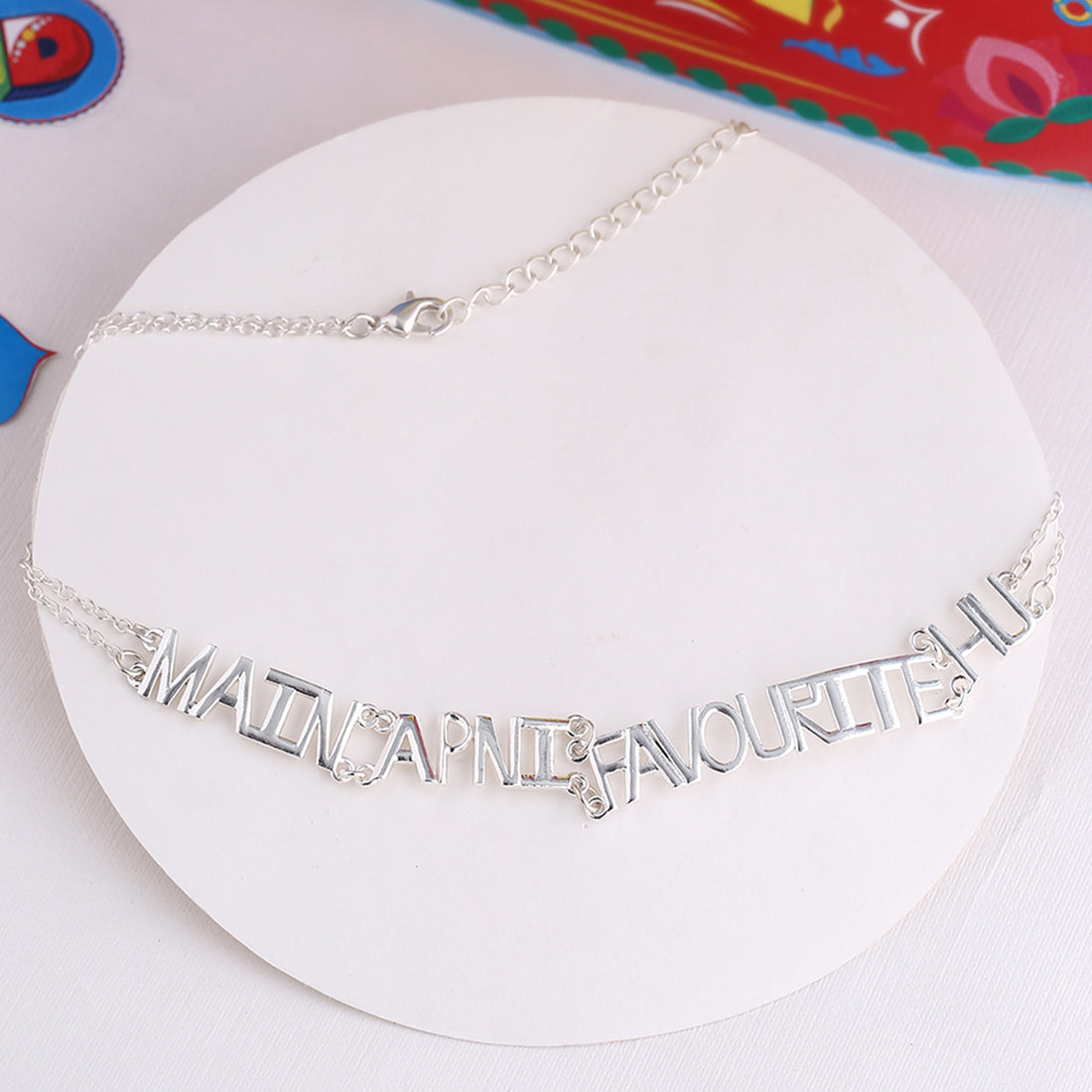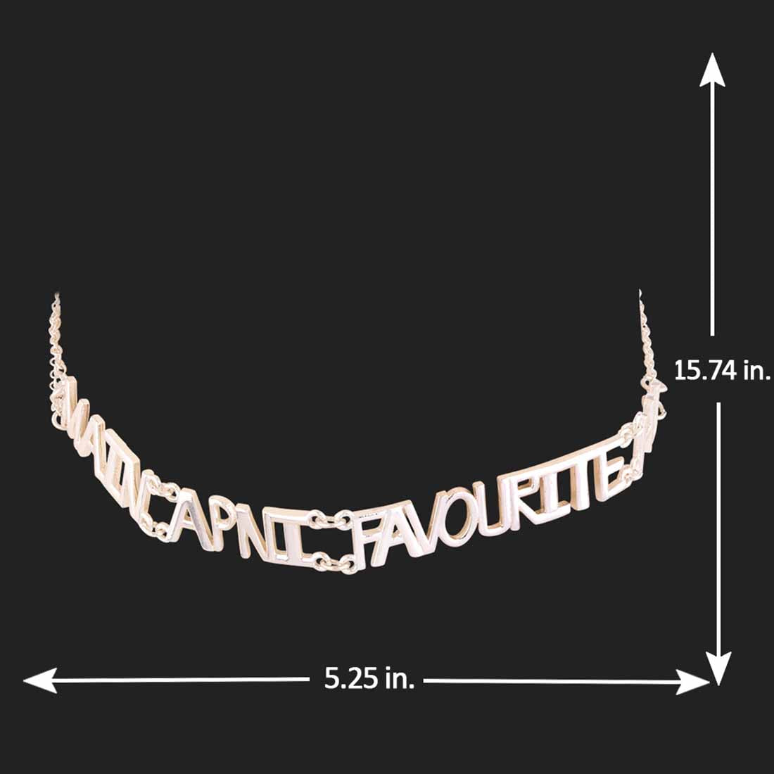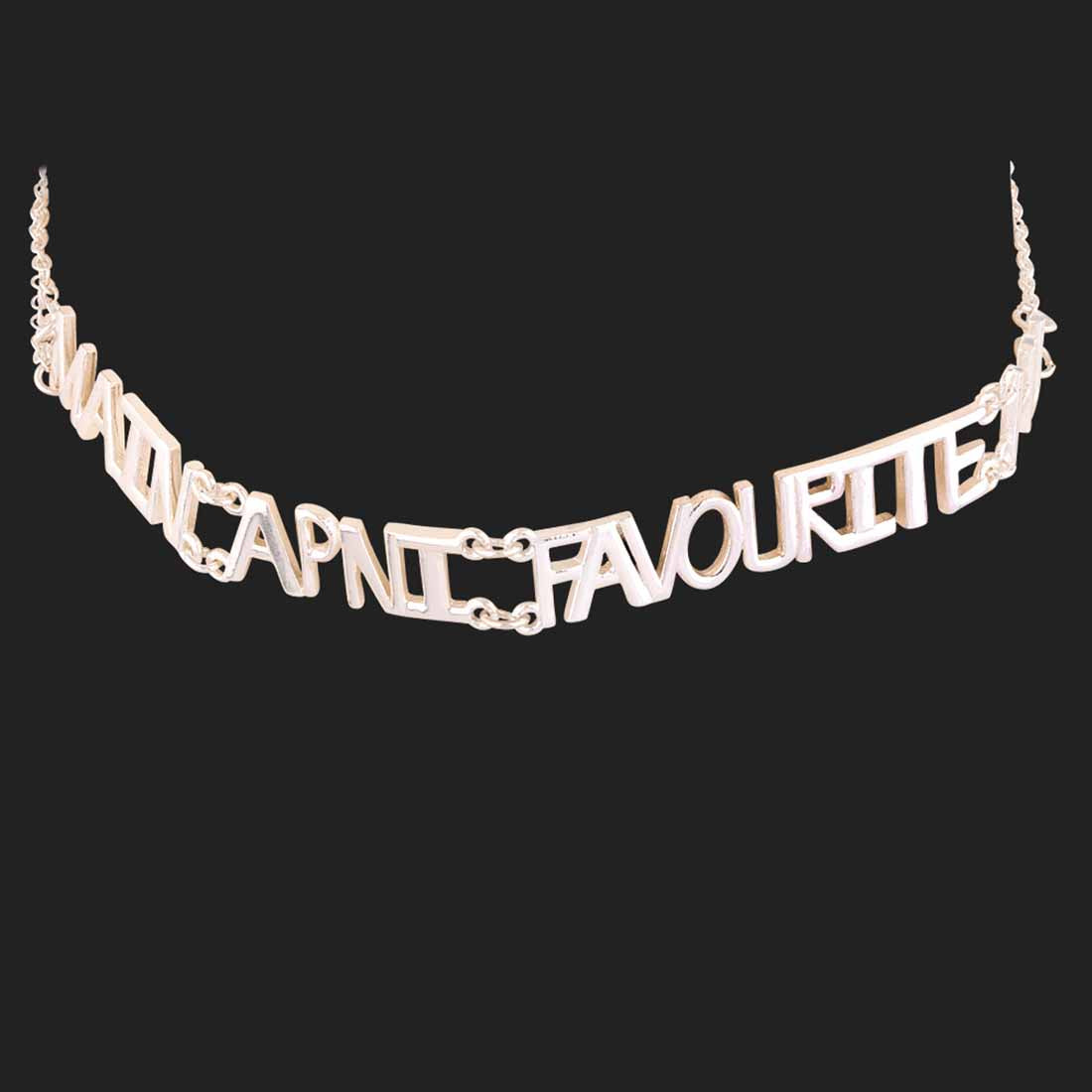 Brass necklace featuring 'Main Apni Favourite Hu' Bollywood lettering, inspired by filmy inscriptions found on Indian trucks. Silver plated and lightly embellished, the necklace features a lobster clasp closure. Pair with party attire.