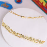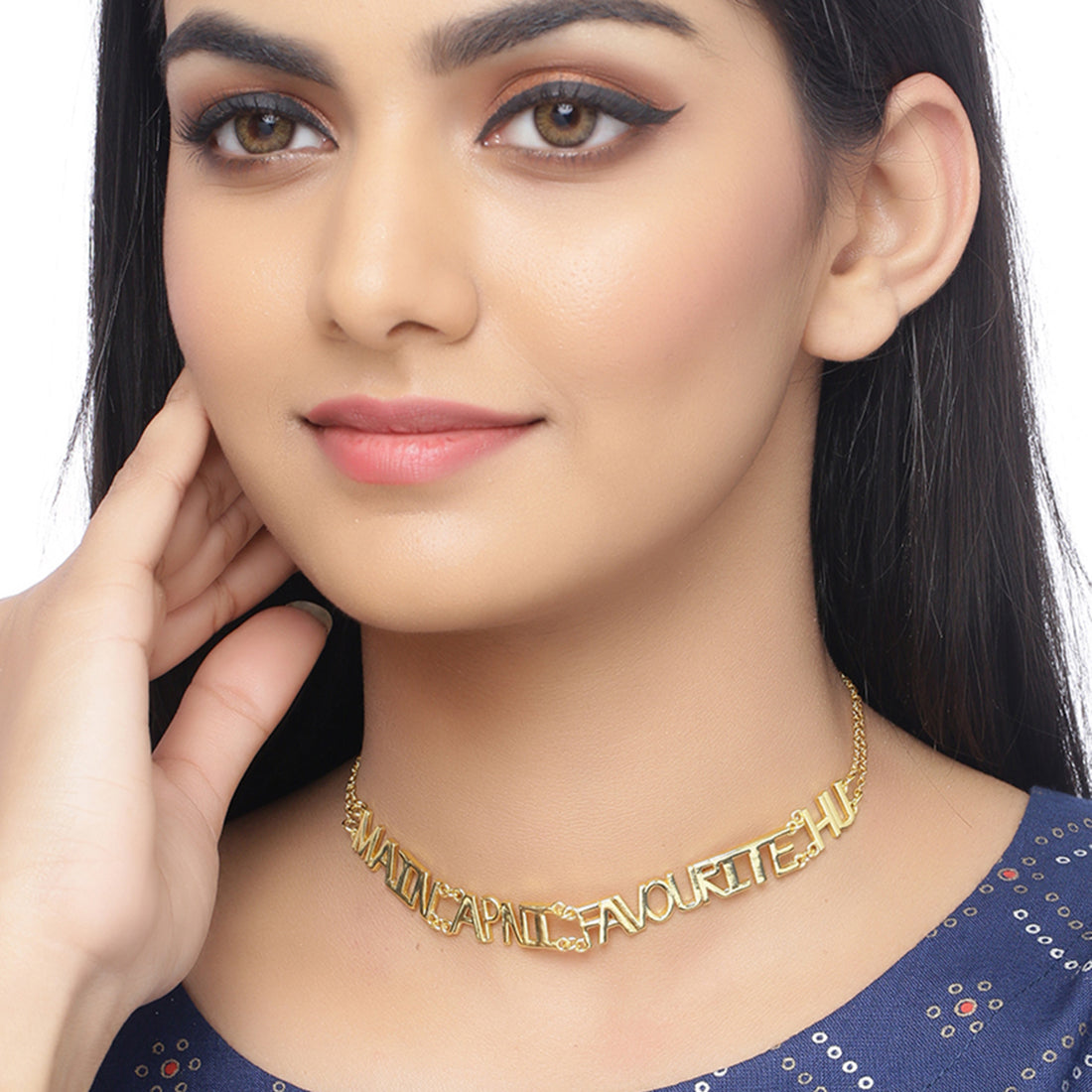 Main apni favourite hu' lettering necklace, inspired by the Bollywood-reference inscriptions popularly found on Indian trucks. Fashioned out of brass and yellow gold plated. Wear with a Bohemian dress.
