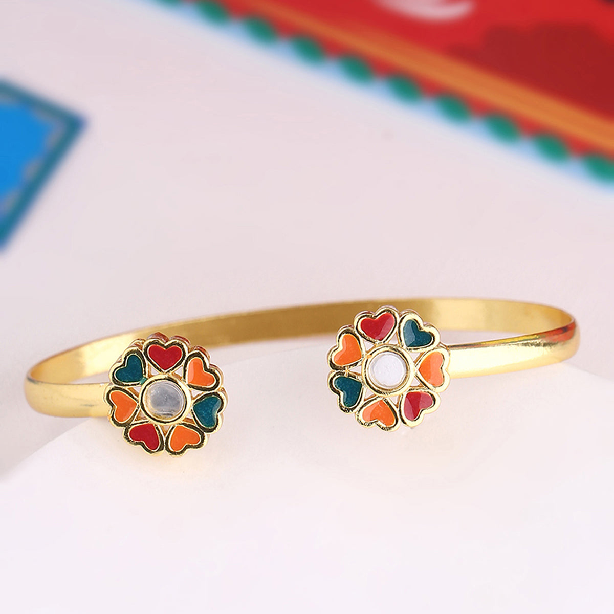 Motifs, art and designs popularly found on Indian trucks have inspired this rangoli motifs adorned brass cuff bracelet. Enameled and yellow gold plated, the adjustable cuff can be paired with a trendy saree or summer dress.