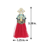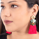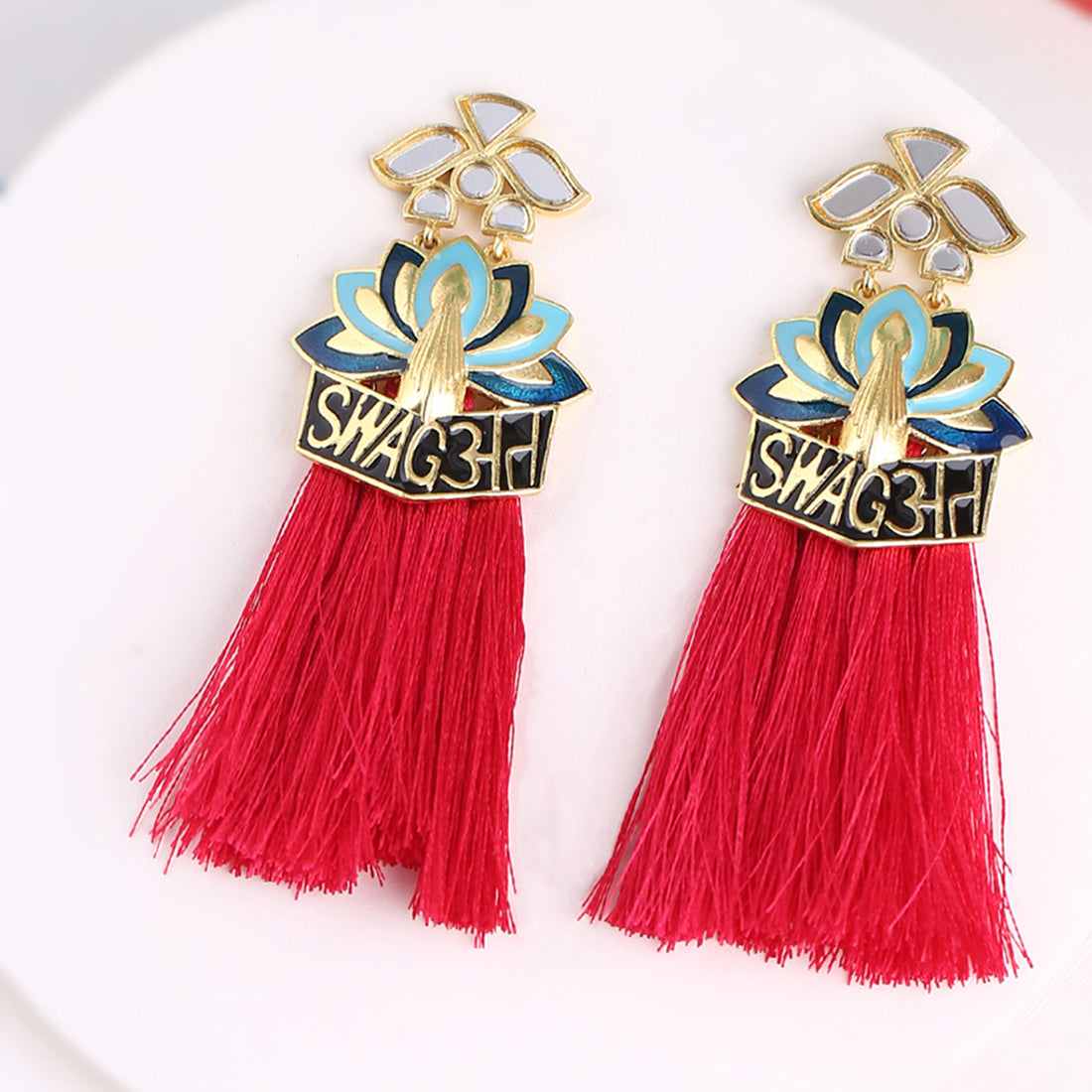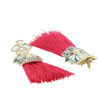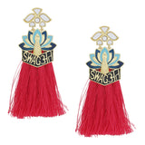 Trendy 'Swagat' inscription earrings, fashioned out of brass and inspired by the artistic and colourful Indian trucks. Yellow gold plated and enameled, the pair features tassels and can be paired with an Indo-Western dress.