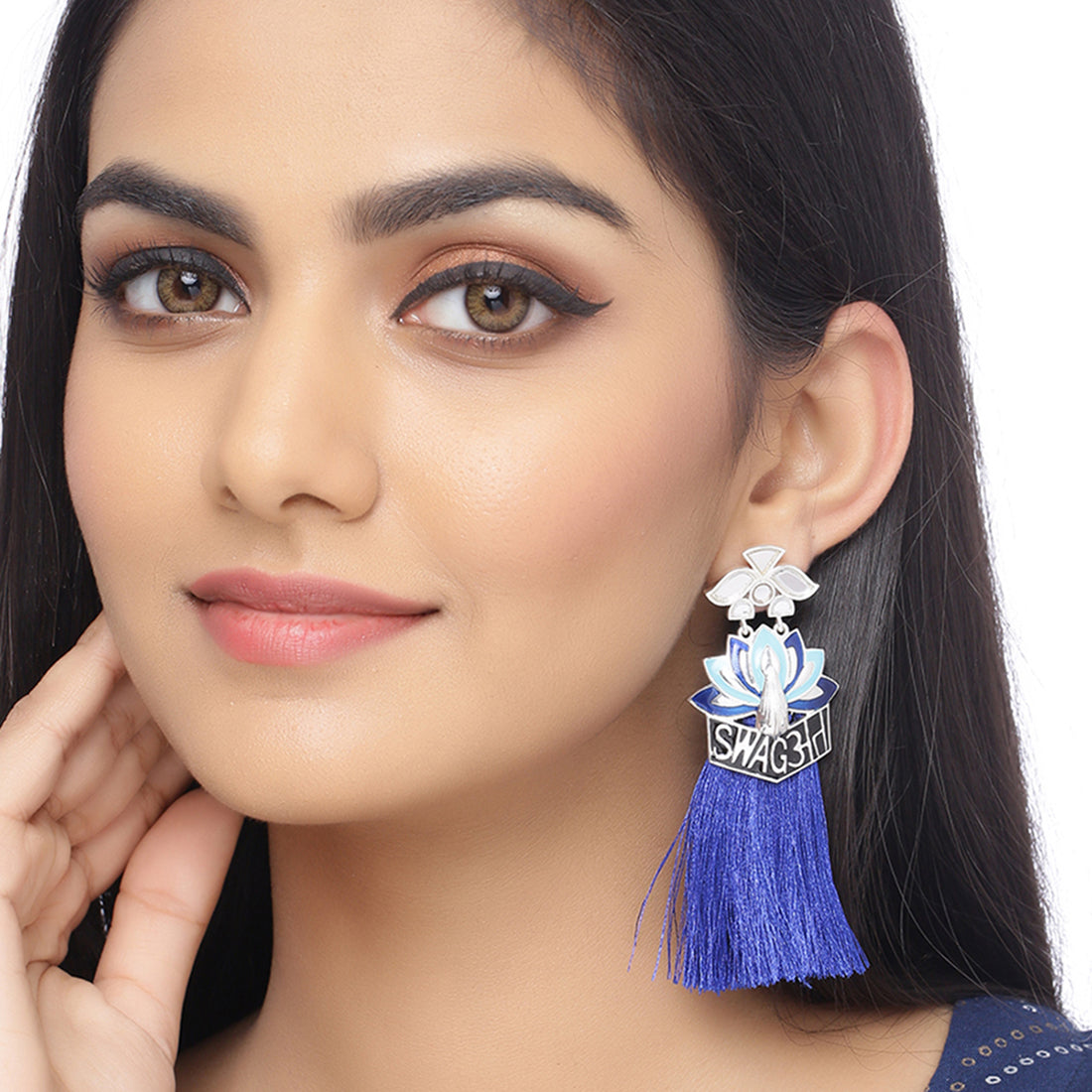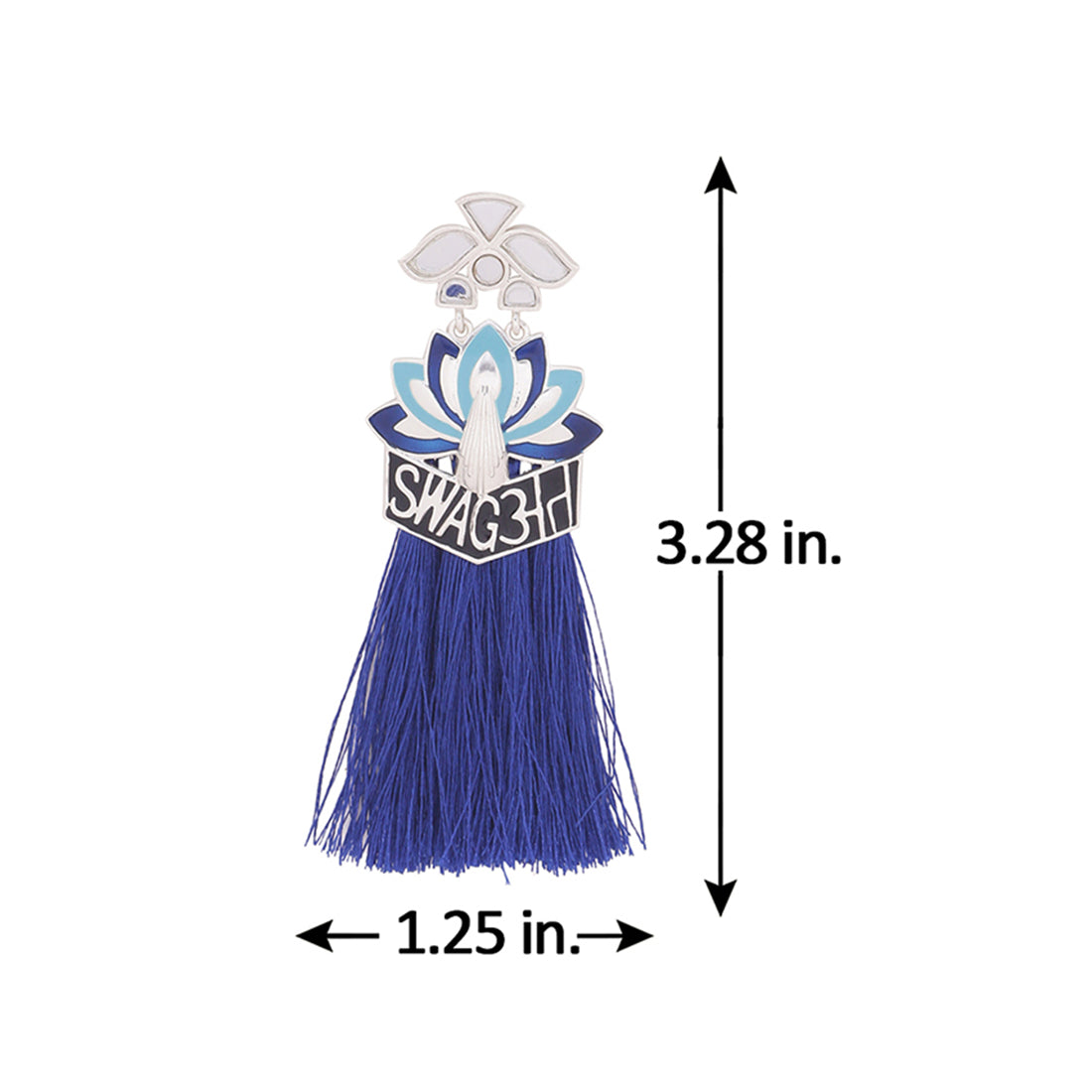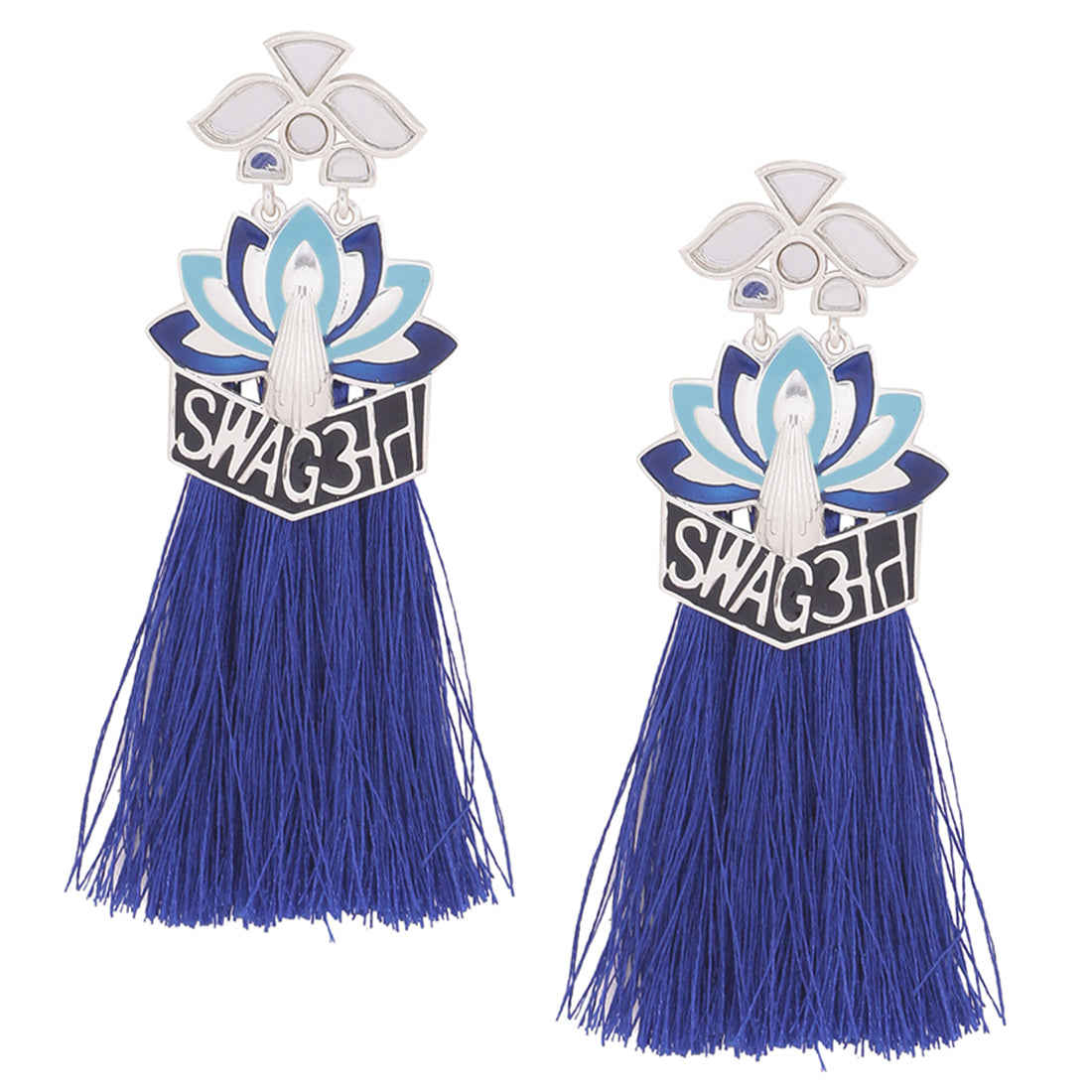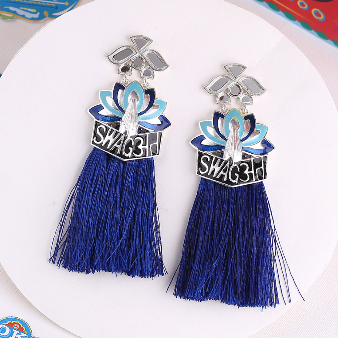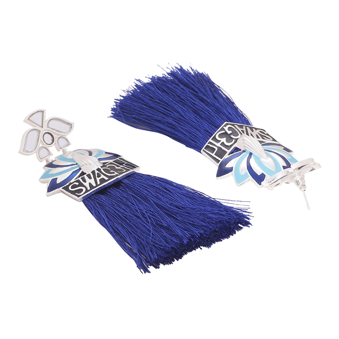 Enameled and mirror work embellished 'Swagat' earrings, featuring tassels and designed as a tribute to India's truck drivers and their beautiful vehicles. Fashioned out of brass and silver plated. Pair with ethnic and Indo-Western attire.