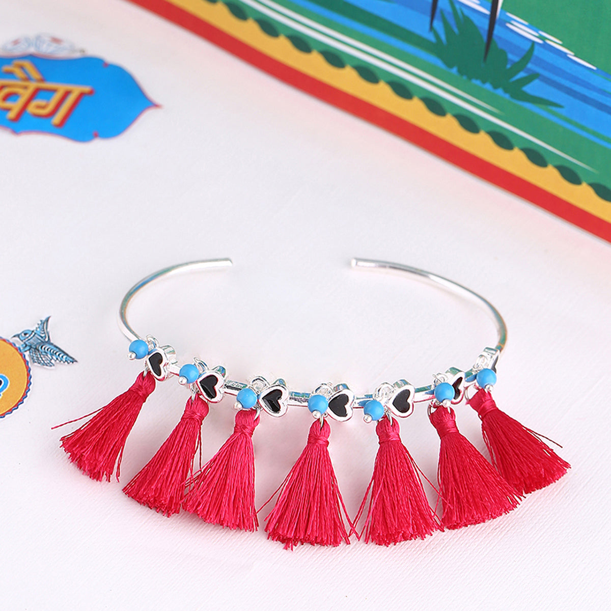 Popular motifs and designs on Indian trucks have inspired this brass cuff bracelet, which features colourful tassels. Enameled and silver plated. Perfect for formal ethnic and Indo-Western looks.