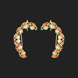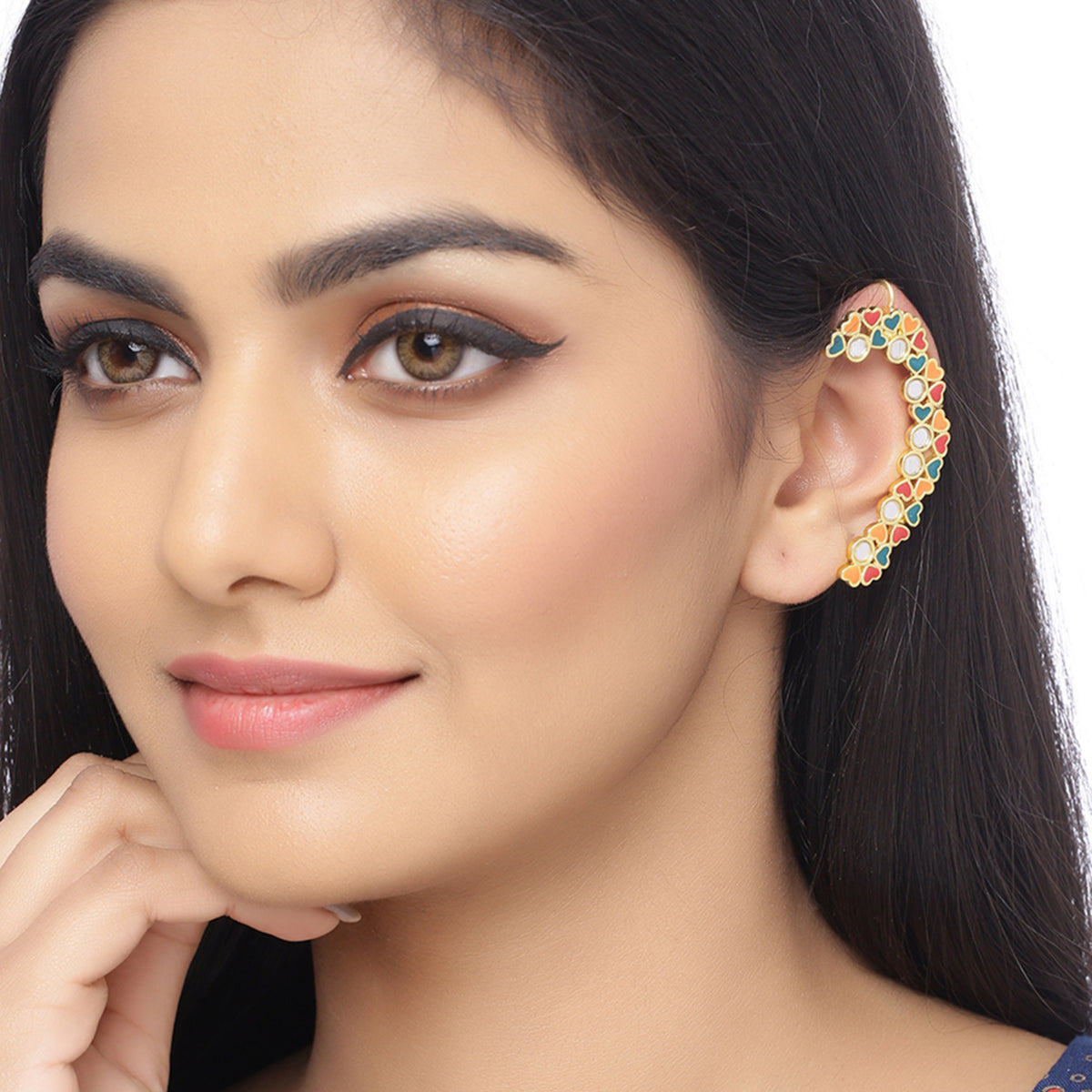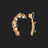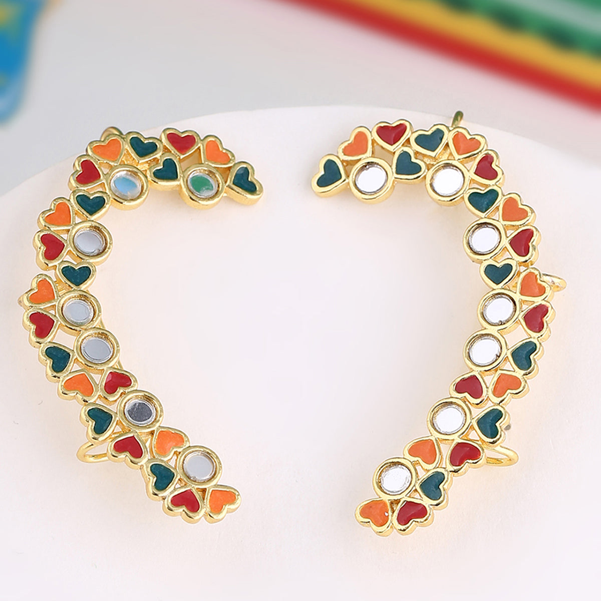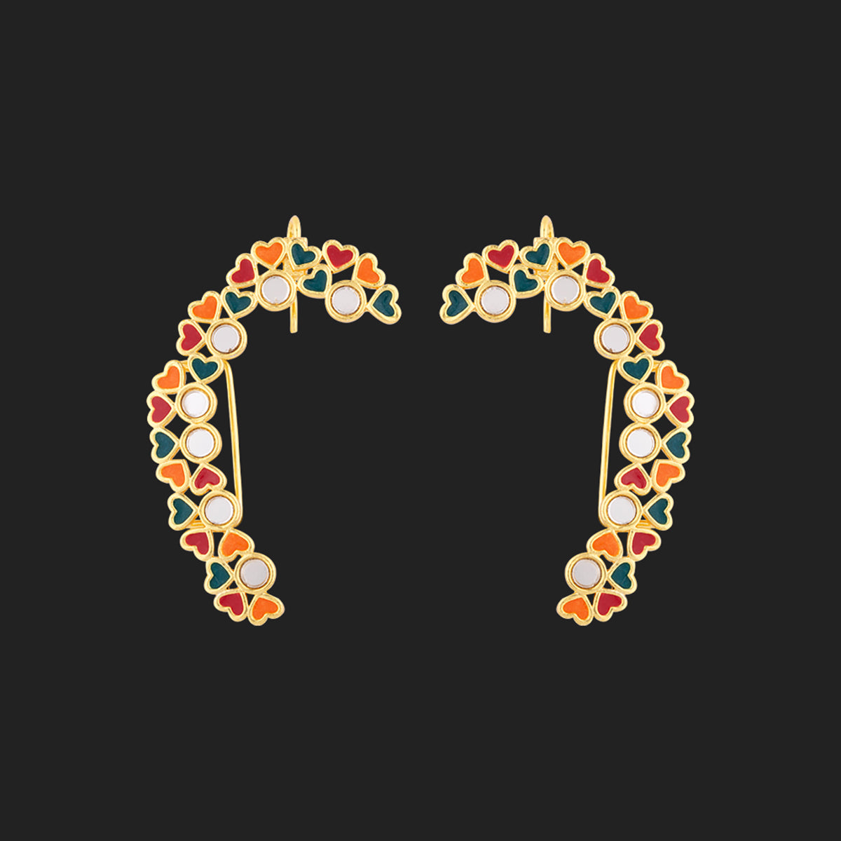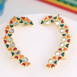 Motifs, colours and d?cor of Indian trucks has inspired these tiny hearts motifs adorned cuff style earrings, which have been fashioned out of brass and yellow gold plated. Wear the enameled earrings with a trendy saree.