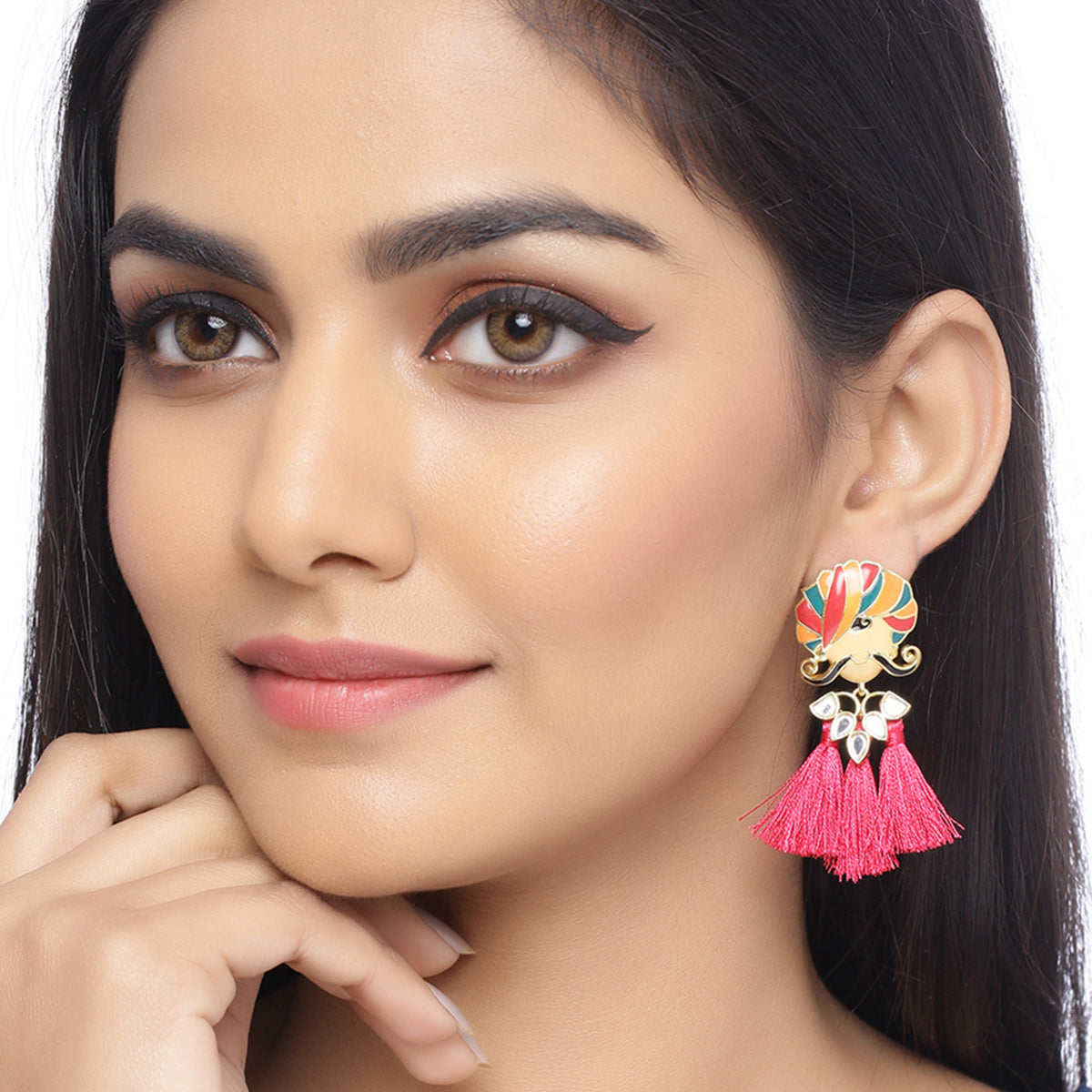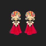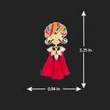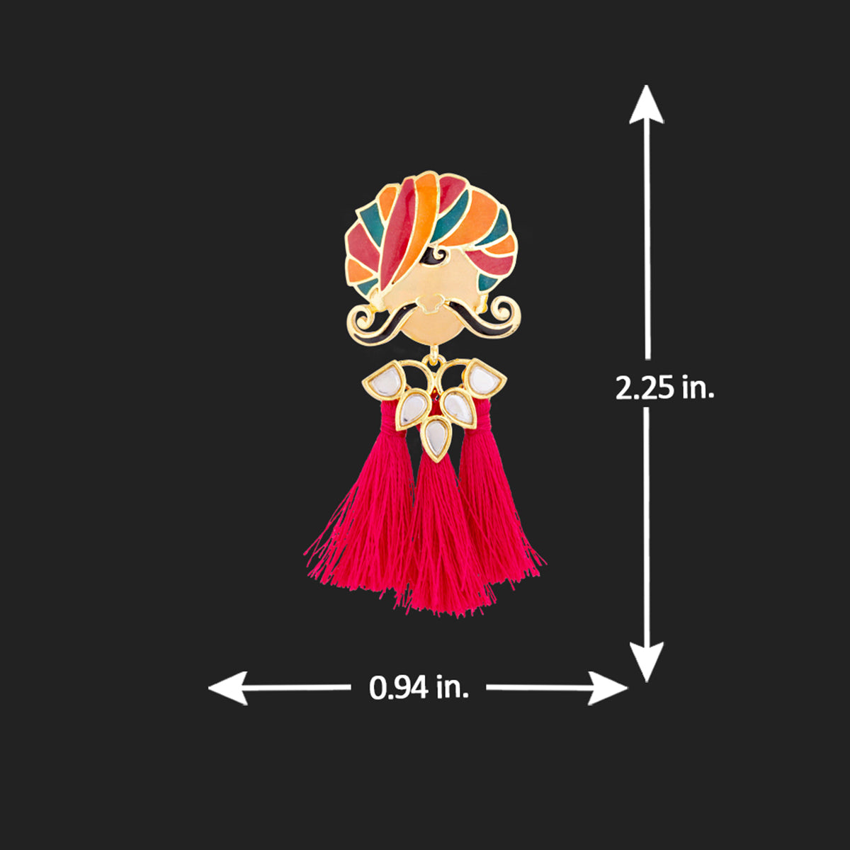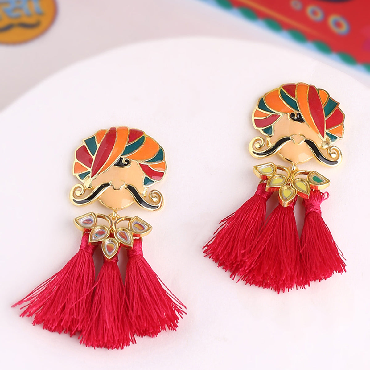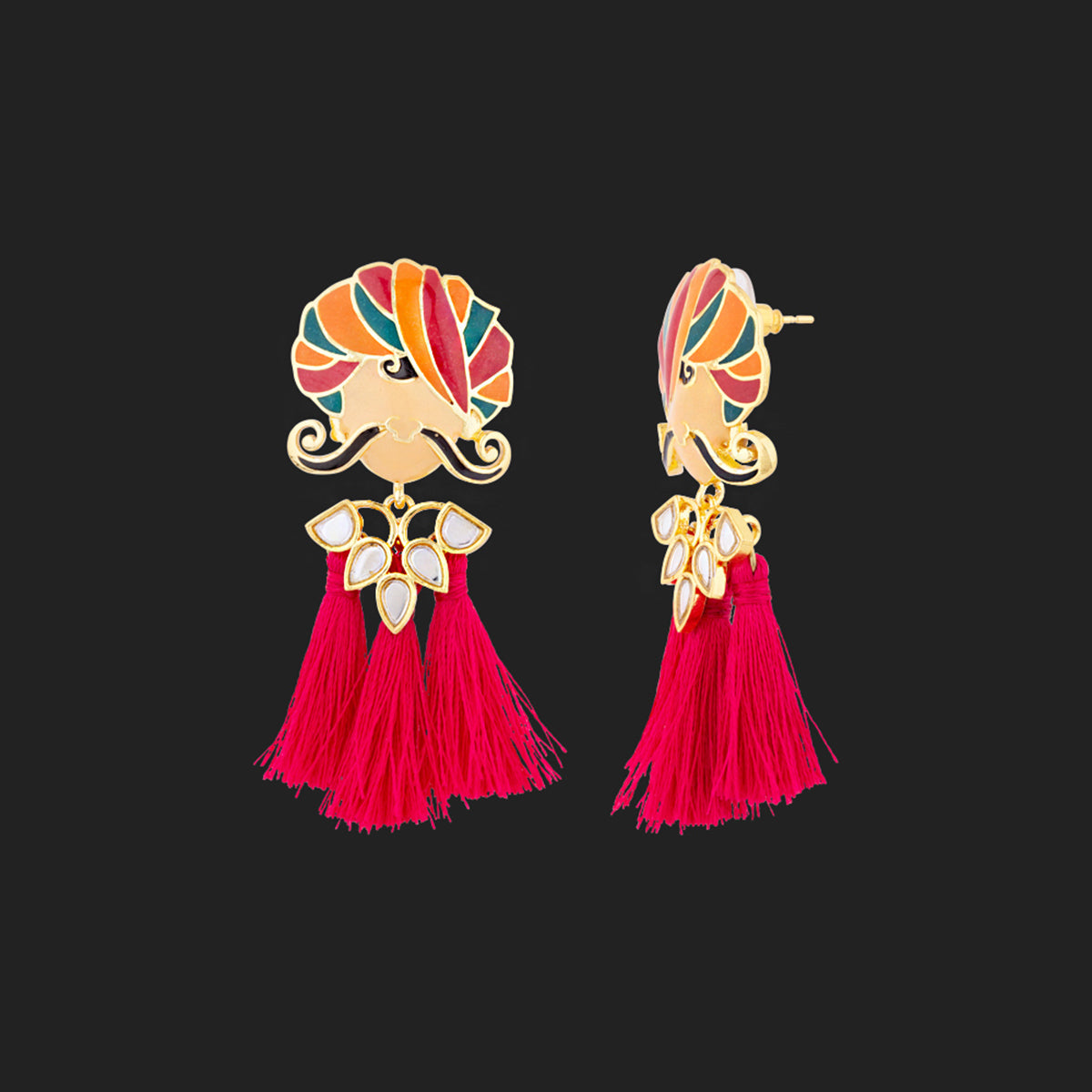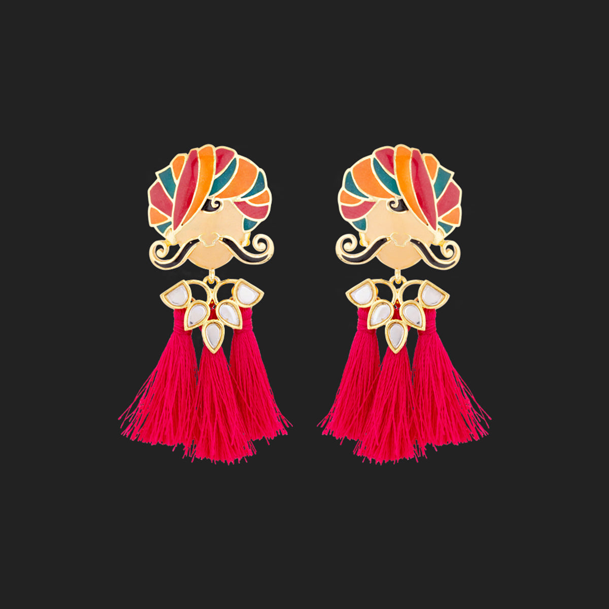 The colourful and artistic surfaces of Indian trucks and their motifs have inspired these turbaned man earrings, which feature tassels and have been fashioned out of brass. Enameled and yellow gold plated, the pair is lightweight, comfortable and versatile.