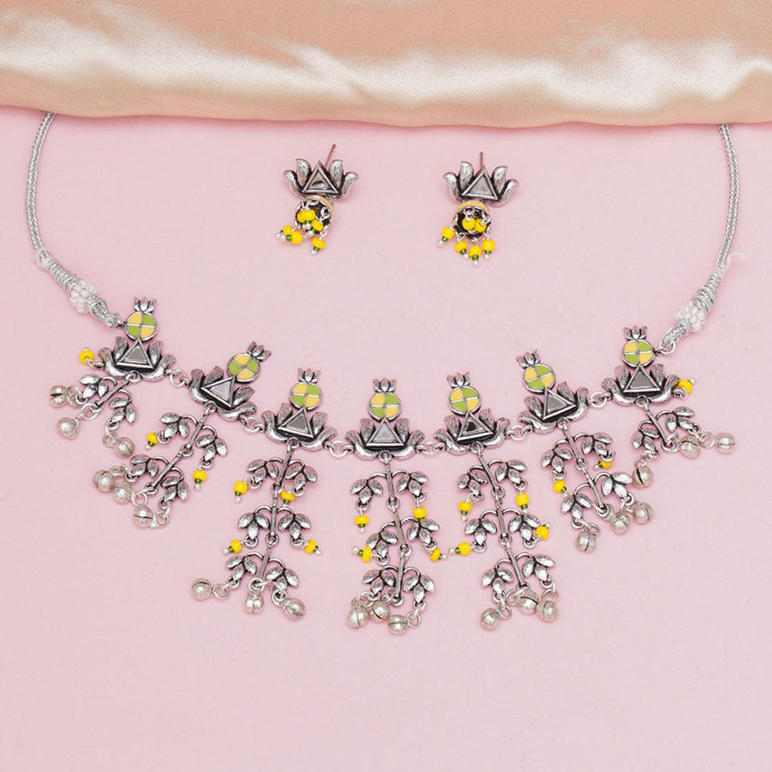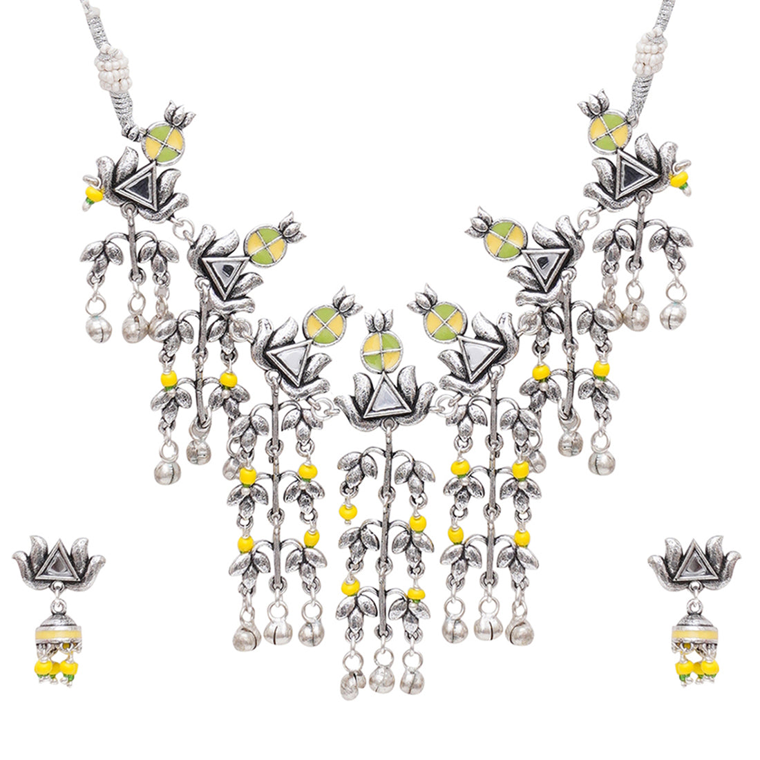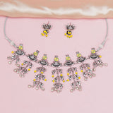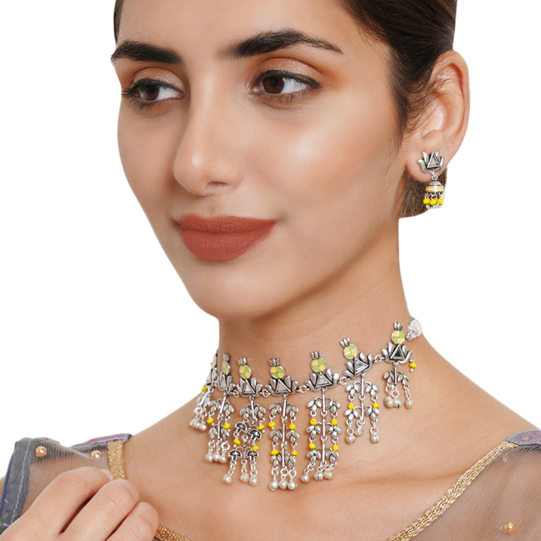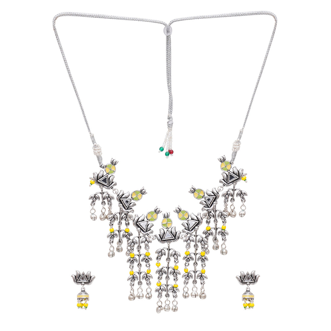 This vibrant and colourful?traditional style necklace?set?is an excellent example of exquisite and?fine craftsmanship. Set in a long-lasting?yellow gold plated base, the jewellery set is dressed in?flawless work?and studded with quality imitation beads which adds to the luxury of the necklace.
