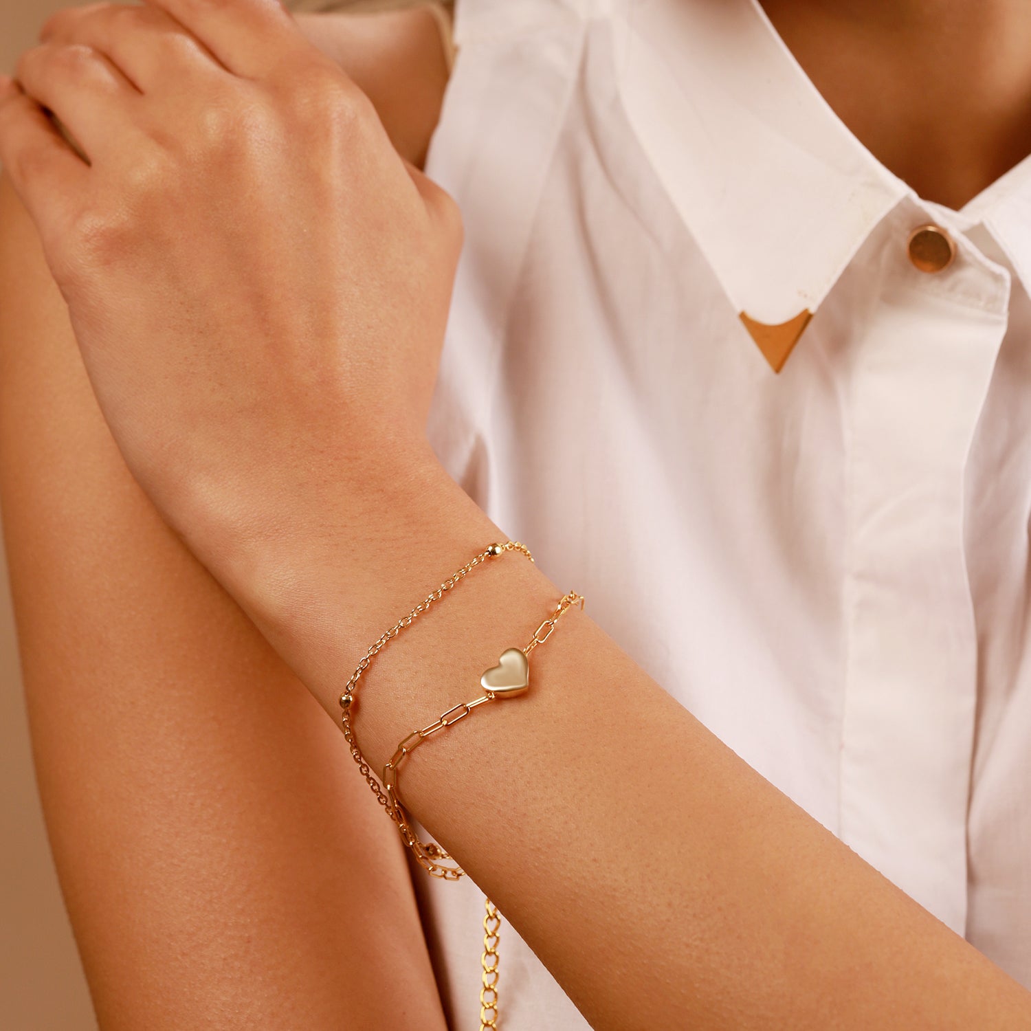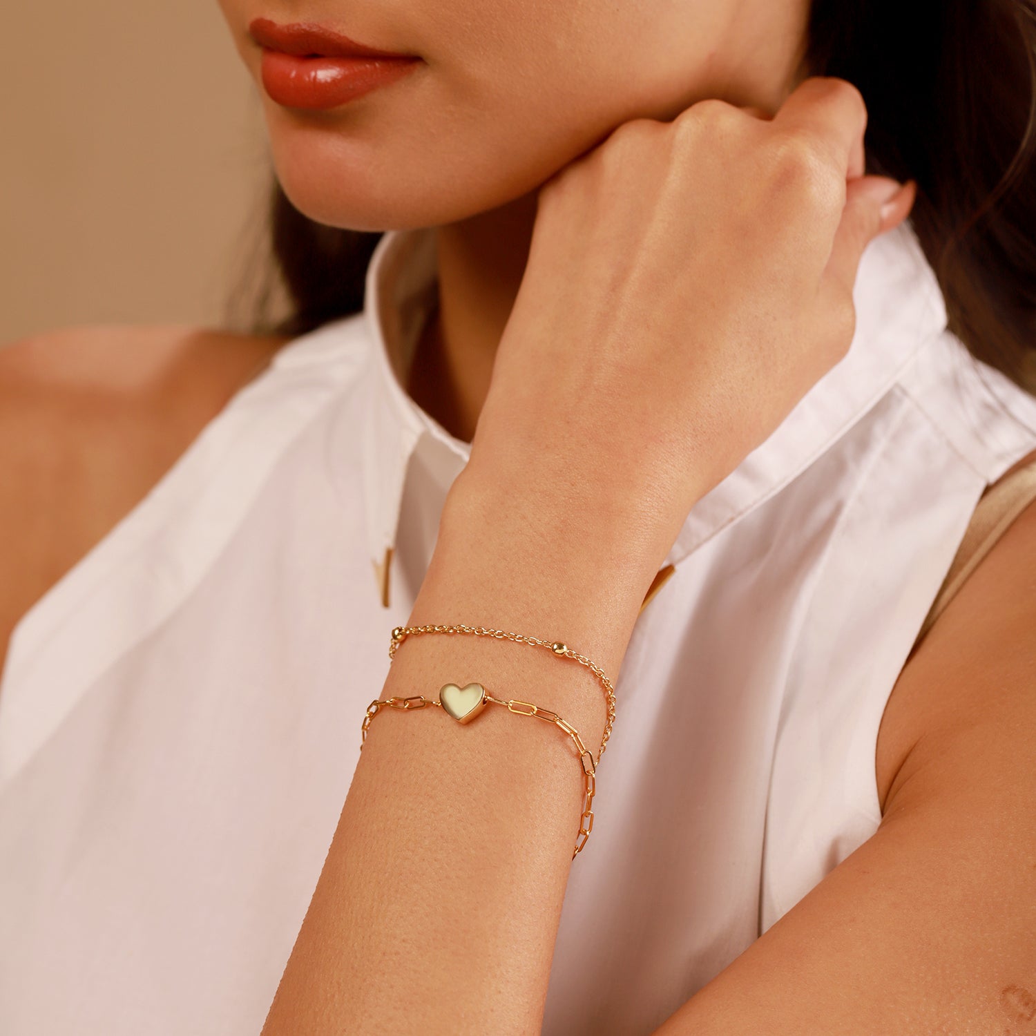 Elegant, lightweight and full of sentimental beauty, this Golden Heart Layered Chain Bracelet is part of our Valentines Day special collection celebrating romance, softness and emotional expression through jewellery. Featuring a smooth polished heart charm positioned at the center of a dual-layered bracelet chain, it represents love, appreciation and heartfelt affection in a graceful wearable form. The combination of paperclip chain links, small bead accents and delicate lower links brings depth and dimension to the design, offering a stylish layered look that instantly elevates any wrist. Made from high-quality brass and plated with radiant yellow gold, this bracelet delivers a rich golden shine with a premium finish, making it ideal for both everyday elegance and special occasion wear. Whether styled alone or layered with watches and slimmer bracelets, this piece blends effortlessly with western outfits, date night looks, celebratory ensembles and confident daily fashion. Perfect as a meaningful gift or a personal reminder of love and self-worth.