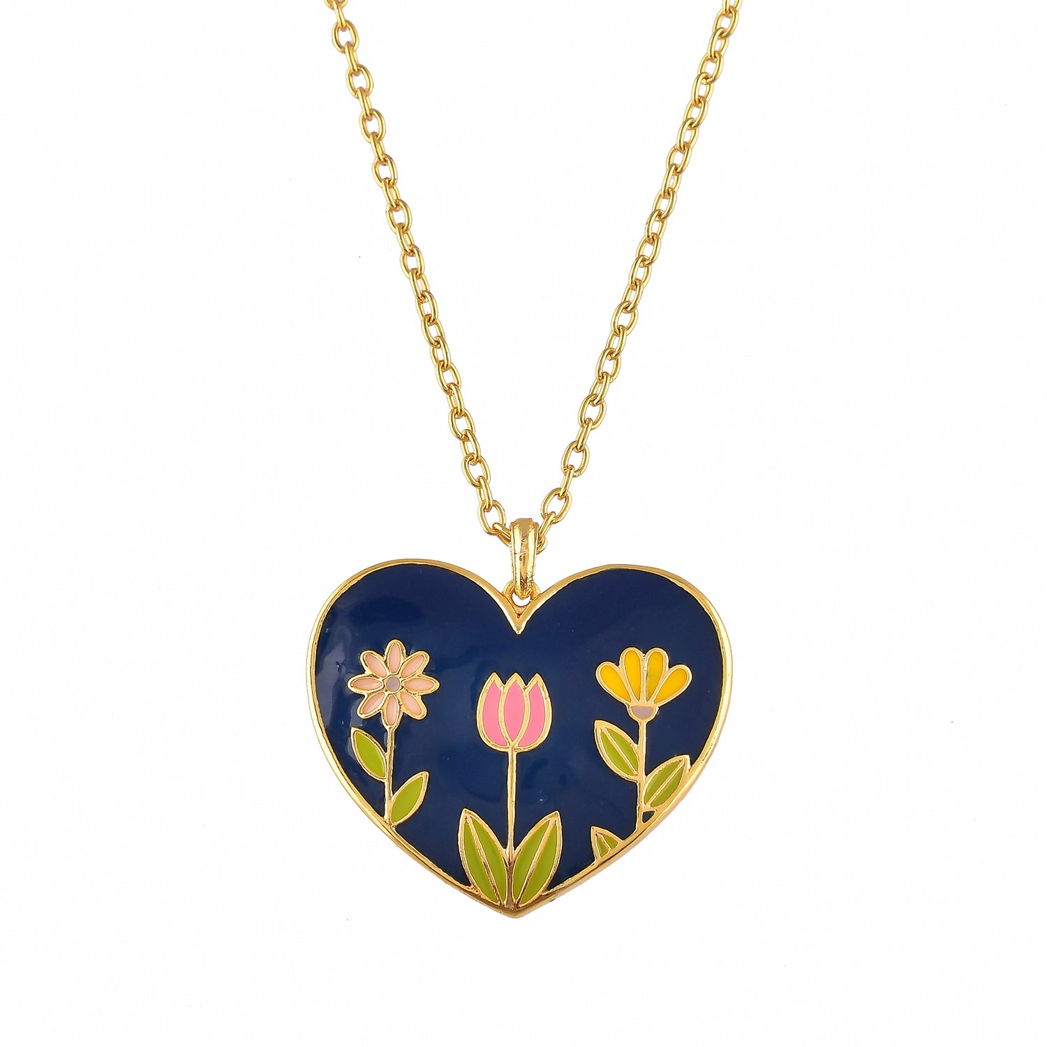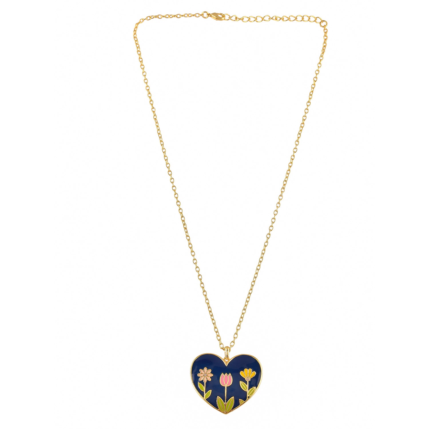 A beautiful blue enamel heart shaped pendant with tiny floral motifs that add to its charm. Made from brass and gold plated, the pendant comes with a gold plated link chain and will make the perfect V-Day gift.