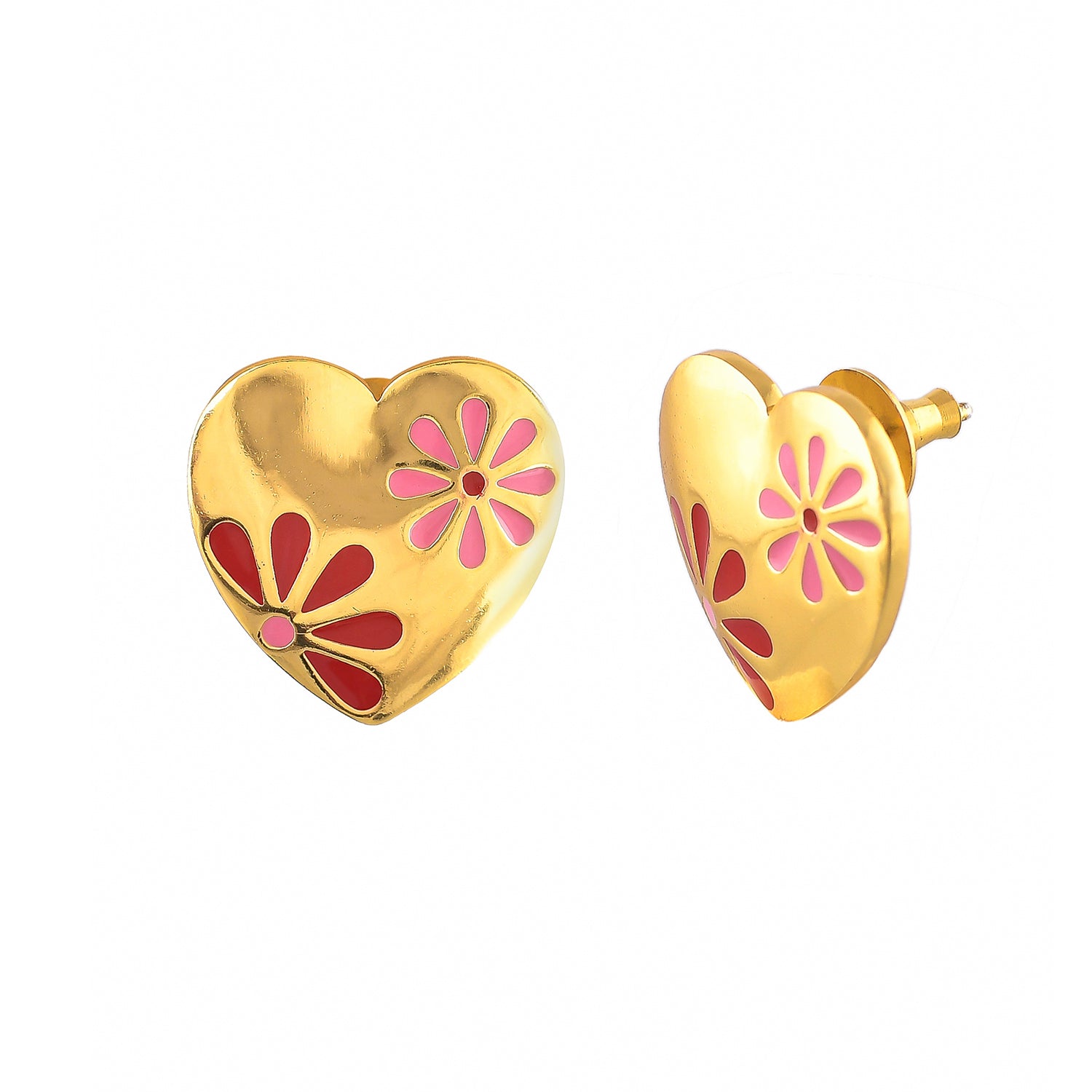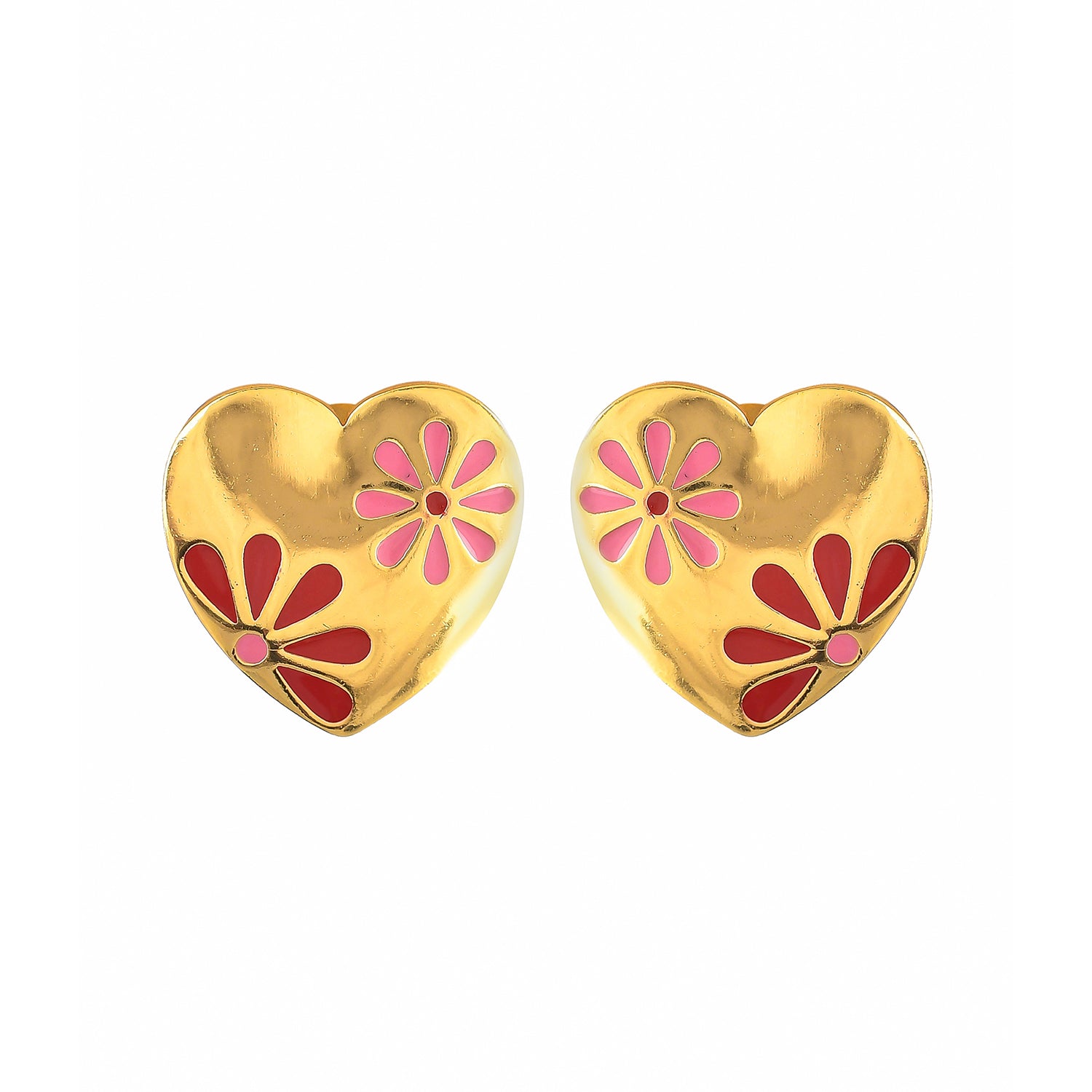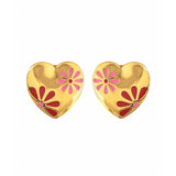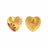 Yellow gold plated stud earrings in a lovely heart shape, made from brass and featuring enamelled floral motifs. Embellished with tiny CZ gemstones, the studs are perfect for V-Day gifting and wearing.