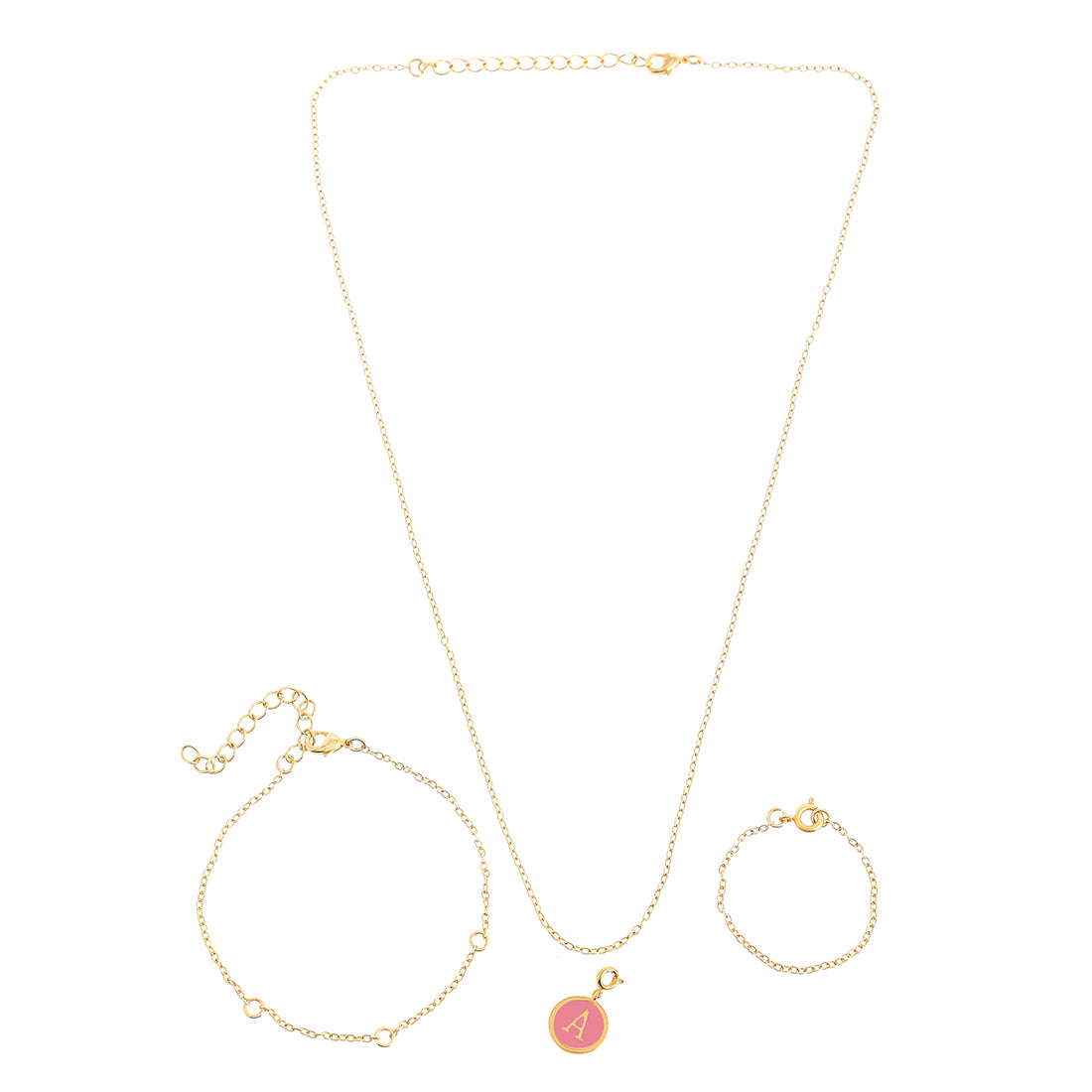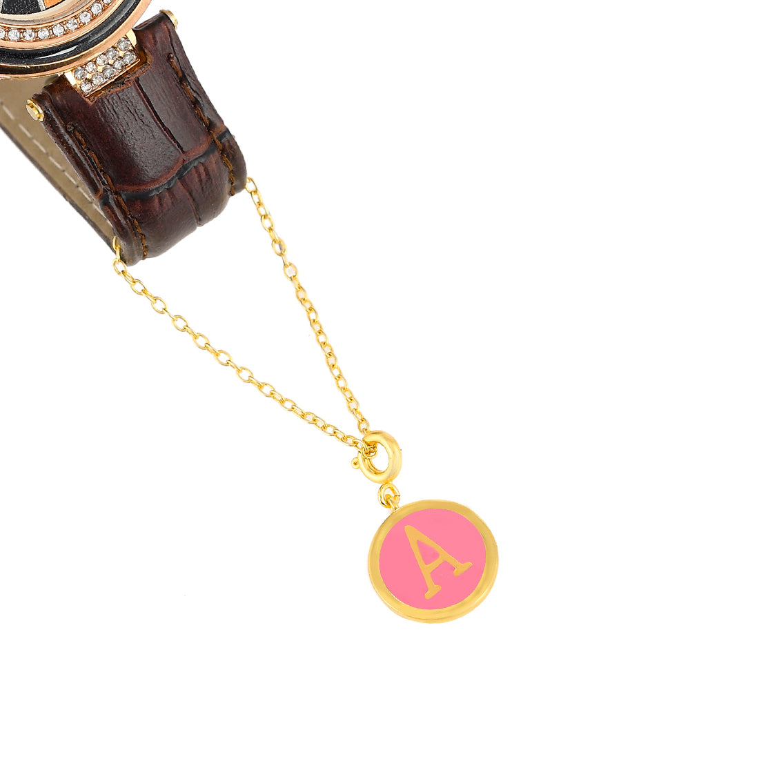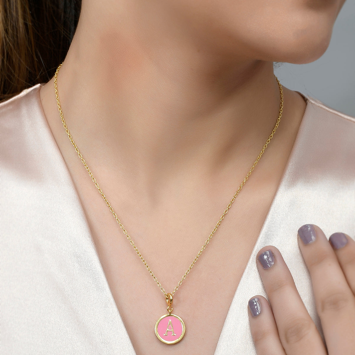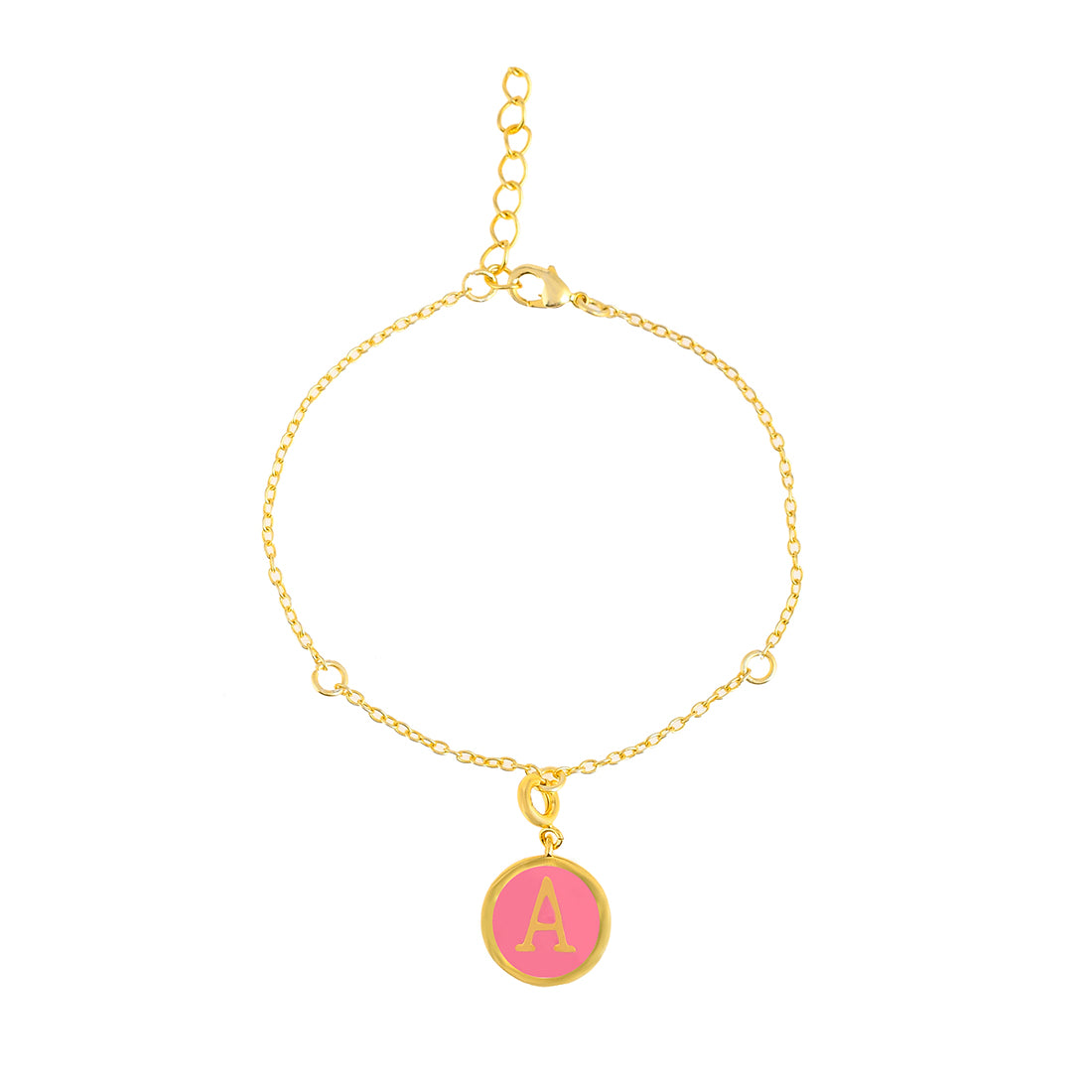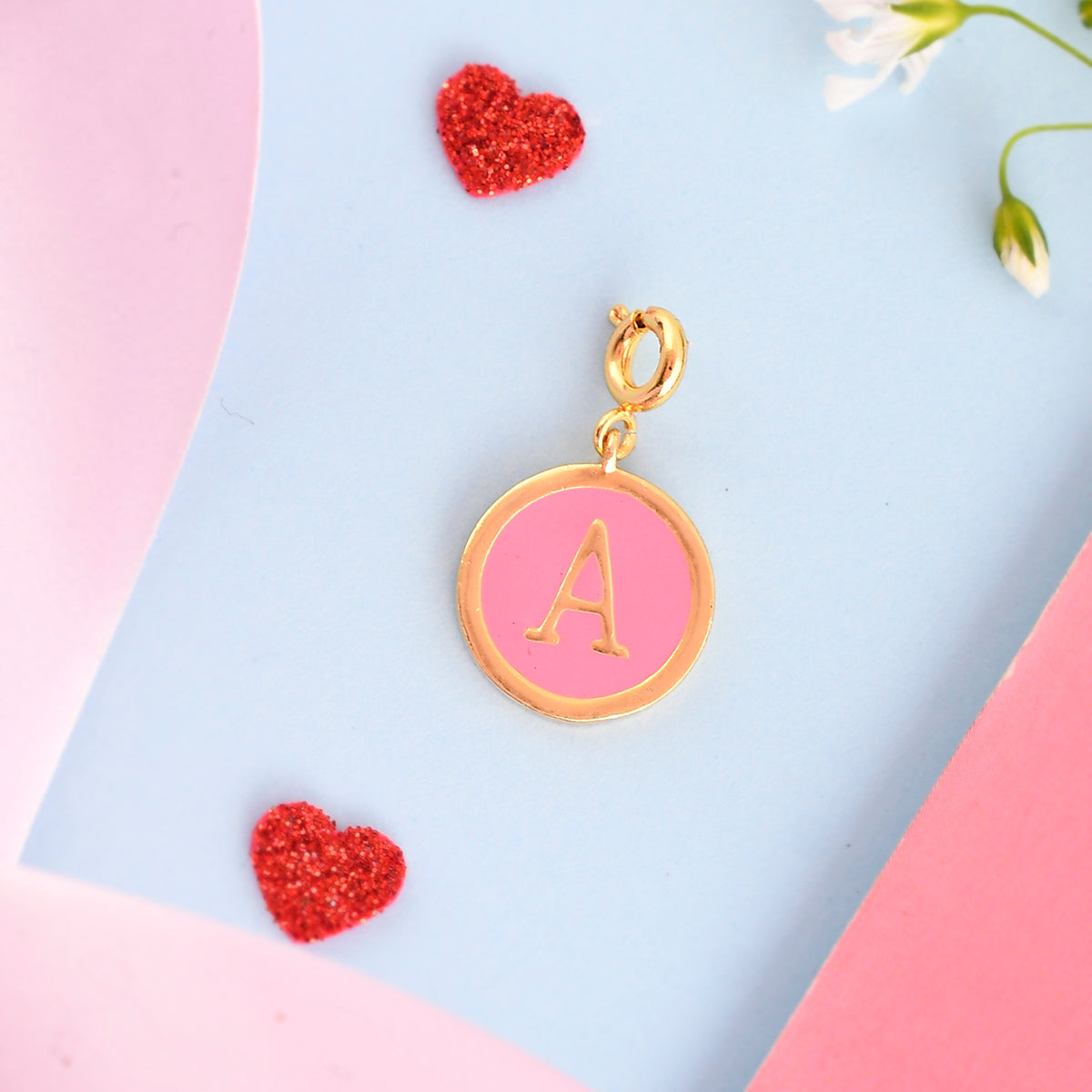 Alphabet A charm with pink enamel details. Made from brass and gold plated. A good gifting option and can be paired with watches and bracelets