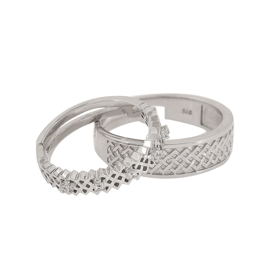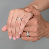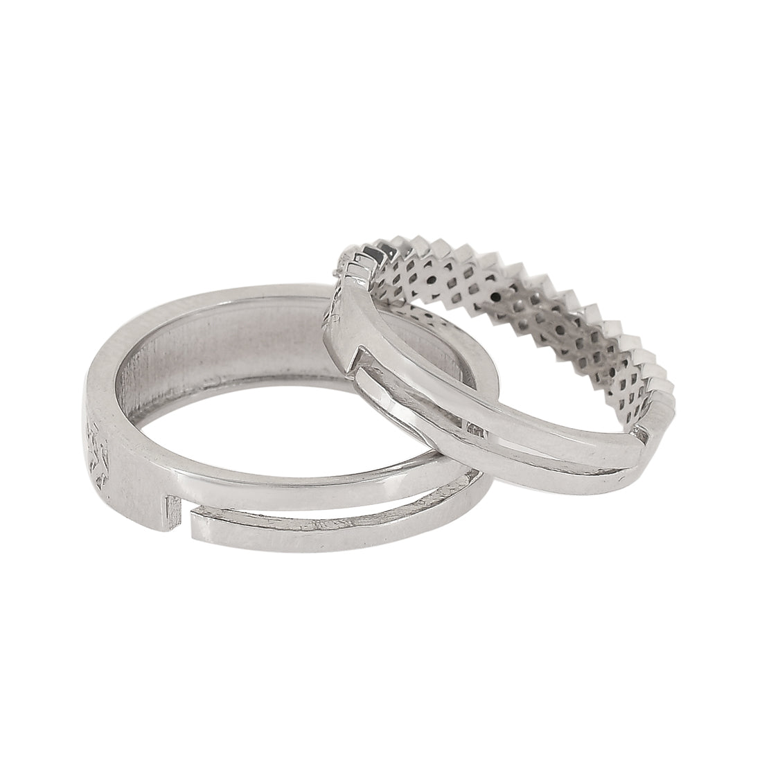 Zirconia gemstones adorned white rhodium plated couple band rings, crafted from 925 sterling silver. The rings are versatile, lightweight and perfect for the special occasion of Valentine's Day.