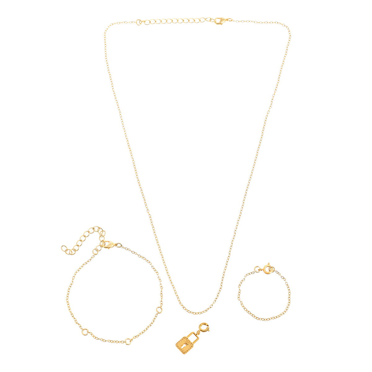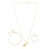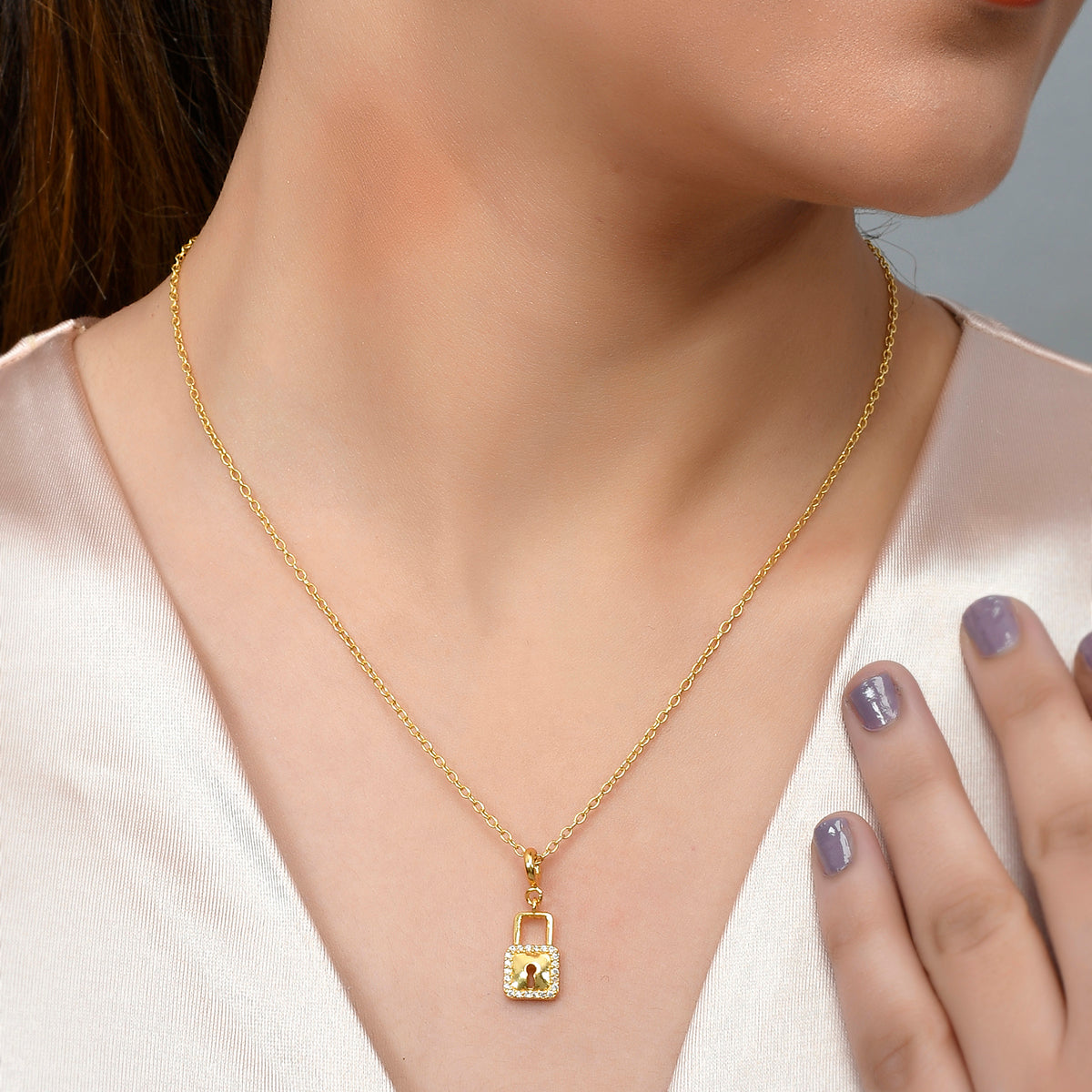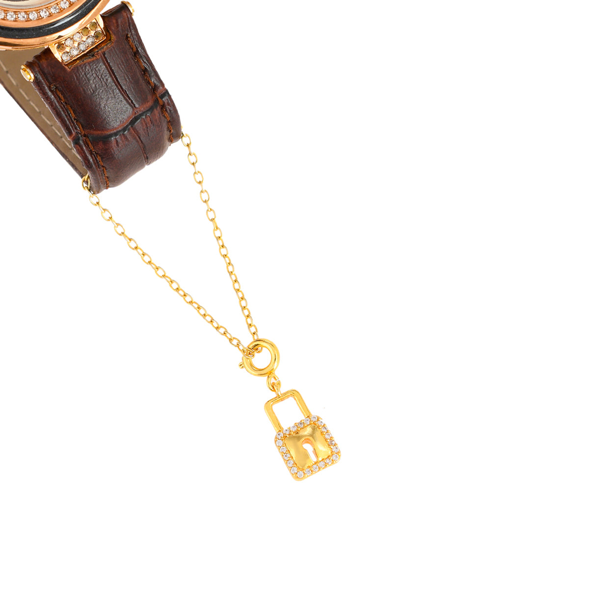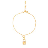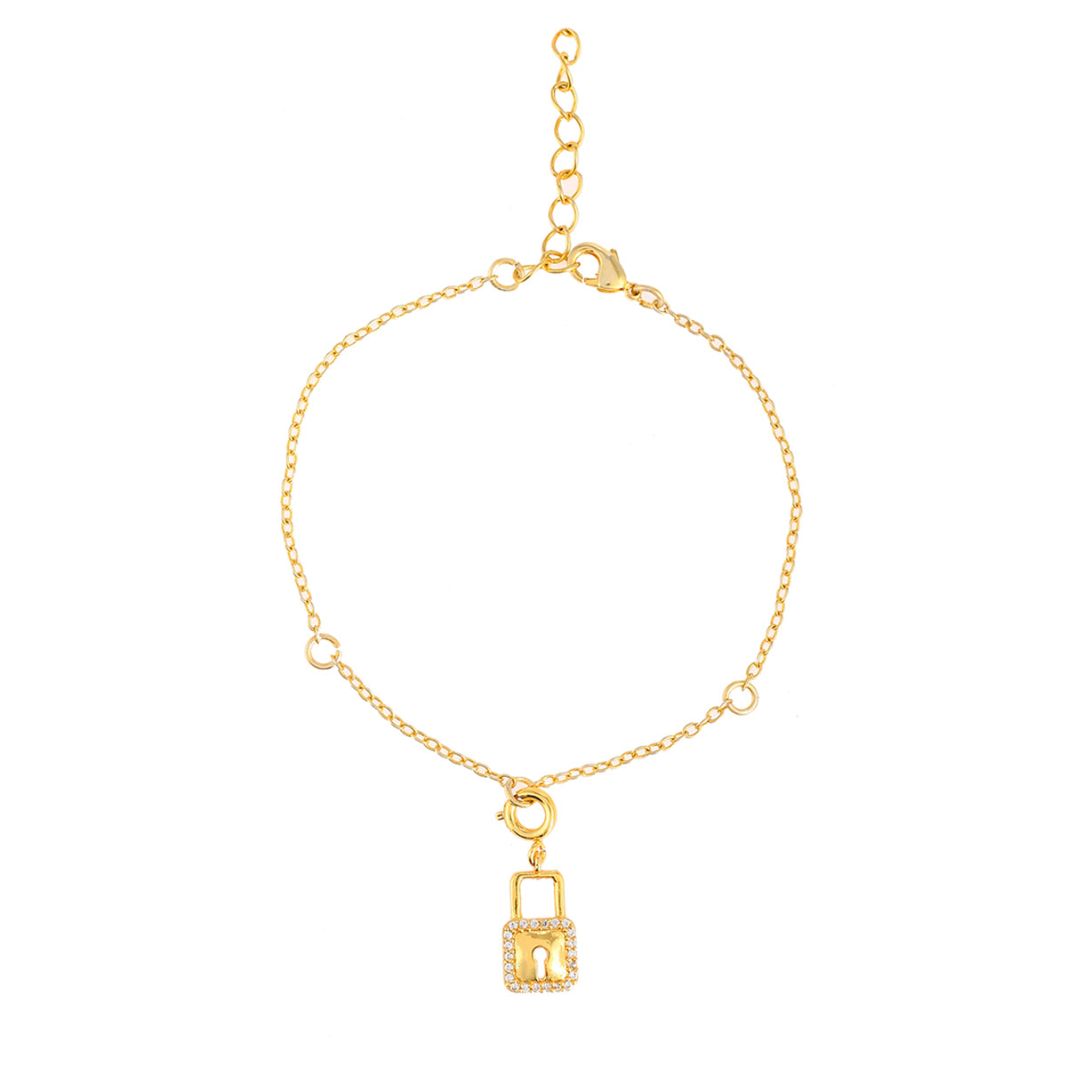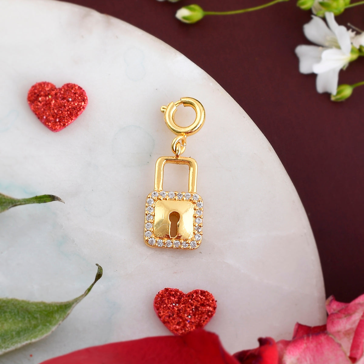 CZ gems adorned lock shaped charm with yellow gold plating. The brass charm can be added to bracelets and watches.
